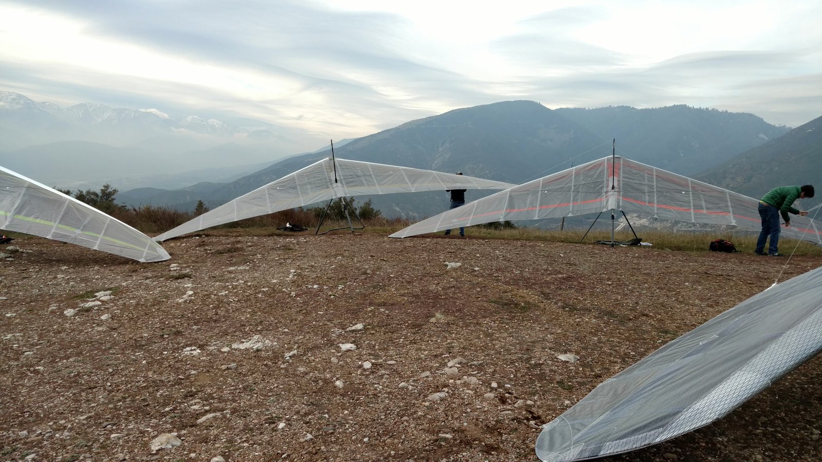 Good. New higher sprog settings, 66.5 out, 66 in. TT to 26 MPH, light PP, good PP VdVGT (55 MPH). Scratched close below cloud Peak for many circles. Finally got above Anna thermal turned on around 4,100 MSL. Saw 900 FPM briefly. Got to 4,800. Good speed runs. String spin near Last Chance, let the bar in abruptly and it dropped the nose petty sharply. Should be interesting on the GoPro. Did a wingover and the and pushed out firmly. Heard a pop/rip sound - after landing I found the right 5,6,7 battens had popped loose. Didn't feel a turn. Landed near the HG cone after a straight west final. It had been NW for a few seconds while setting up for approach.Won spot. |