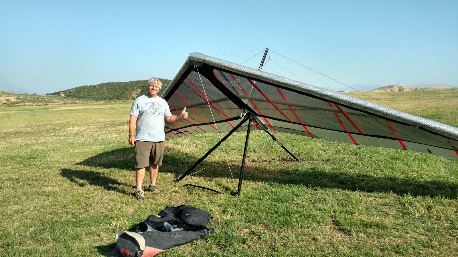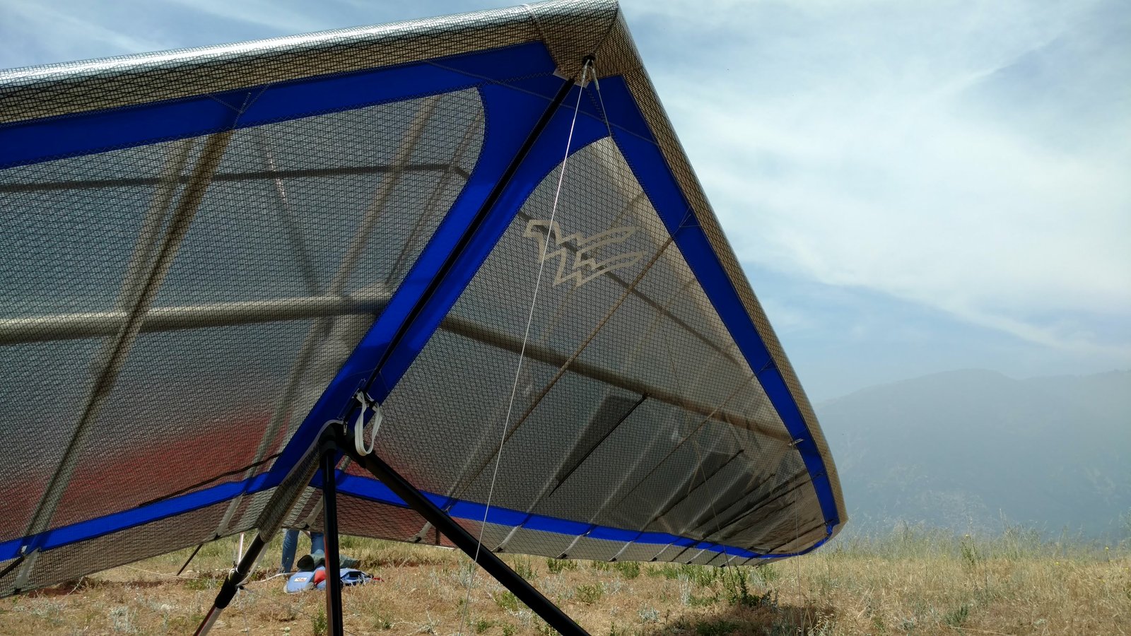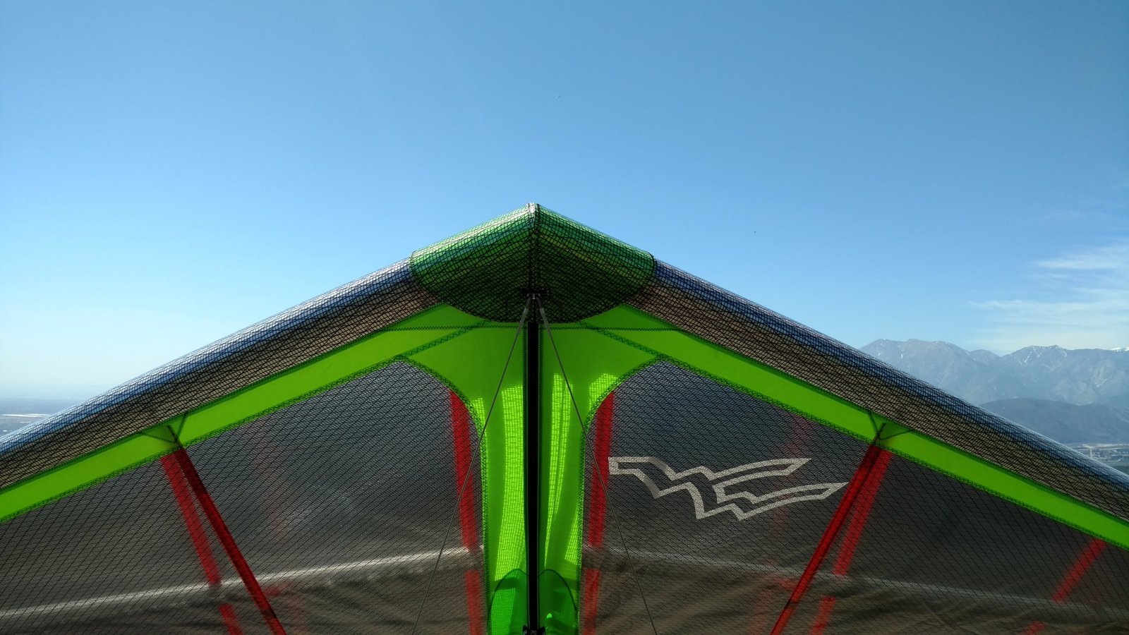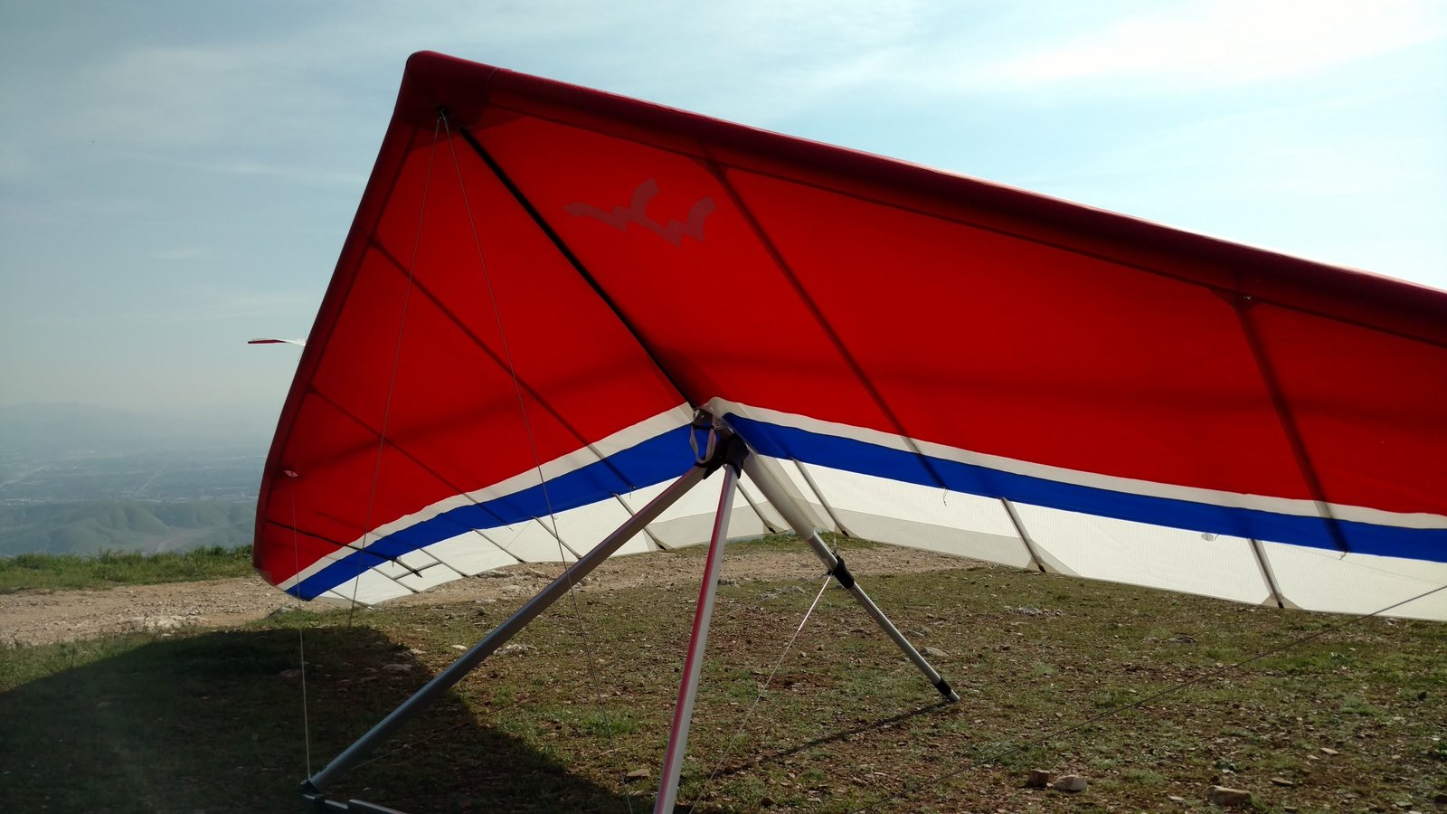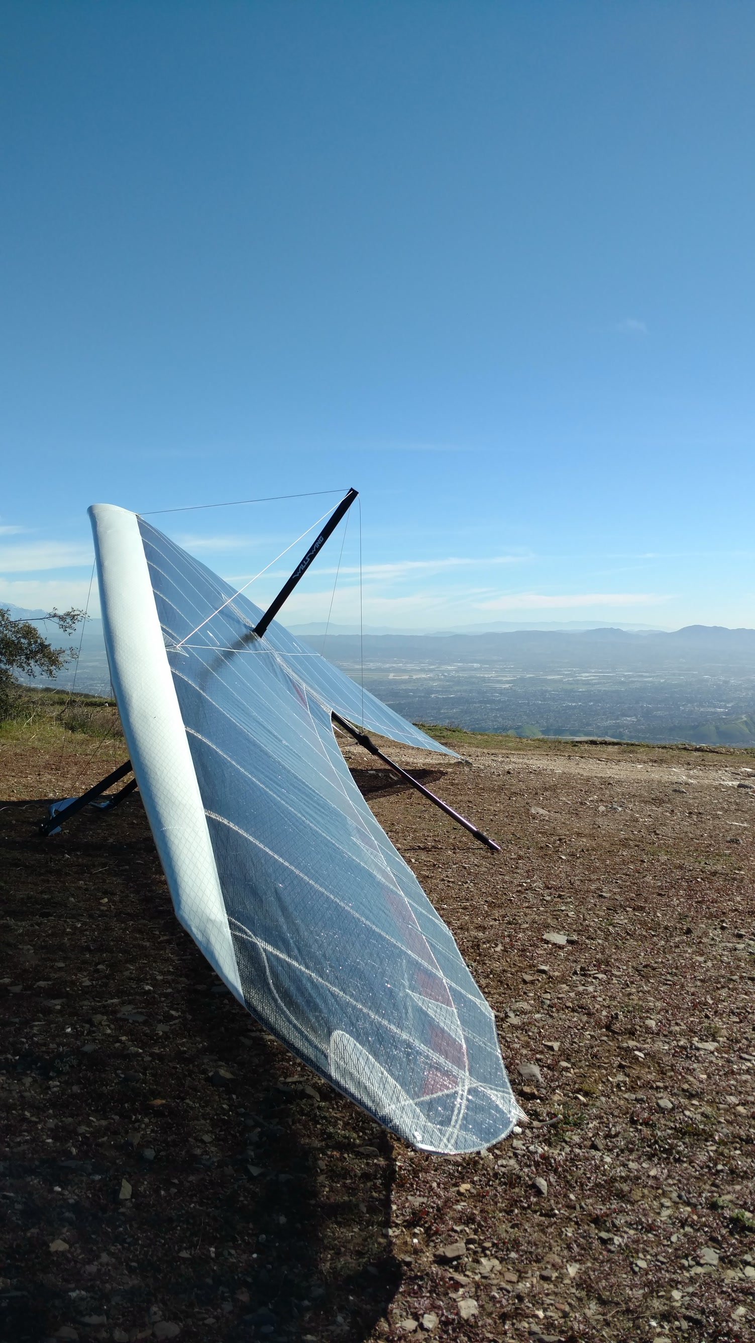 Good. Light winds and a low inversion layer, not as hot as it's been. It all added up to small thermals bumping against the inversion layer 500 feet above the peak. Had to bank hard and push out to stay in the little rodeo cores. Got 500 feet below launch once, briefly. Test flying a Wills Wing Falcon 4 170. Nobody else was flying so I didn't want to land in the valley and try to cadge a ride up to get my truck. Thus I didn't venture very far from the peak. Good to landing, trotted out out - small wing, little wind. GoPro at left xbar junction. Made a 3-minute video of my flight. |