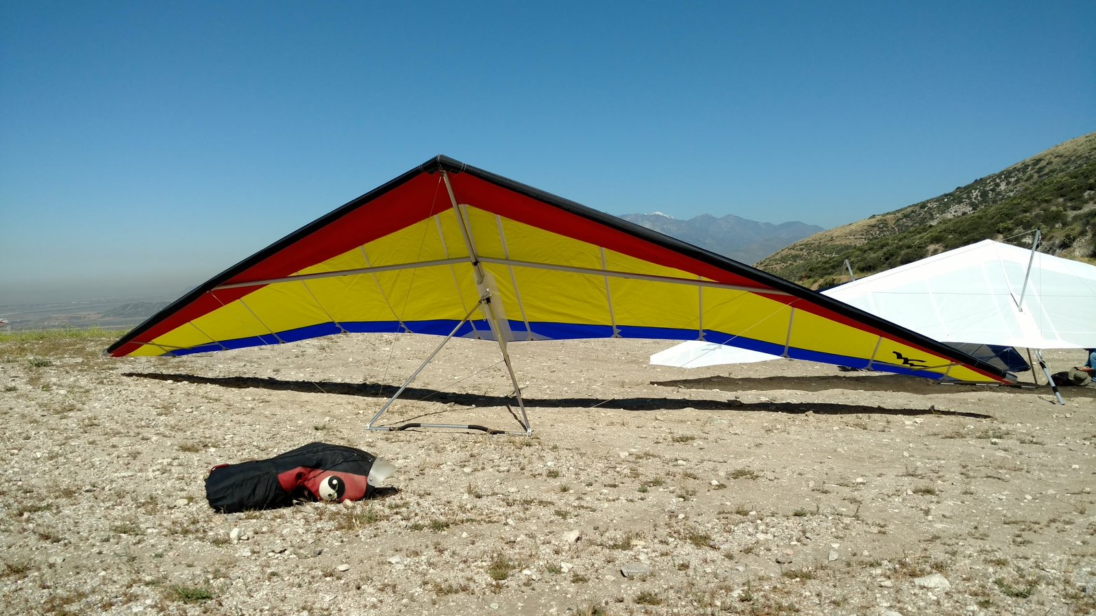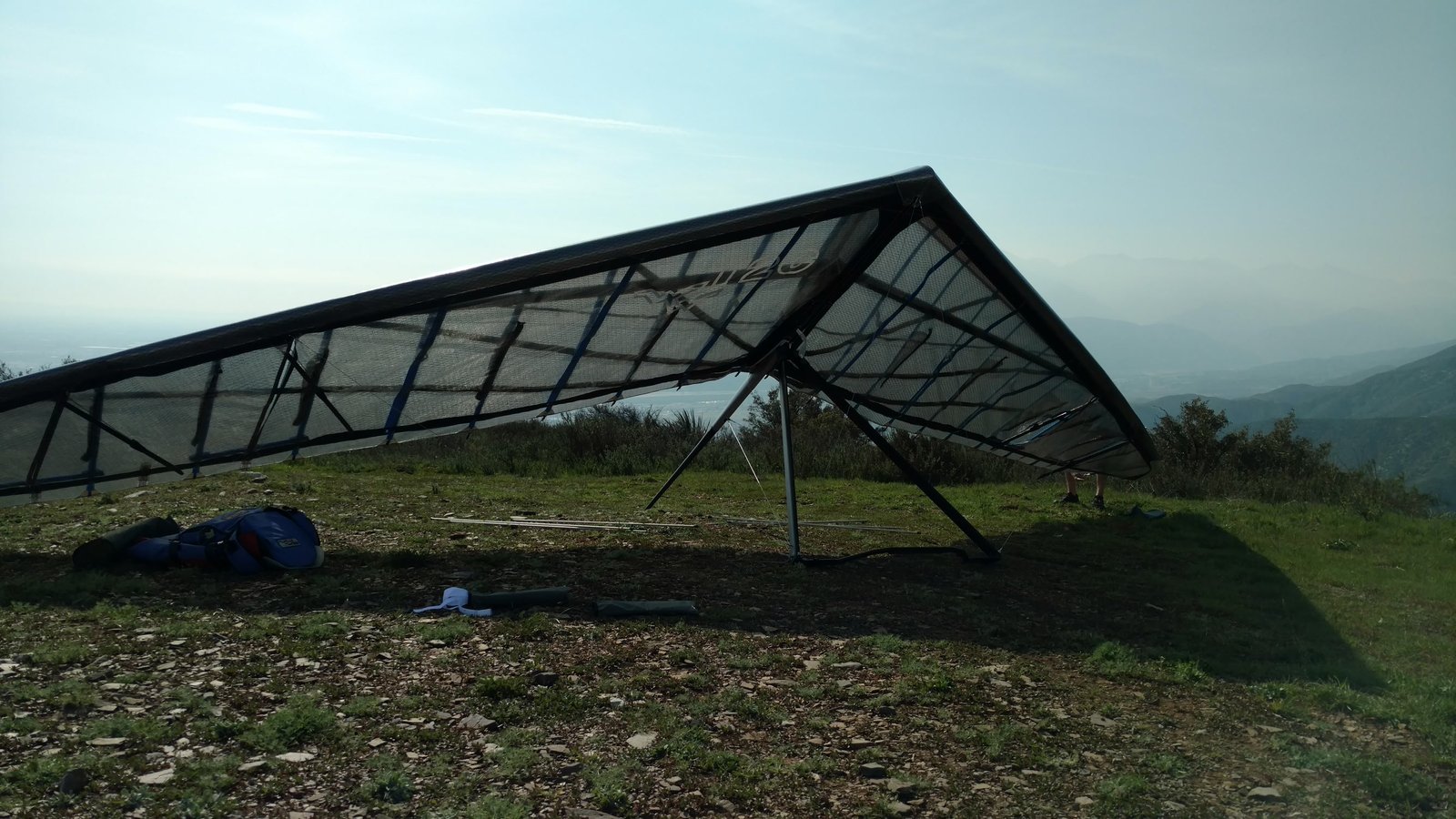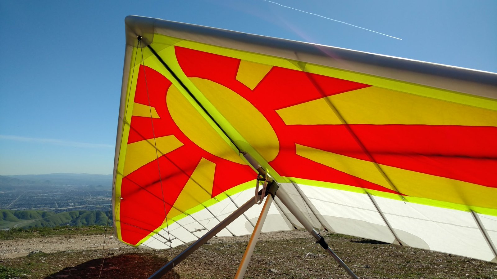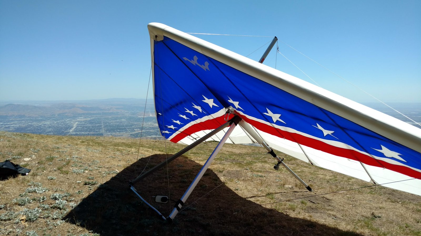 Good. Light winds and a low inversion layer, not as hot as it's been. It all added up to small thermals bumping against the inversion layer 500 feet above the peak. Had to bank hard and push out to stay in the little rodeo cores. Got 500 feet below launch once, briefly. Test flying a Wills Wing Falcon 4 170. Nobody else was flying so I didn't want to land in the valley and try to cadge a ride up to get my truck. Thus I didn't venture very far from the peak. Good to landing, trotted out out - small wing, little wind. GoPro at left xbar junction. Made a 3-minute video of my flight. |