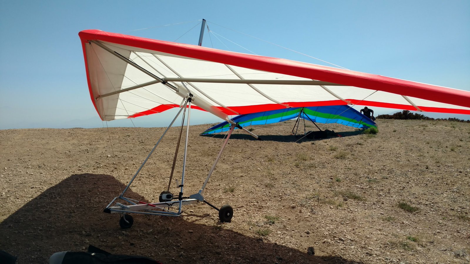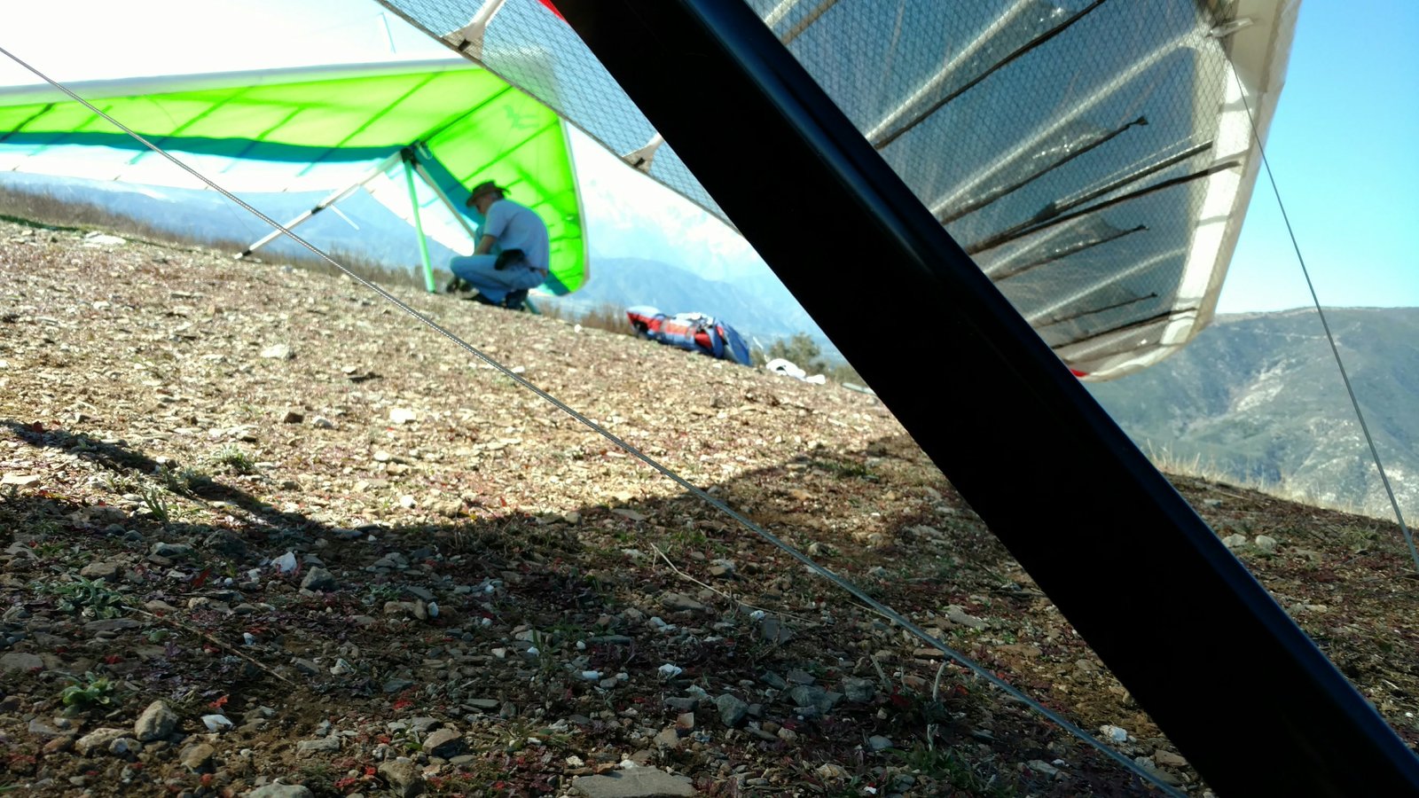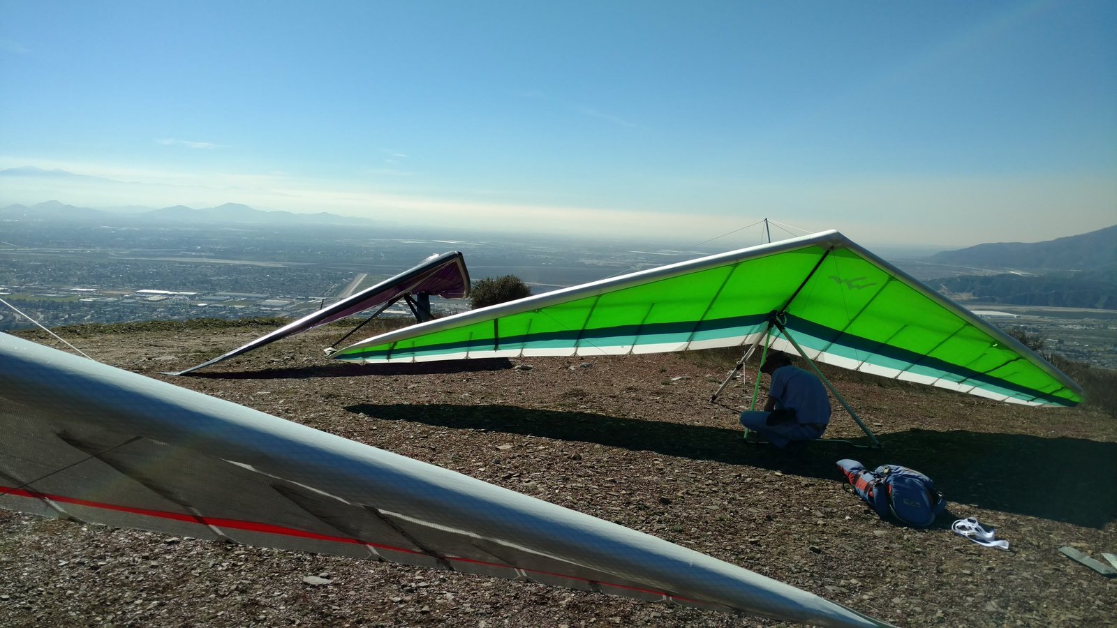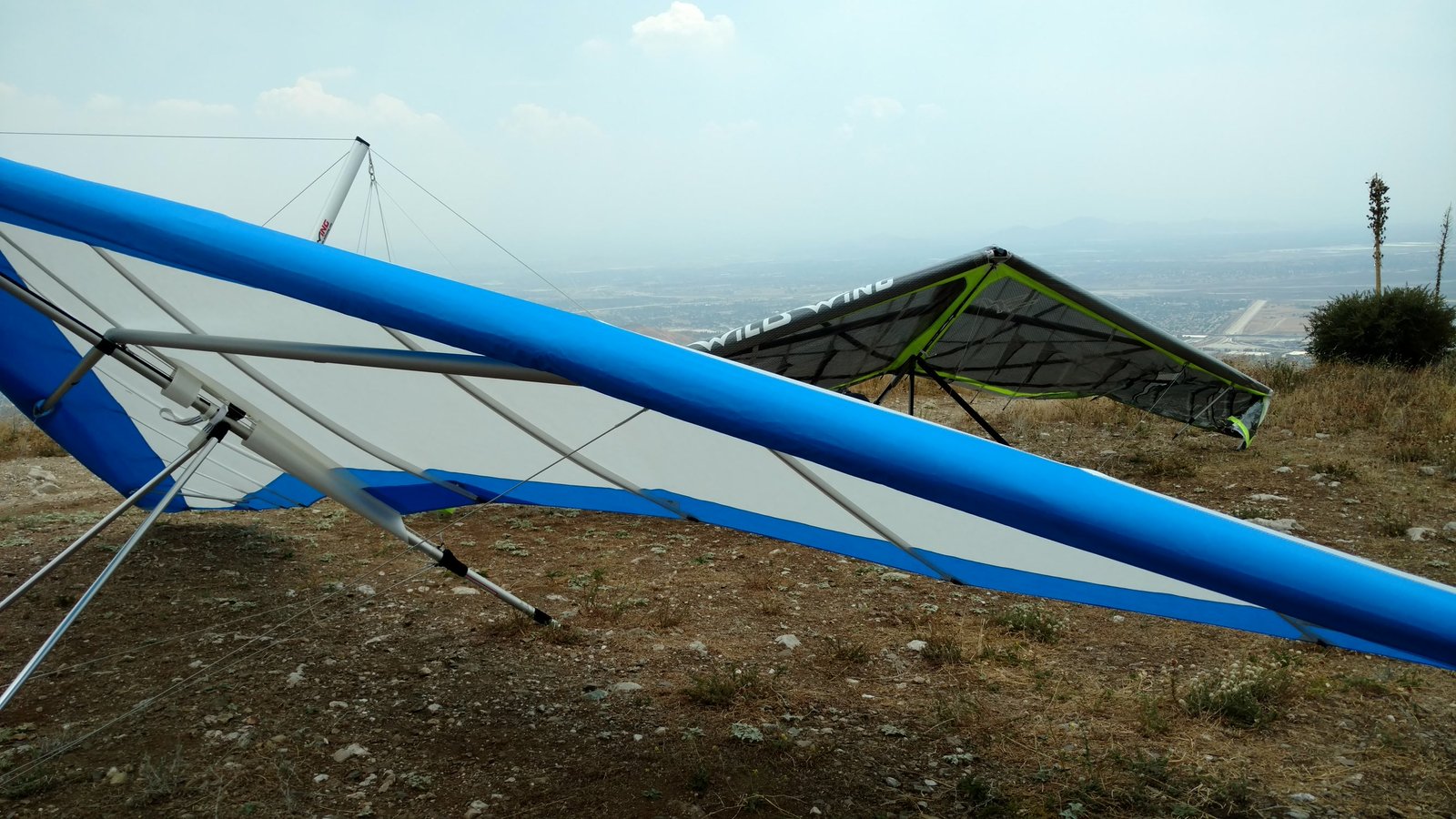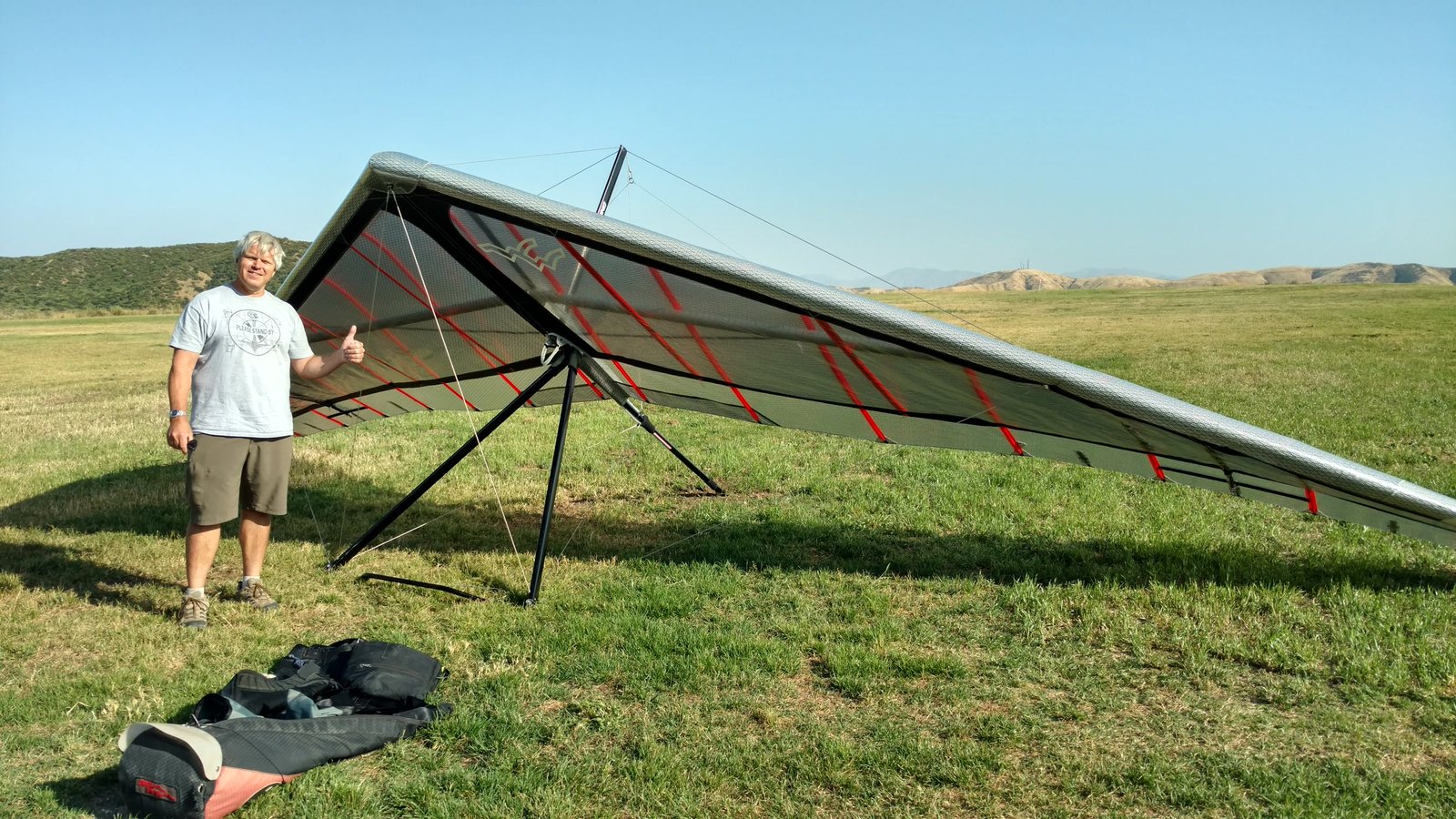 Good. Light winds and a low inversion layer, not as hot as it's been. It all added up to small thermals bumping against the inversion layer 500 feet above the peak. Had to bank hard and push out to stay in the little rodeo cores. Got 500 feet below launch once, briefly. Test flying a Wills Wing Falcon 4 170. Nobody else was flying so I didn't want to land in the valley and try to cadge a ride up to get my truck. Thus I didn't venture very far from the peak. Good to landing, trotted out out - small wing, little wind. GoPro at left xbar junction. Made a 3-minute video of my flight. |