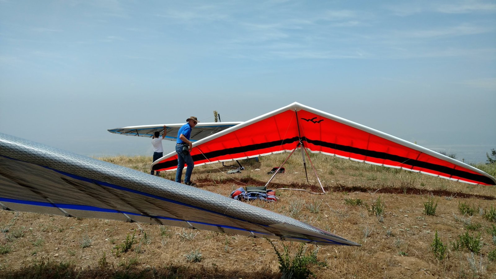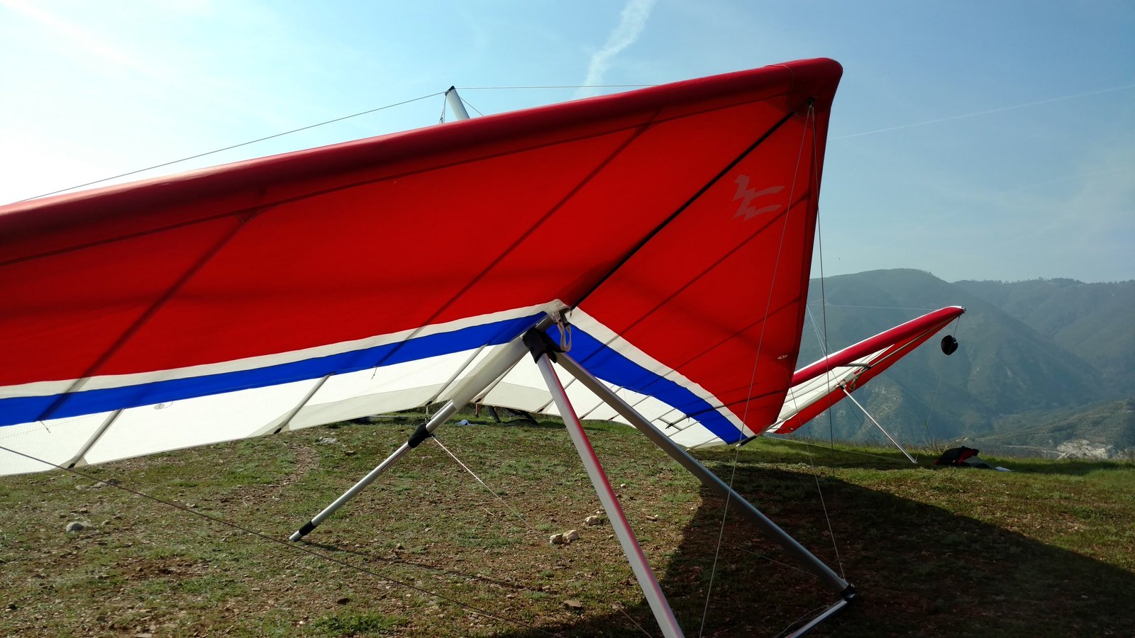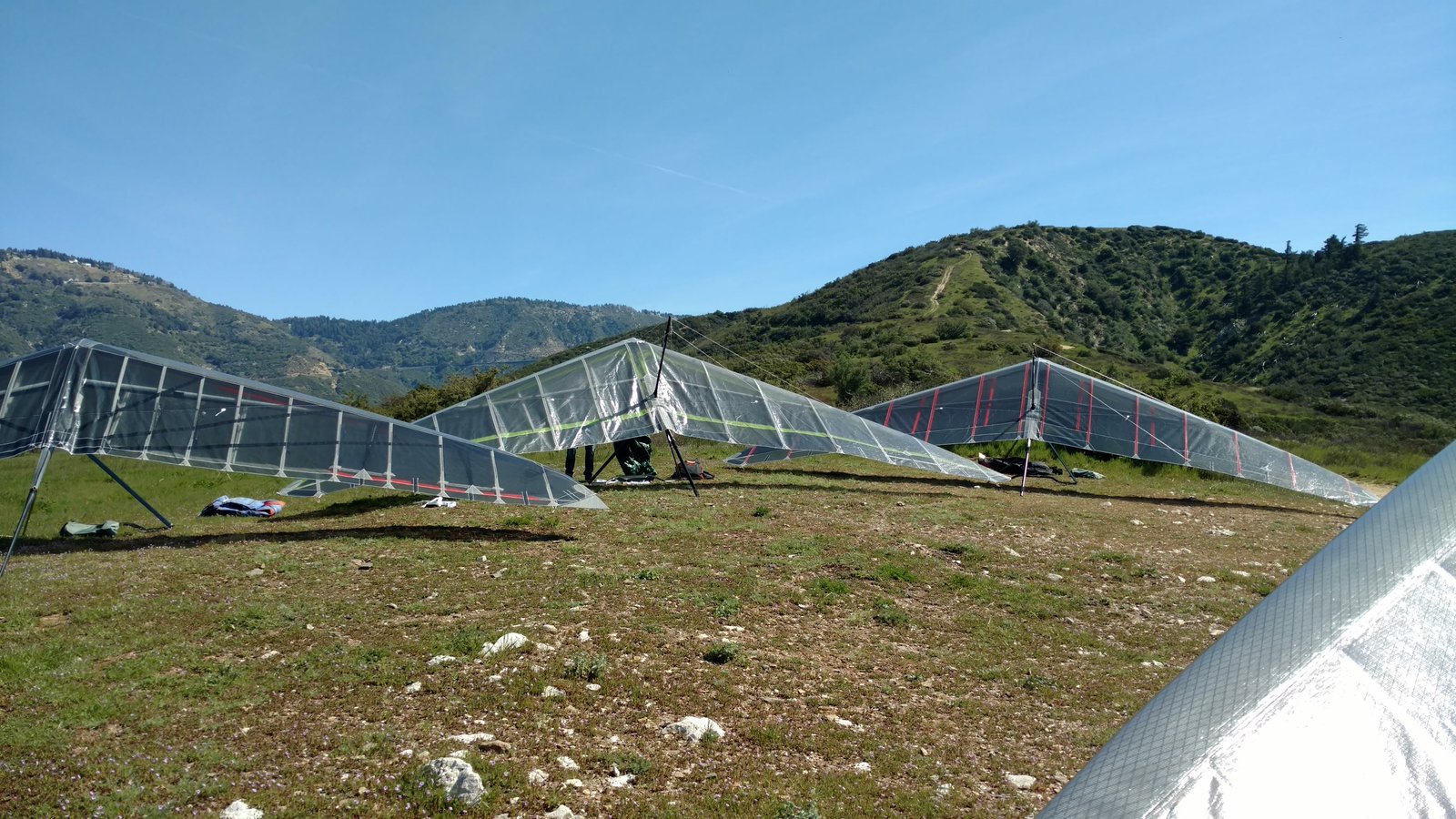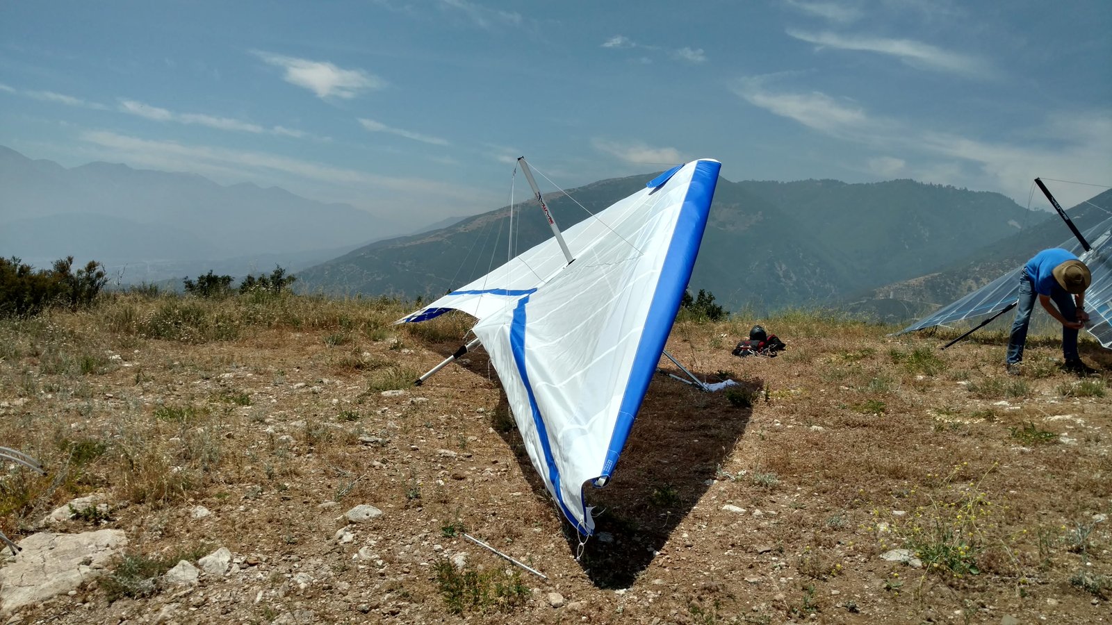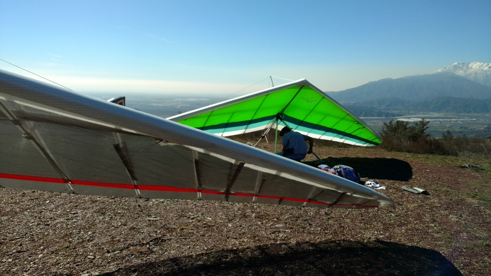 Good. Light winds and a low inversion layer, not as hot as it's been. It all added up to small thermals bumping against the inversion layer 500 feet above the peak. Had to bank hard and push out to stay in the little rodeo cores. Got 500 feet below launch once, briefly. Test flying a Wills Wing Falcon 4 170. Nobody else was flying so I didn't want to land in the valley and try to cadge a ride up to get my truck. Thus I didn't venture very far from the peak. Good to landing, trotted out out - small wing, little wind. GoPro at left xbar junction. Made a 3-minute video of my flight. |