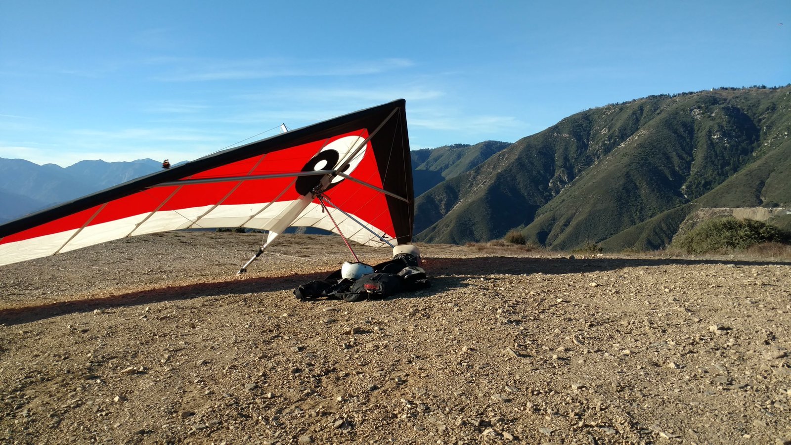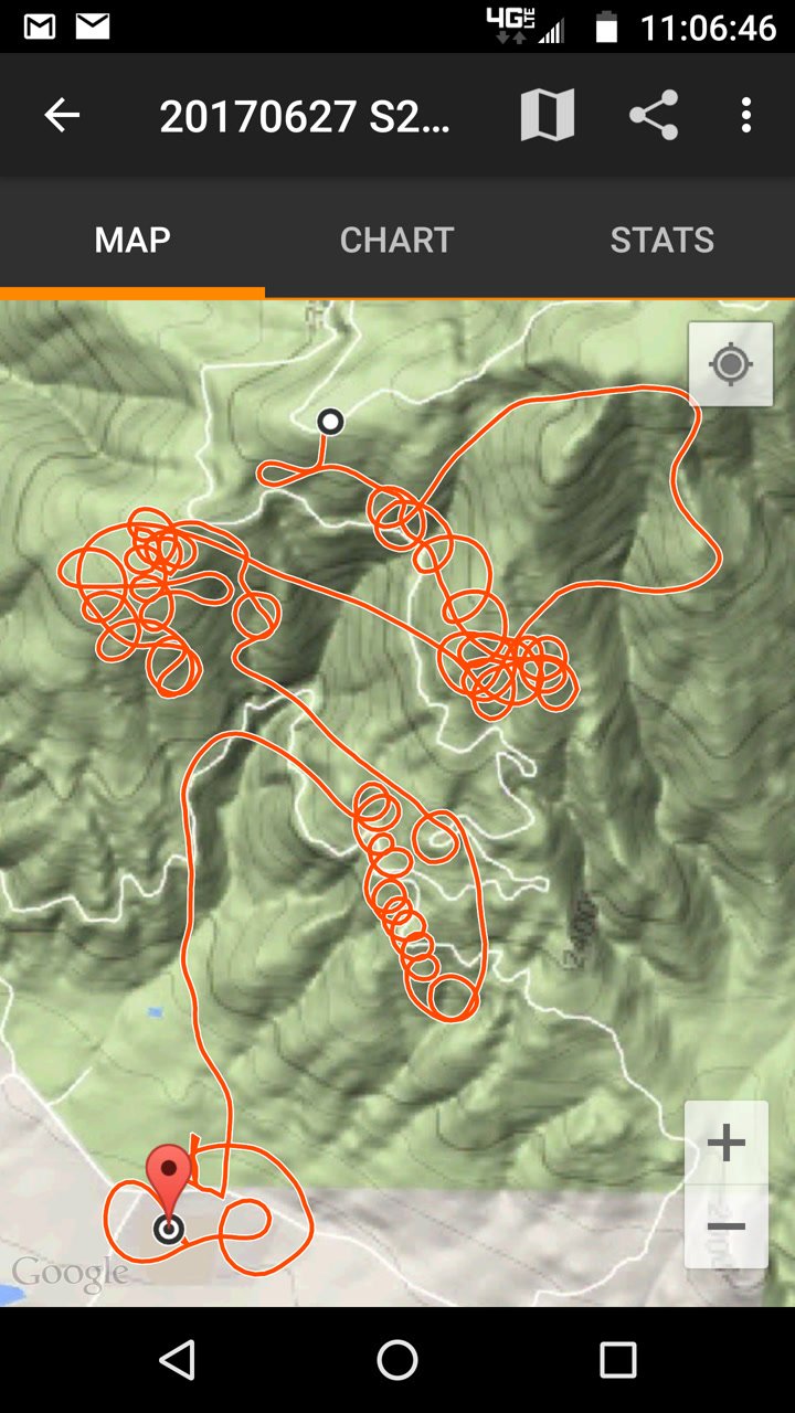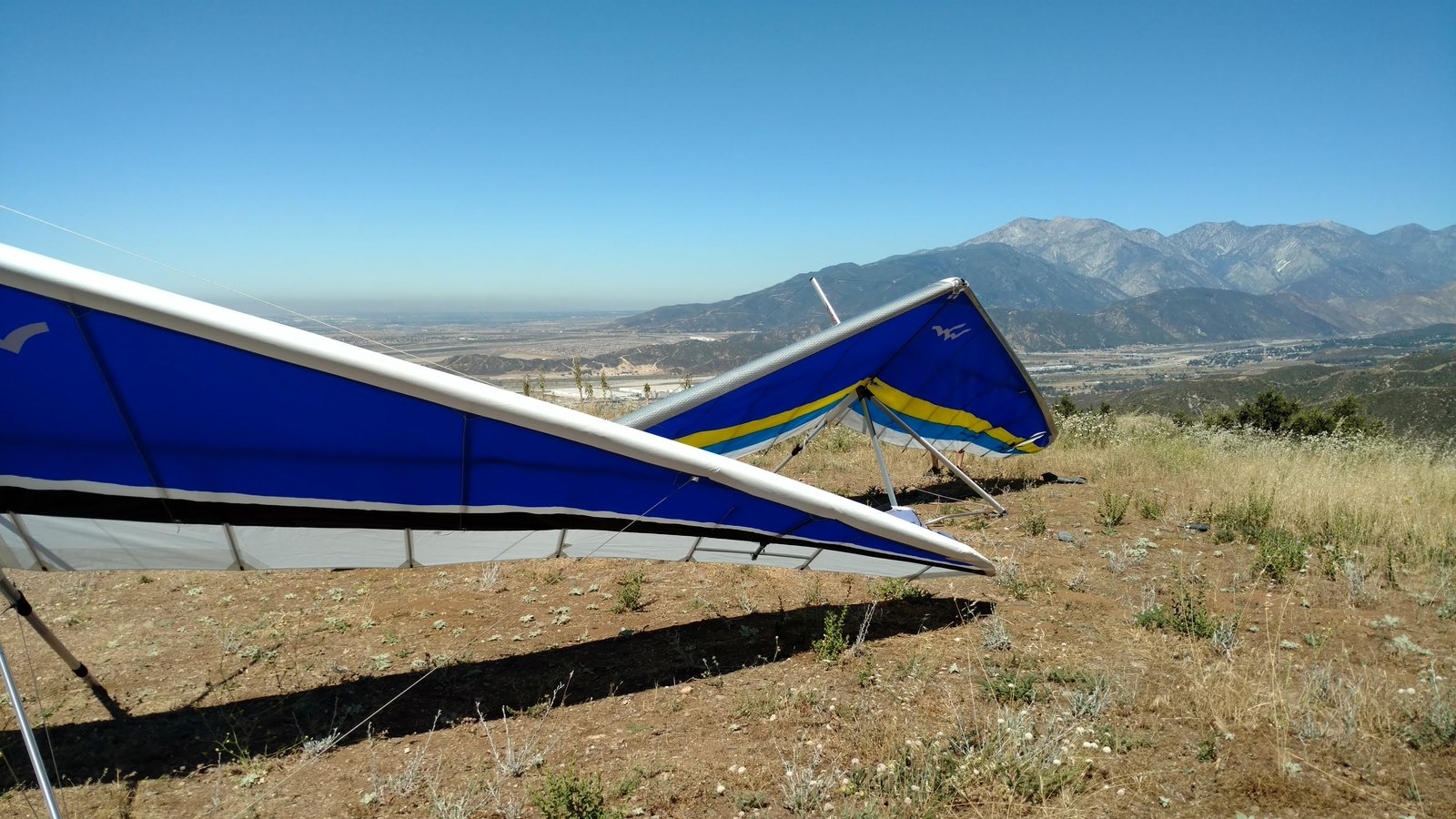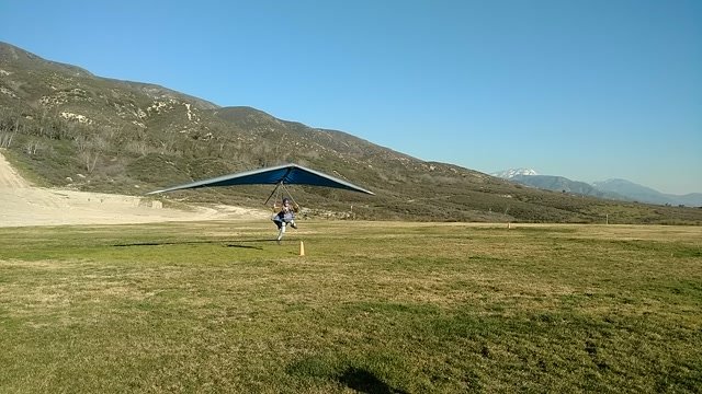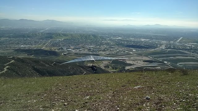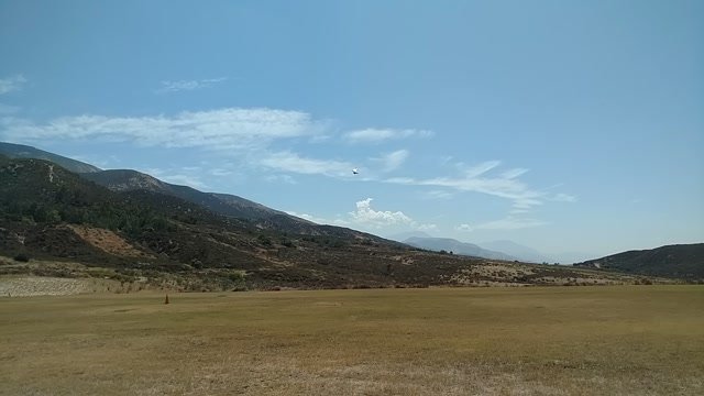 Good. Hot and muggy, last day of a monsoon pattern. Thermals near the hill, coming from SE. Hard to really settle in and circle in the thermals. Had the GoPro on the keel, flew low over Steve at launch. Donde in to get a good SW cycle at the LZ, did a right-hand approach for the heck of it. Overshot the PG cone by fifty feet. Found a stolen purse with keys and a USB stick, other stuff but no ID, on Devil Canyon Road where the dirt road meets it. Looked like it had been tossed from a moving car. Turned it in at CSUSB campus security after we were done flying. |