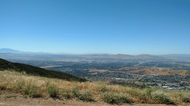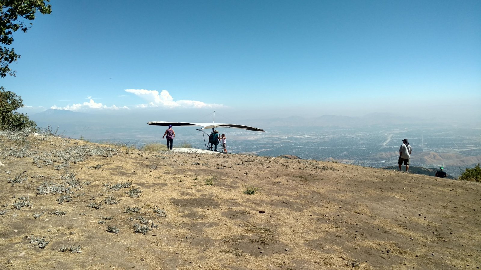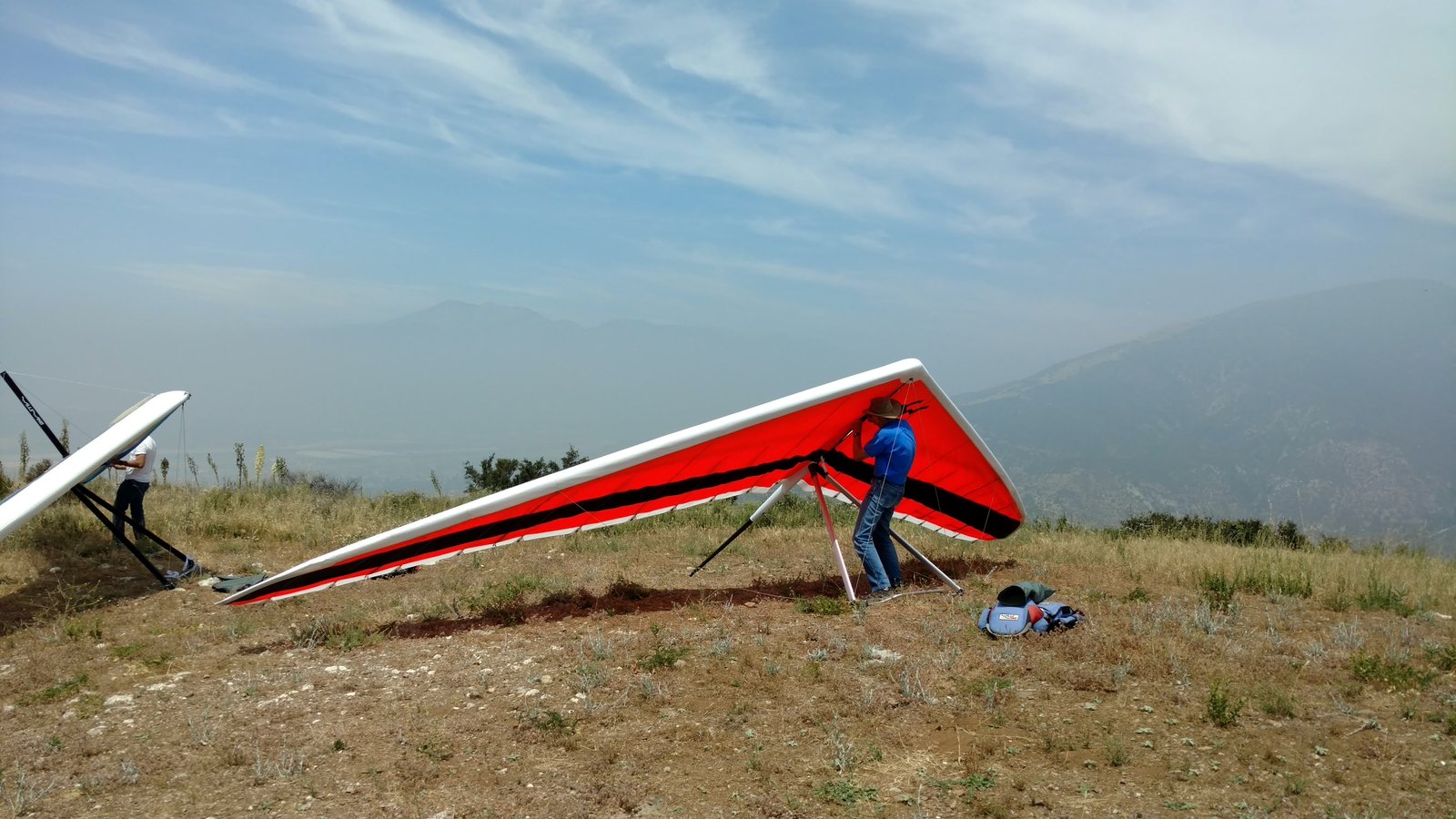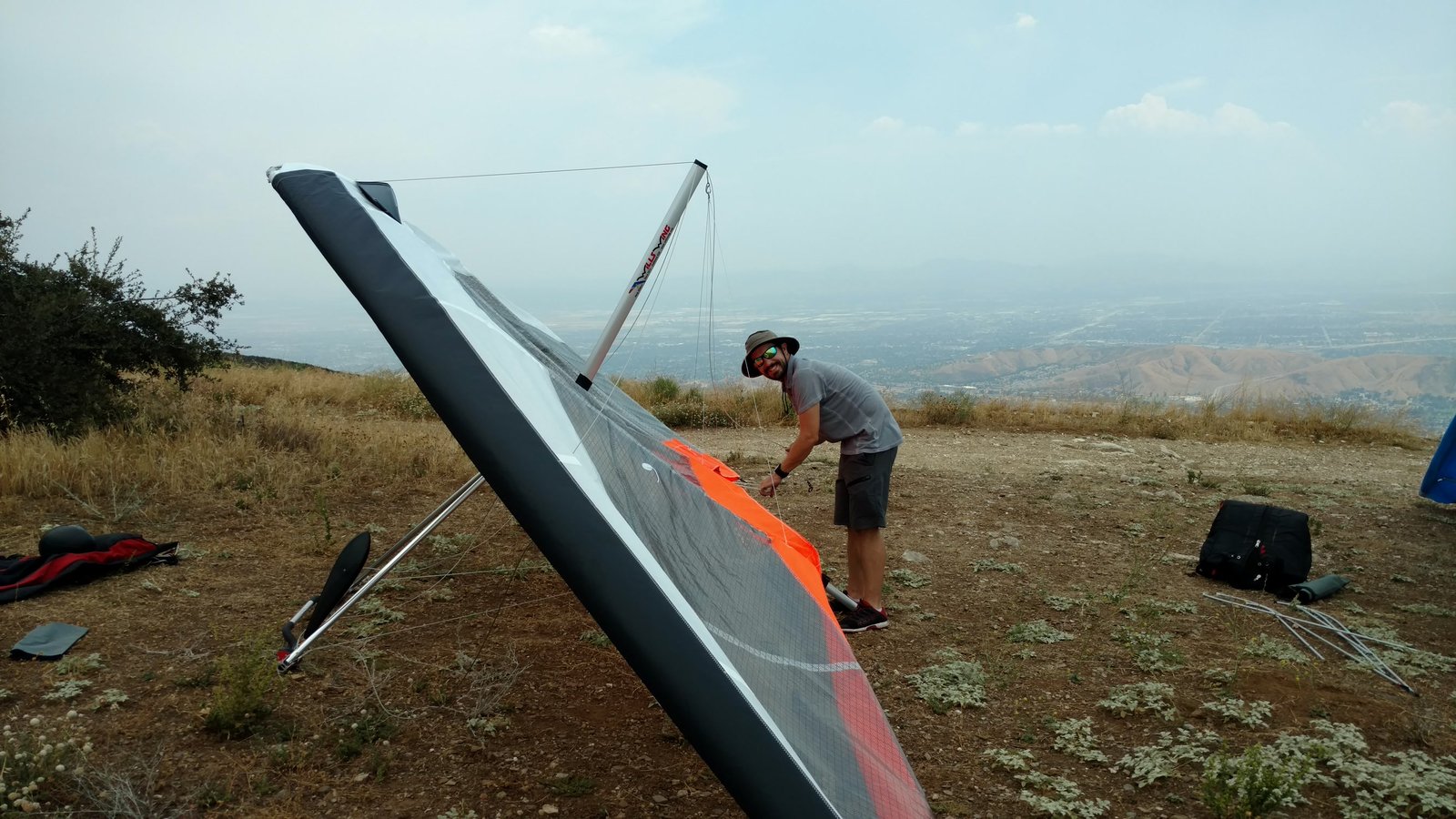 Good. Hot and muggy, last day of a monsoon pattern. Thermals near the hill, coming from SE. Hard to really settle in and circle in the thermals. Had the GoPro on the keel, flew low over Steve at launch. Donde in to get a good SW cycle at the LZ, did a right-hand approach for the heck of it. Overshot the PG cone by fifty feet. Found a stolen purse with keys and a USB stick, other stuff but no ID, on Devil Canyon Road where the dirt road meets it. Looked like it had been tossed from a moving car. Turned it in at CSUSB campus security after we were done flying. |