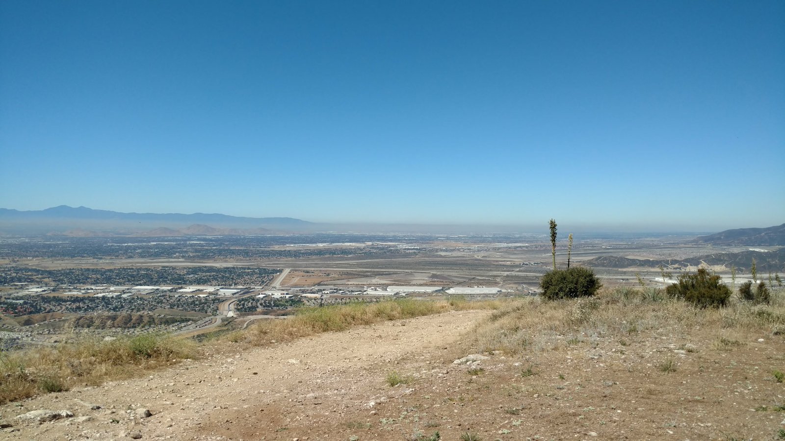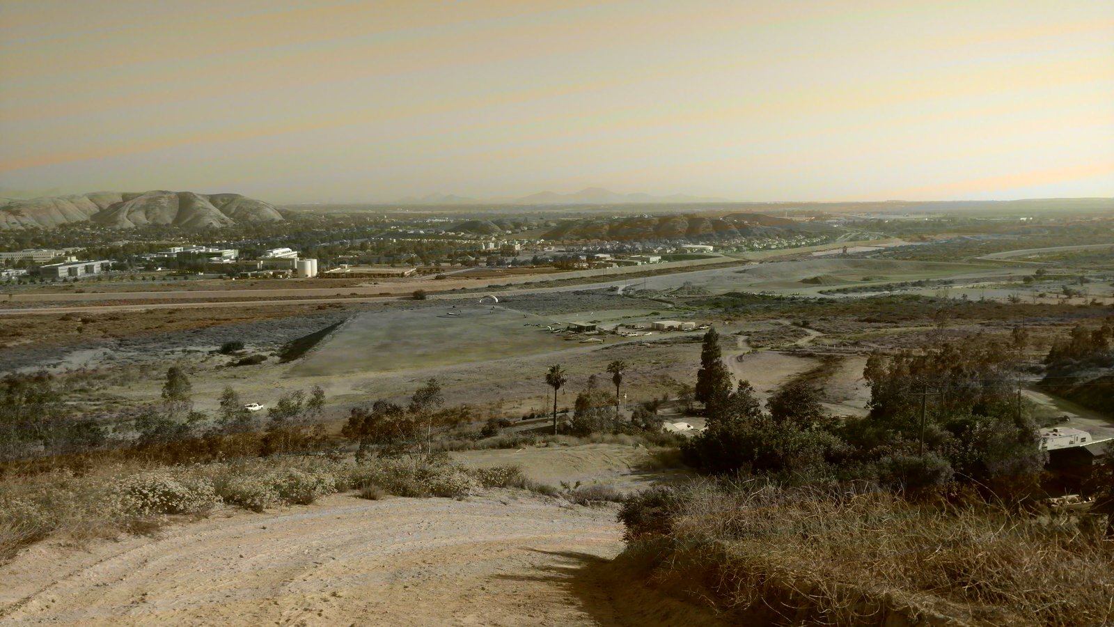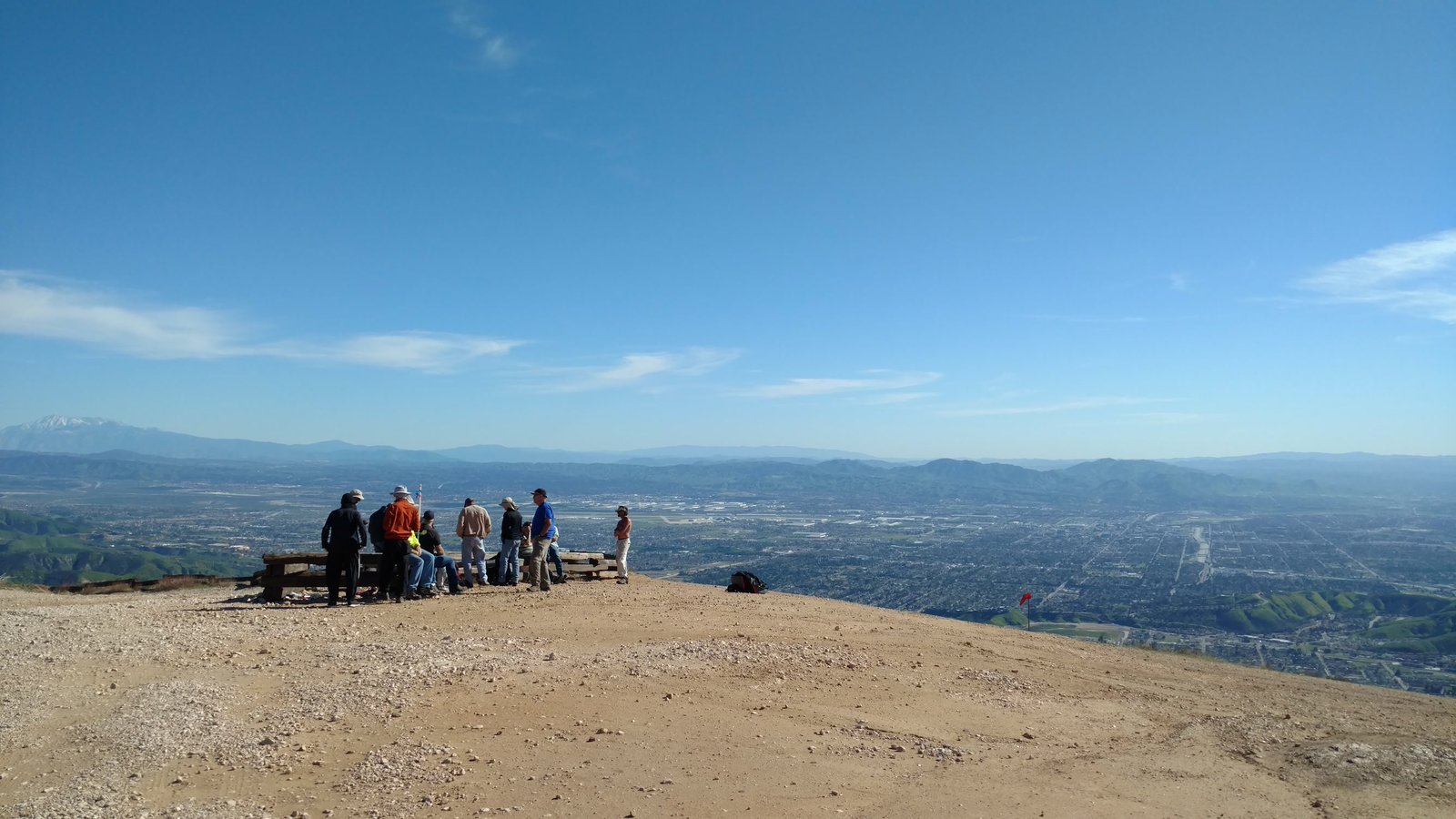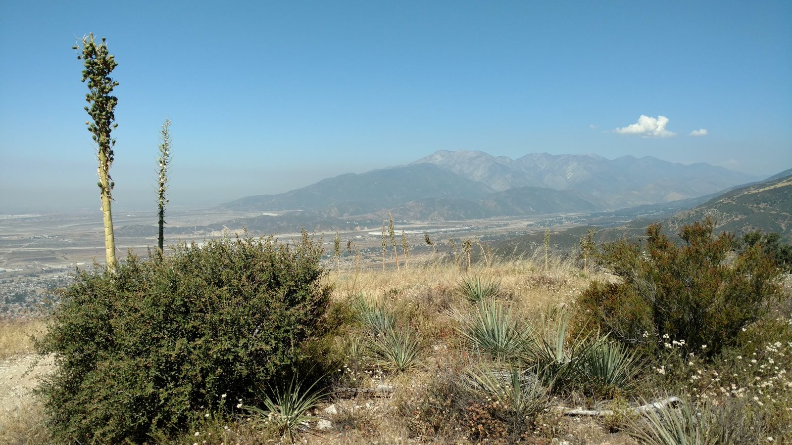 Good. Hot and muggy, last day of a monsoon pattern. Thermals near the hill, coming from SE. Hard to really settle in and circle in the thermals. Had the GoPro on the keel, flew low over Steve at launch. Donde in to get a good SW cycle at the LZ, did a right-hand approach for the heck of it. Overshot the PG cone by fifty feet. Found a stolen purse with keys and a USB stick, other stuff but no ID, on Devil Canyon Road where the dirt road meets it. Looked like it had been tossed from a moving car. Turned it in at CSUSB campus security after we were done flying. |