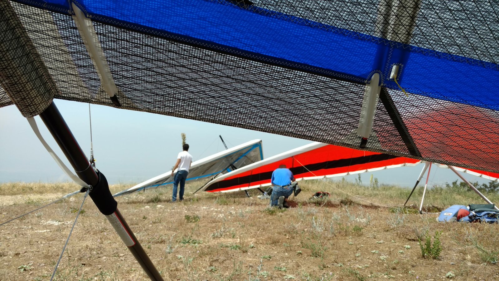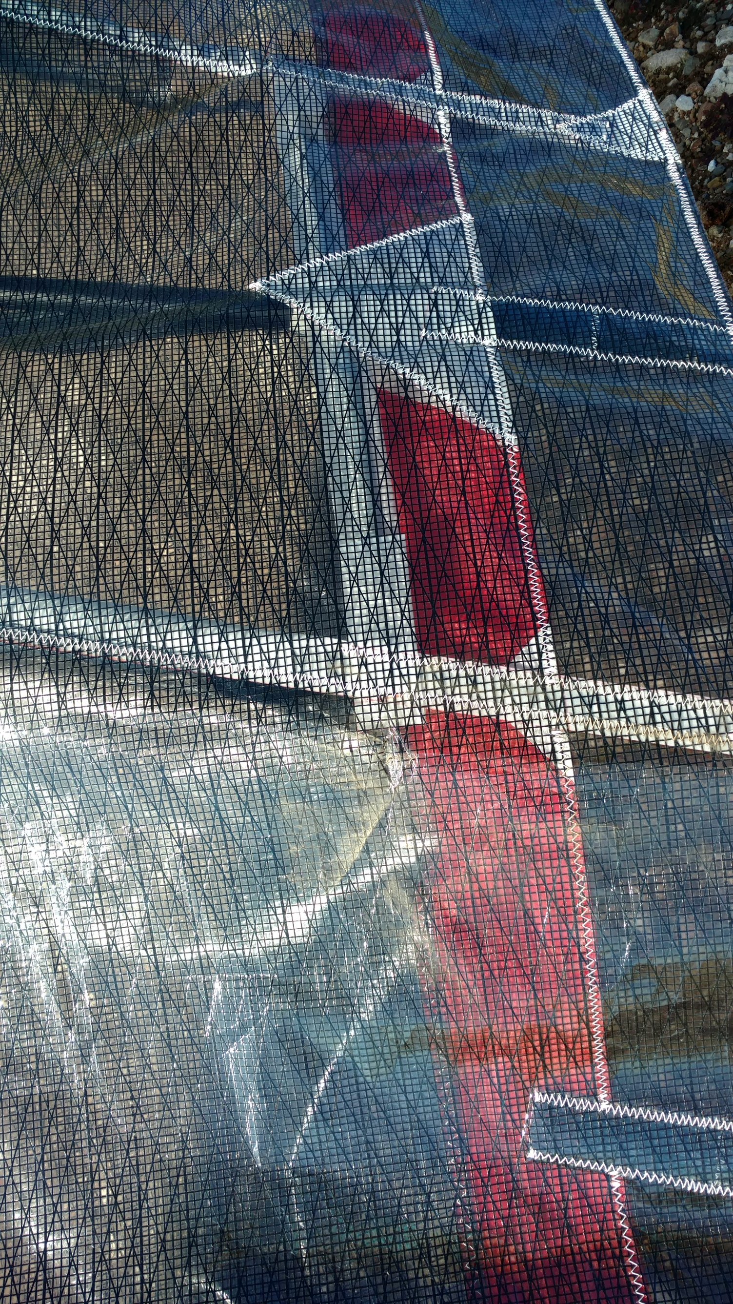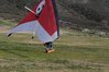 Good. Flight with regular battens. TT normal, to 33 and firm pressure. Refly with extra reflex 8-9-10; MM flew with them one similar U2 this round. All Mylar, window BS, spanwise rainbow TE frame. Struggled near the 750 for a long time. Got over the LZ with a good SW cycle but worked lift until the wind died. Flared hard and ran, plopped basetube hard. Hot knife haulback string. |