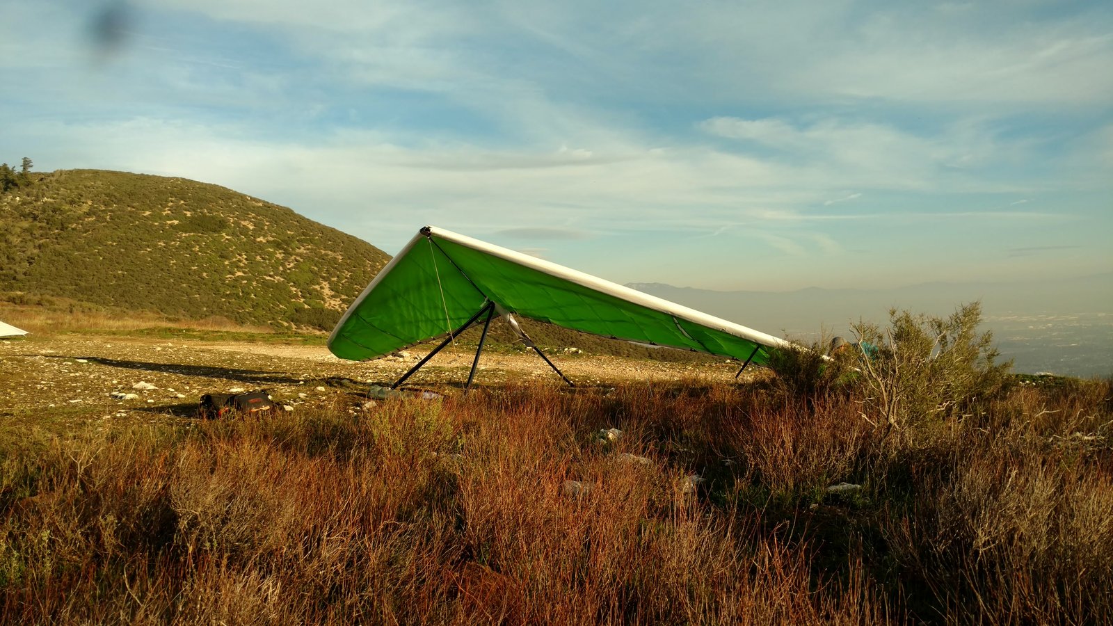 Hazy and cool with light onshore flow, inversion about Crestline height.SP had shimmed bridles 1 inch and raised sprogs 1 or 1.5 turns. Friday I replaced the too-short transverse battens with ones that actually passed under the aluminum battens. Handling still very nice. A couple of pounds more pitch pressure per hand with the bar at mid- to all-the-way stuffed. Vt=23 with the interesting feature that VtVGT was 21.5-22. Both sprog cables slack (drooping) at trim VGT; approaching VdVGT they would straighten out but didn't go tight. Vt 1-2 MPH faster in turns but not really different in feel than most other gliders. Pushing out to crank and bank in a couple of strong narrow cores close to the slope was very comfortable and the climb was great. Biggest thing I noticed this flight was that when VGT I could initiate and hold a spin much more easily than with a Sport 2 155. VGL it did not spin for me at all. |