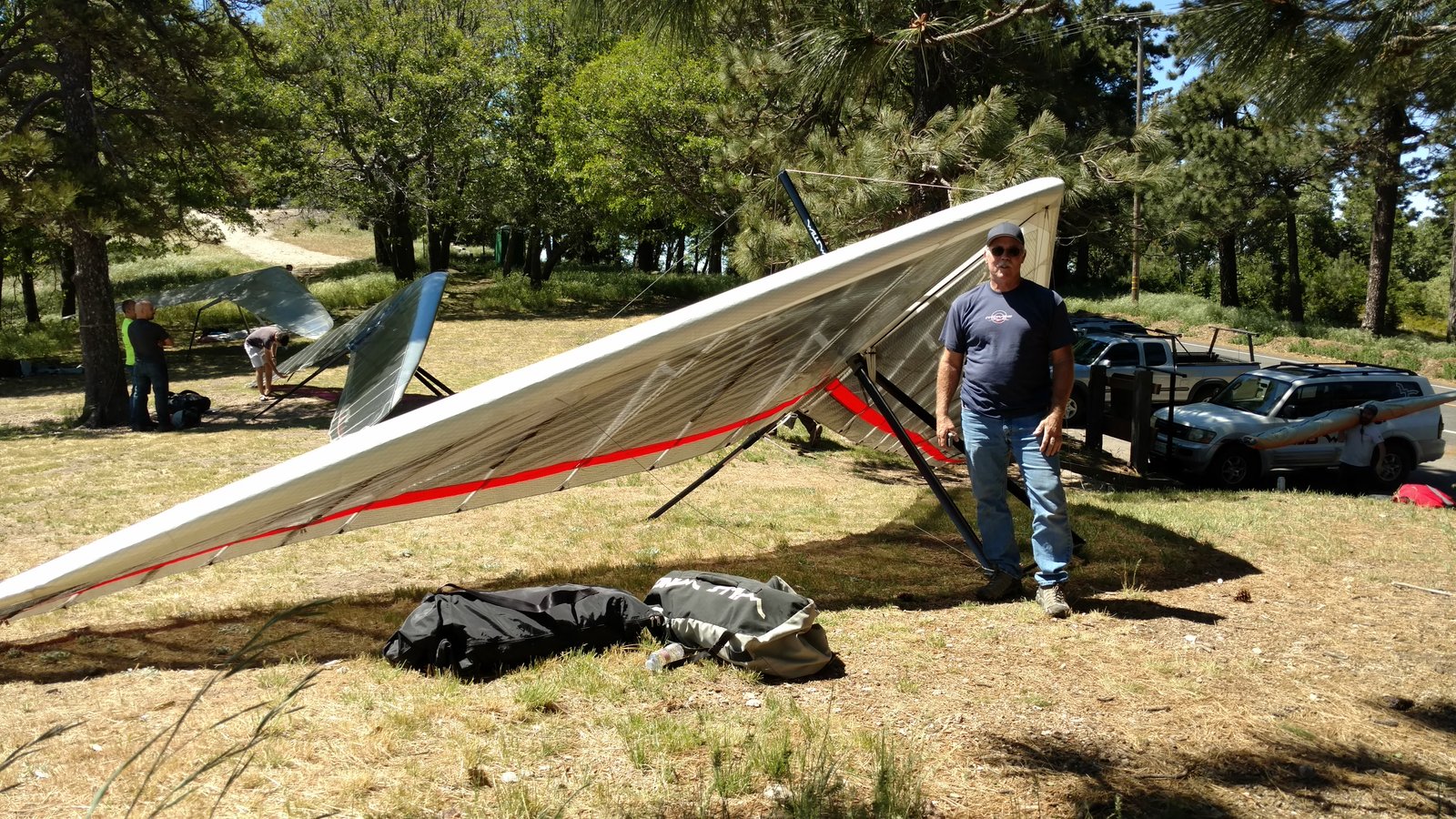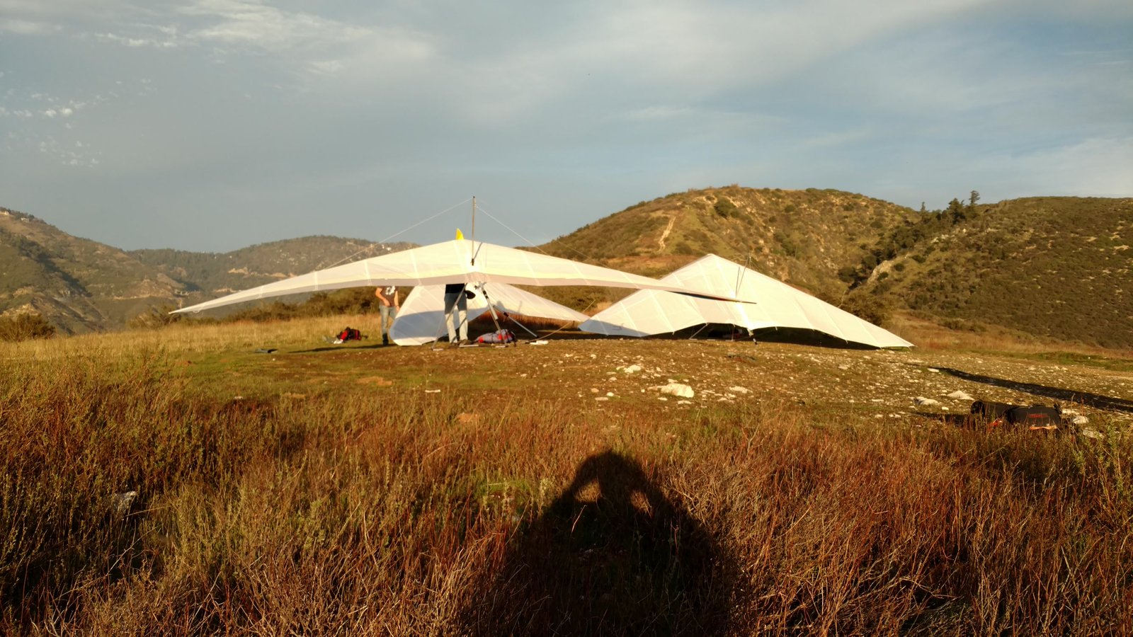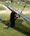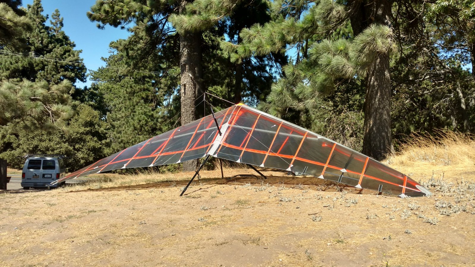 Good handling. VdVGT=45, VtVGT=19. Twisted left tip one for right turn. Light S, North coming Sat/Sun. Got 1k+ over by wrestling with the first thermal, going nearly straight up. Several more climbs in the area then to Pine. Got 7k between Pine and Sugarpine, N of ridge. Crept back to Pine then went out and landed in no wind. Good flare. GoPro on keel; spin clip and summary video made. Trim left sprog bungee ends. |