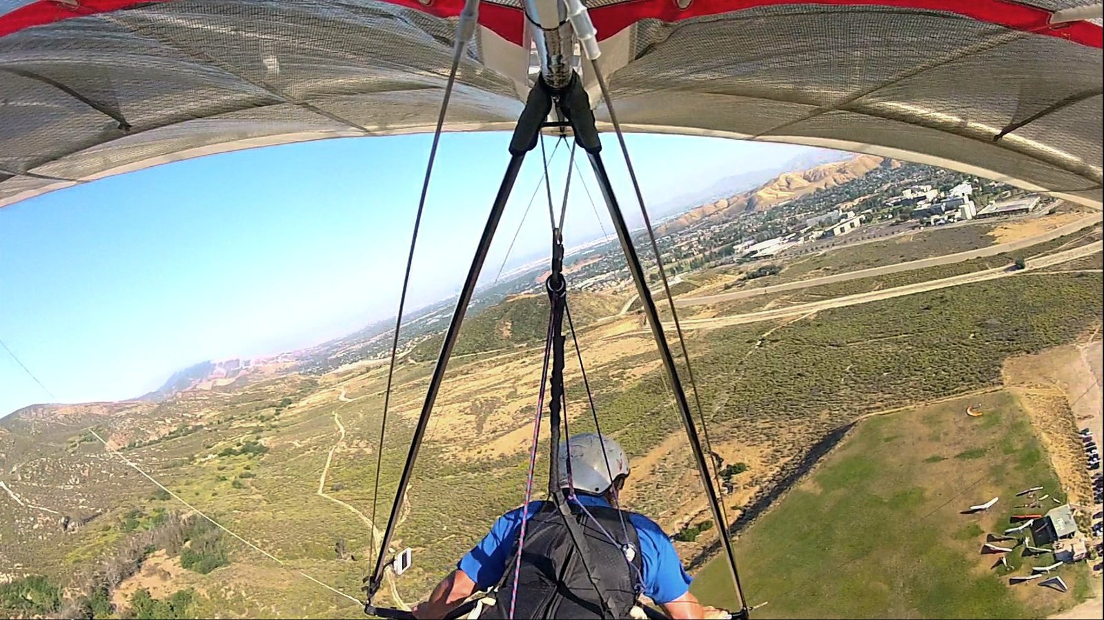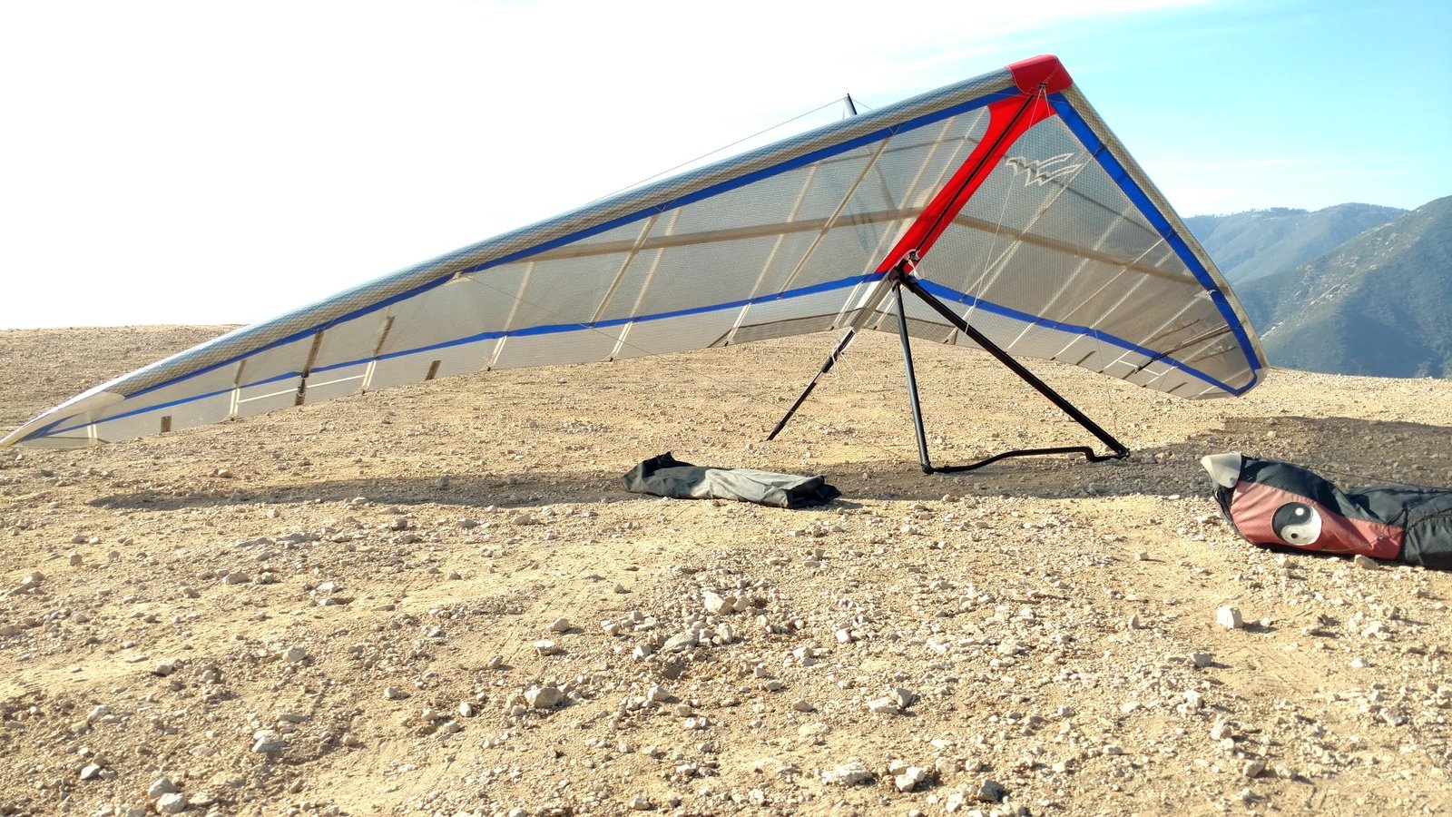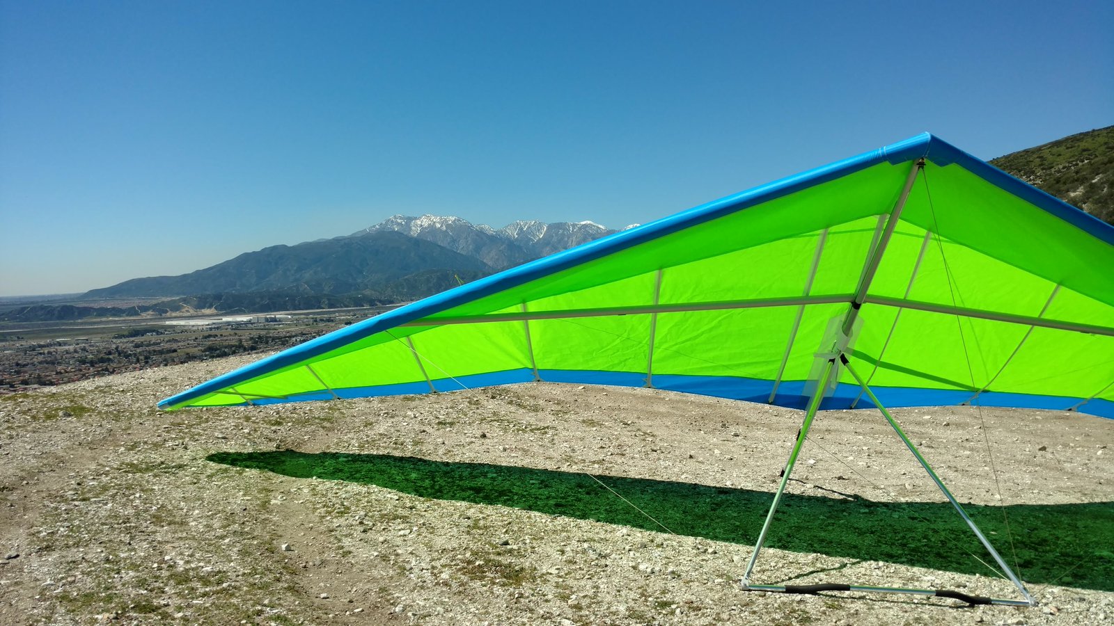 Good. Twisted left tip 1 hole for slight right turn. TT to 33 VGT. Windy today, 20+ at Crestline, but great flying and nice thermals despite the wind. U2 160 at 3:07. Flew for 1:24, got to 6,400 MSL. Tagged Sugarpine and then back to Crestline. Went Crestline -> Cloud Peak -> Crestline in 8.5 minutes! Went out to the freeway south of AJX before landing. Some in the LZ complained of it being bumpy but I liked it. GoPro on keel. Video posted. |