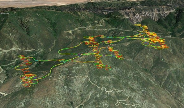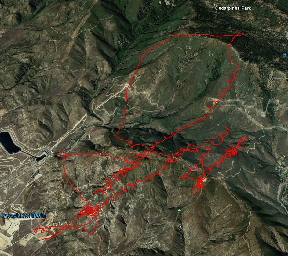 I launched Crestline about 2:40 with a Sport 2 155. Got kinda low at Billboard and then a thermal took me straight up to 6k+ with the drift turning to a little from the NW. Got 7k back above Crestline launch and then went east to the interchange area. Got 7k and headed east to the next point but was in 500+ FPM sink all the way there so turned back. Up at the interchange again, this time to 8k and went for the Cliffhanger. Again, sink all the way there and back, sometimes 900 FPM. |