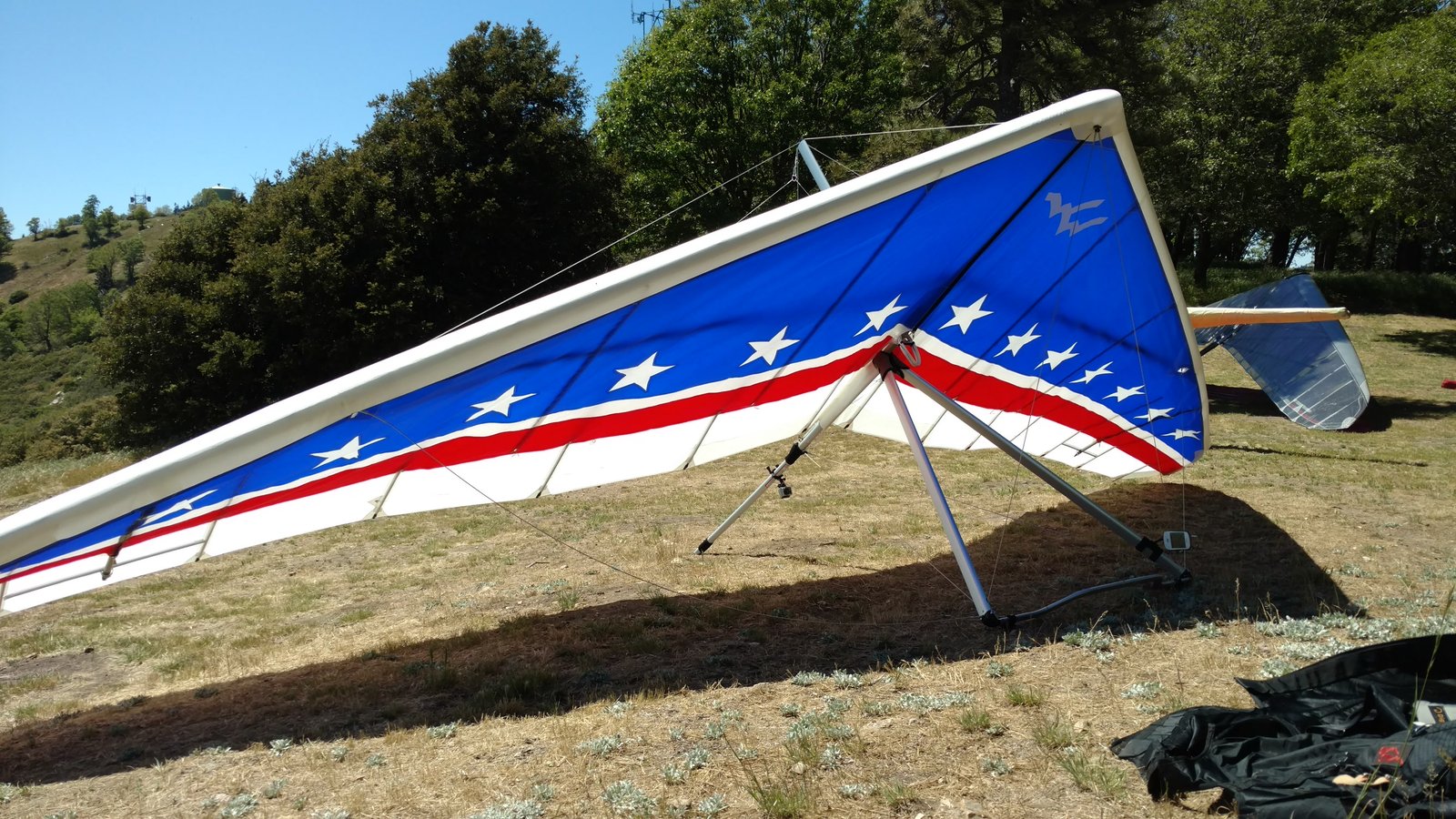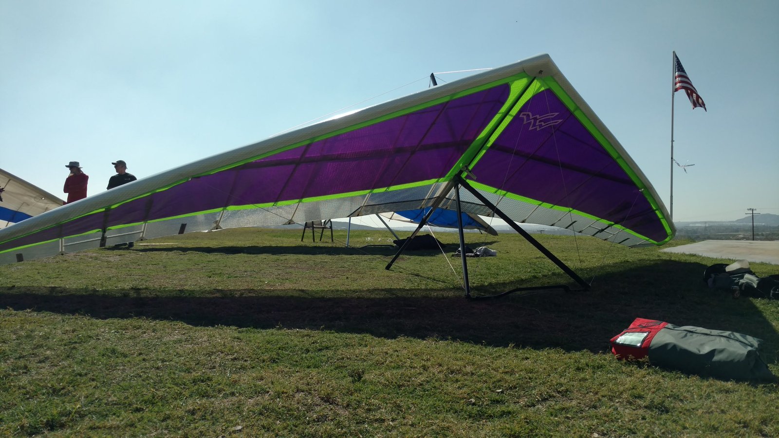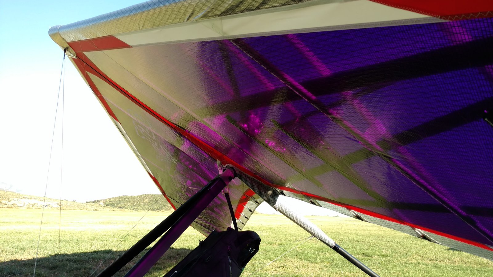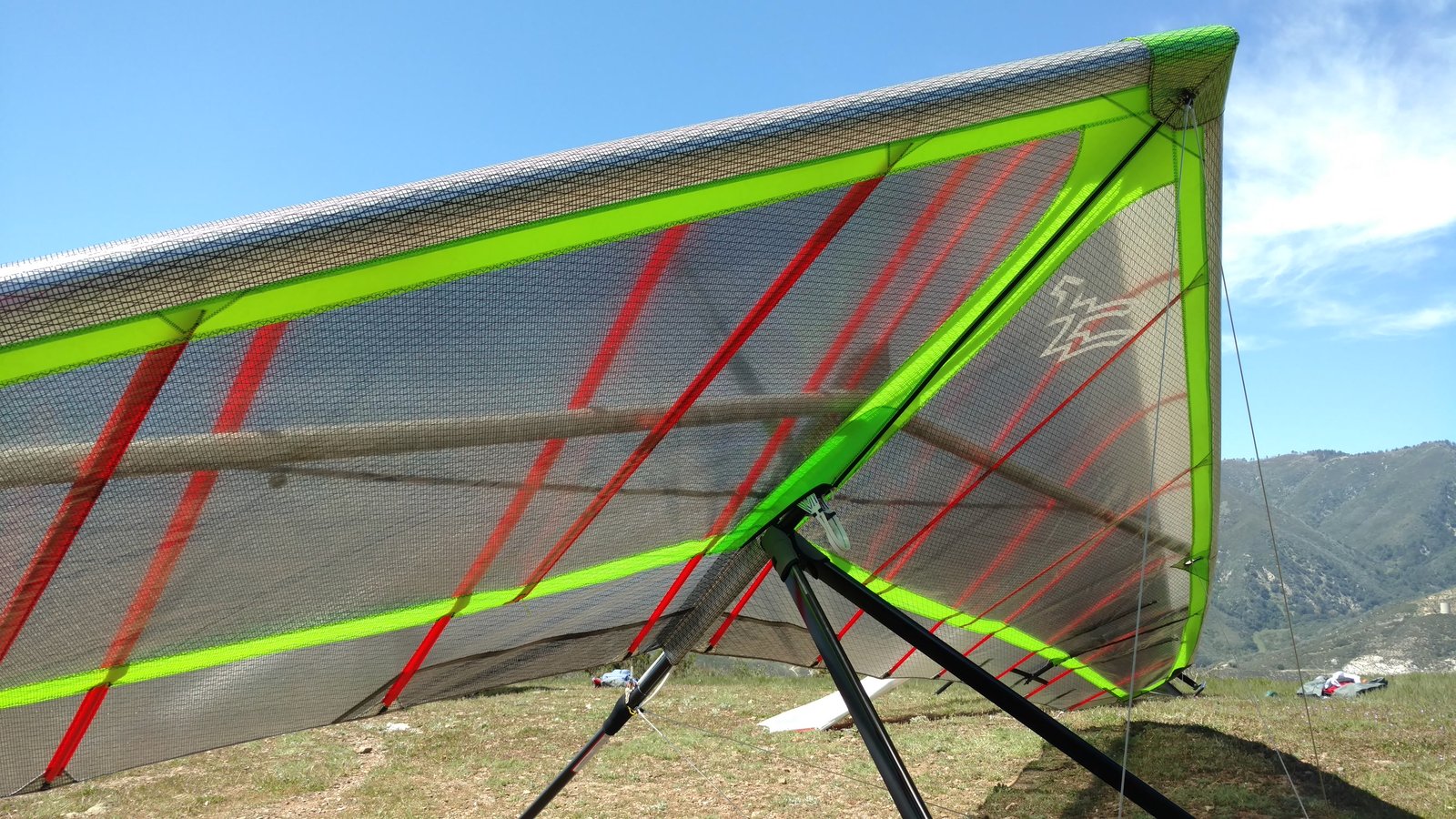 Good. Sweet handling. Bit of flutter between L tip and #2 batten. Tightened #2 batten string. Got down above the 750 before finding lift. Easy soaring. Flew low over Wisconsin Paul on Marshall and found a real boomer at the windsock; several hundred feet in a few turns. Dove to LZ. Good right-hand approach and landing 20 feet past the PG cone. |