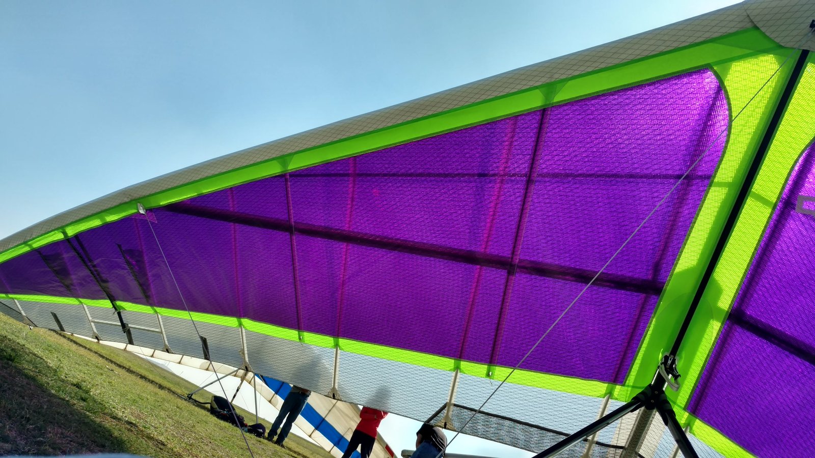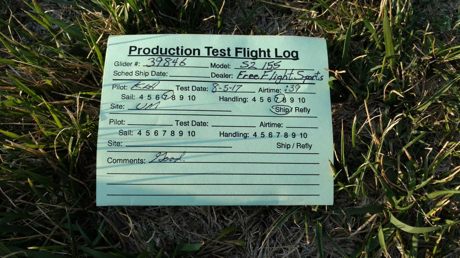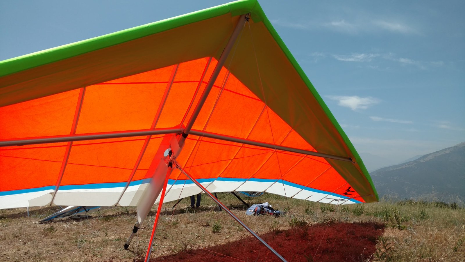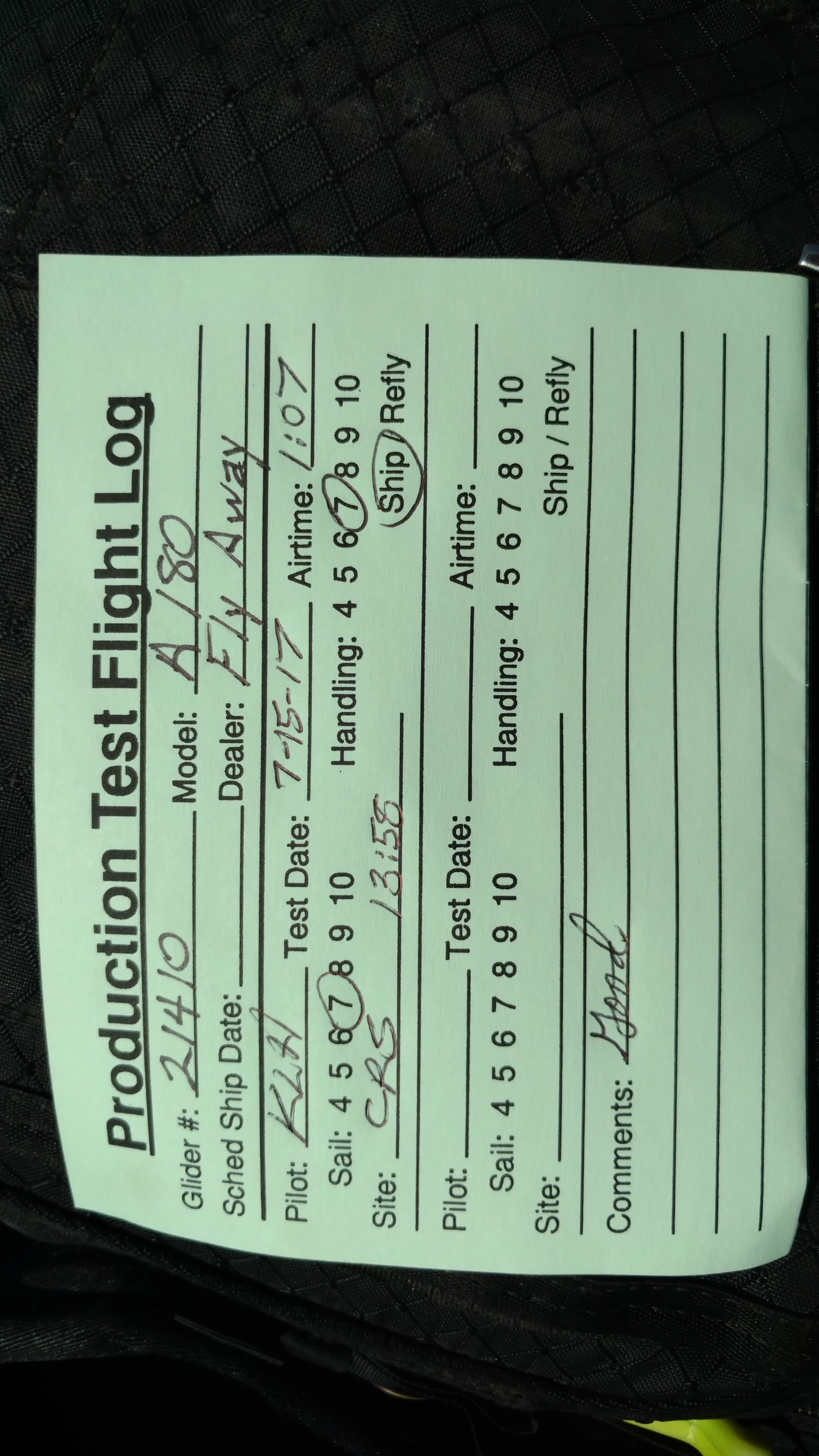 Good. Sweet handling. Bit of flutter between L tip and #2 batten. Tightened #2 batten string. Got down above the 750 before finding lift. Easy soaring. Flew low over Wisconsin Paul on Marshall and found a real boomer at the windsock; several hundred feet in a few turns. Dove to LZ. Good right-hand approach and landing 20 feet past the PG cone. |