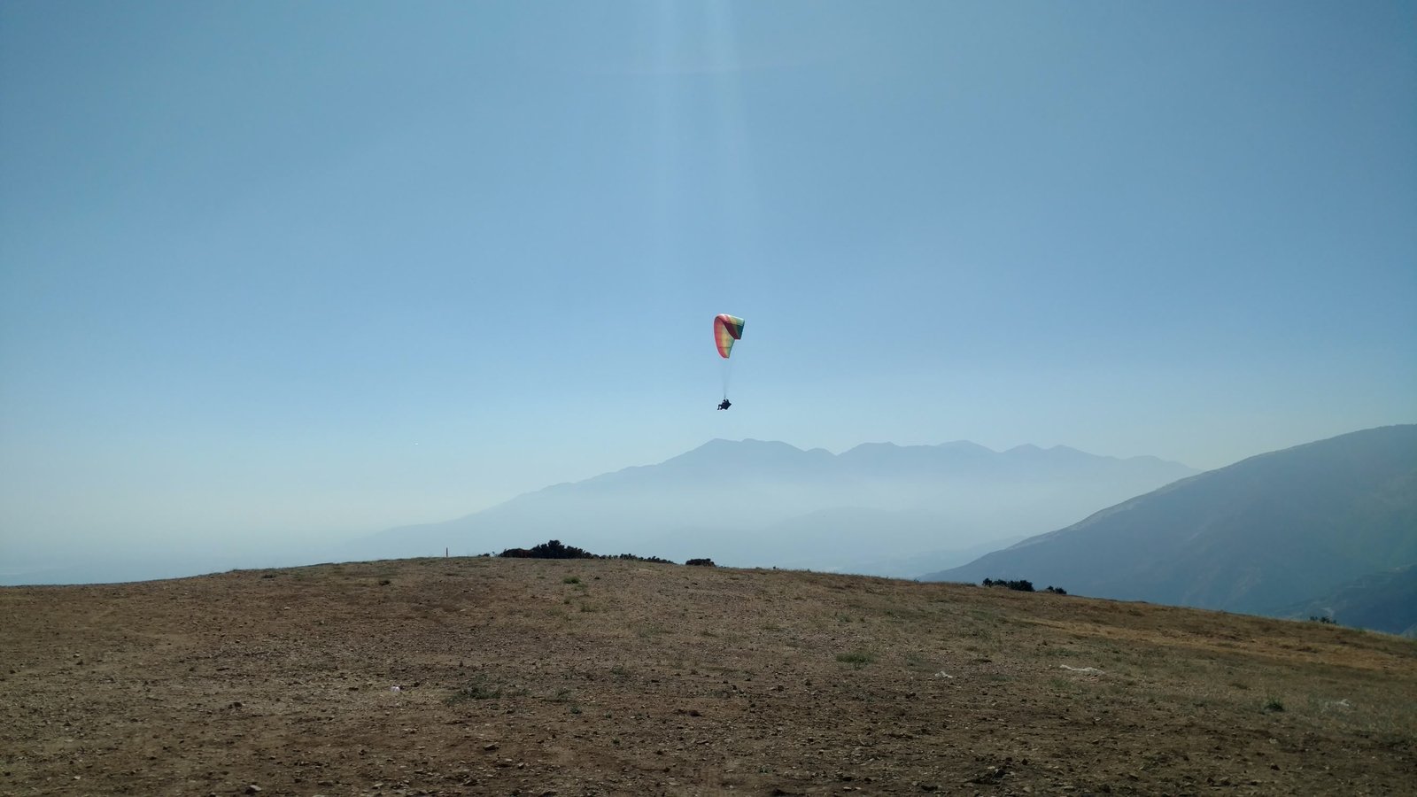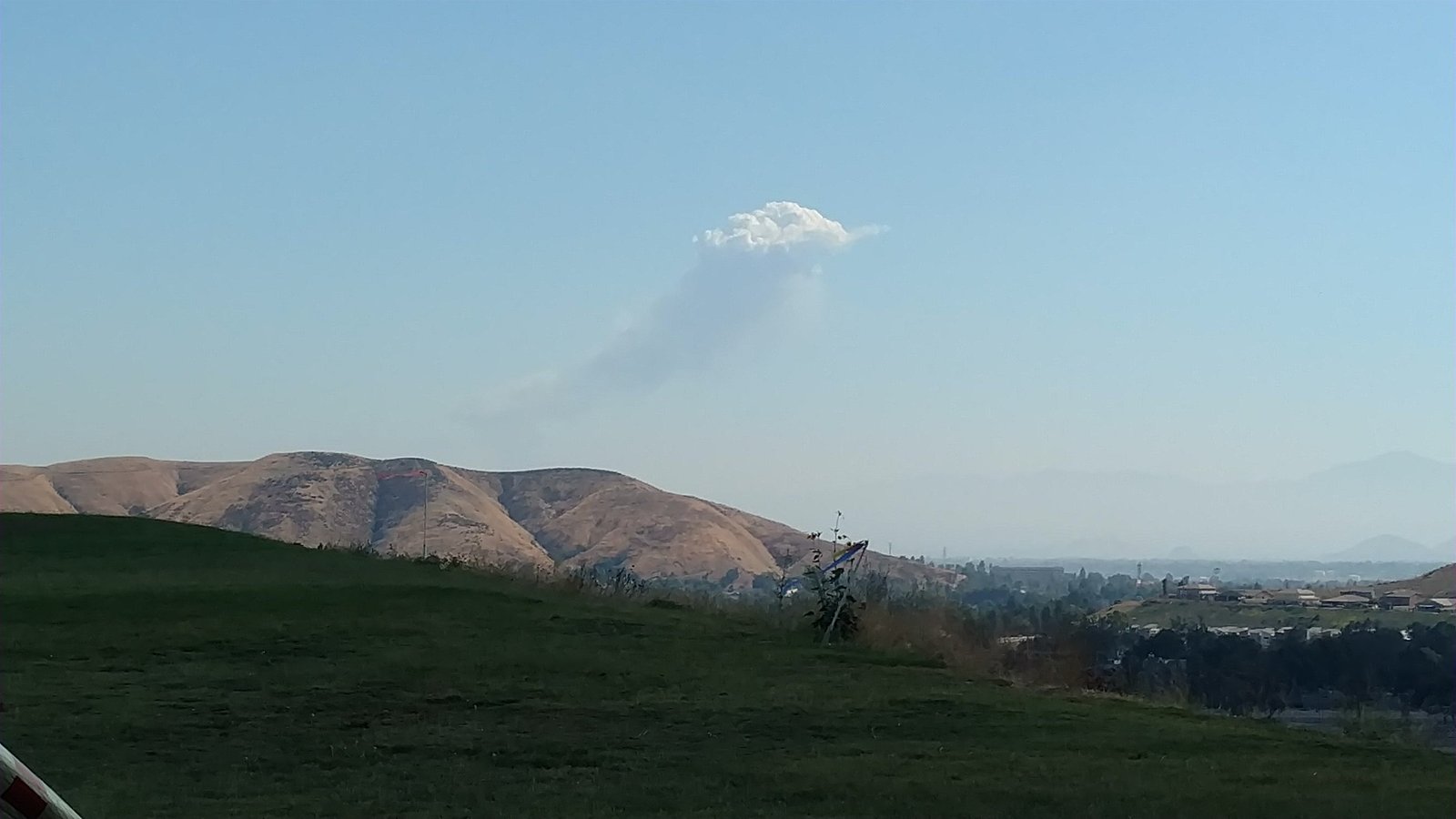 Good. Heat wave, high pressure, stable. Wanted to top land but was only above launch for the first few minutes. Scratched in wind bumps from terrain. Fun but frustrating. Got dumped from a tight core over the 350, dropped close to the bushes. Great landing, harness boot brushed the PG cone. GoPro on the keel. Fire at base of Pine earlier. |