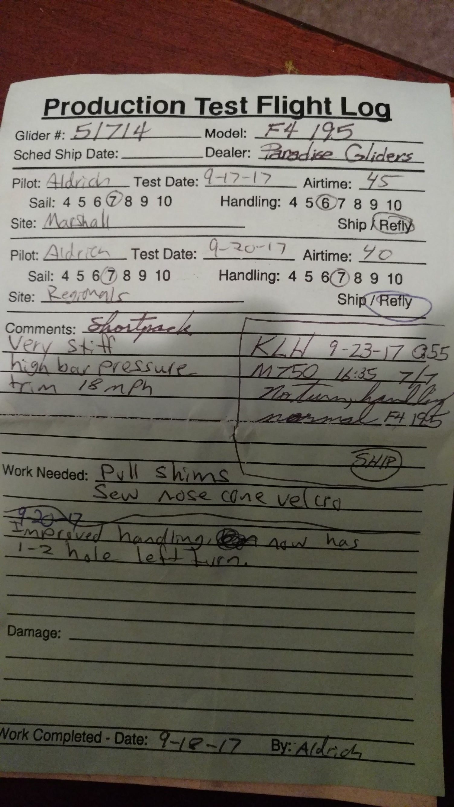 Flew with alternate reflex 8-9-10. TT to 34, lighter PP than regular reflex. VdVGT=57. Still good overall. Plummeted to 500 AGL at LZ then nice core to 4,500 MSL south of Marshall Peak. LZ still going off, dove and found sink to land in a sustained west cycle. Far right of PG cone but still closest. Dave Aldrich did his first test flight, F4 170. |