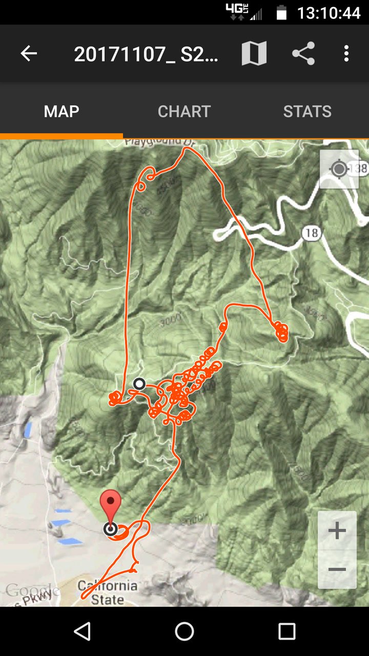 Clear and crazy warm, first of several onshore days to finish the year. Drove in to Marshall with the windows down. Flew in shorts, short sleeves. Put my gloves on once I got above 5k. Perfectly comfortable. Mitch arrived just after I did, the Grim Jim. Flew with them and Don from MT and some others (all PGs). A little squirrely for the first 5 or 6 minutes after launch - strong bumps I couldn't do a more than a third of a circle in. Got above launch and it was easy and smooth. 600-900 FPM to 5,600+ and then off to Crestline. Drift was out of the S to SE, 10-15 MPH. Up again at Billboard, went to Pine and after some similar bumpiness down close to the top I got to 6,200+ N of the top. Easy glide back to RGNLS and Cloud, had to concentrate to work the thermal W of Cloud heading NW. Got to UM again with a few hundred feet and it was bumpy and switchy. Thermal then a mellow cycle and did a tight CCW approach and top landed very smoothly heading a tad more SE than usual. Great fun. GoPro on keel. Bluetooth headphones playing tunes from my phone. Don had decided not to top land then changed his mind after I did it :) Mitch landed too. |