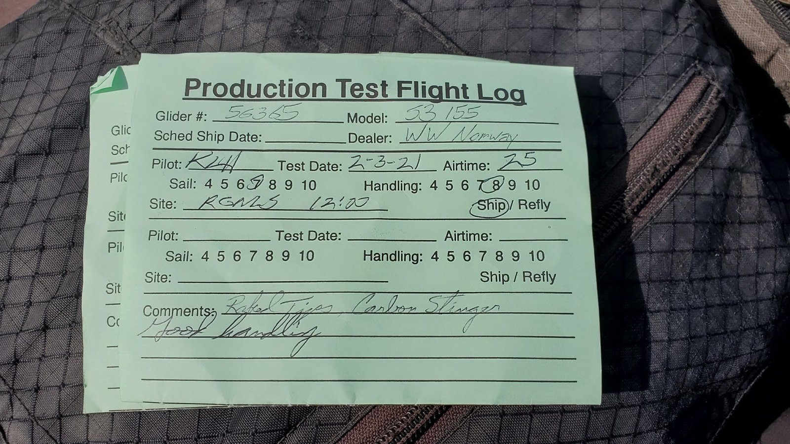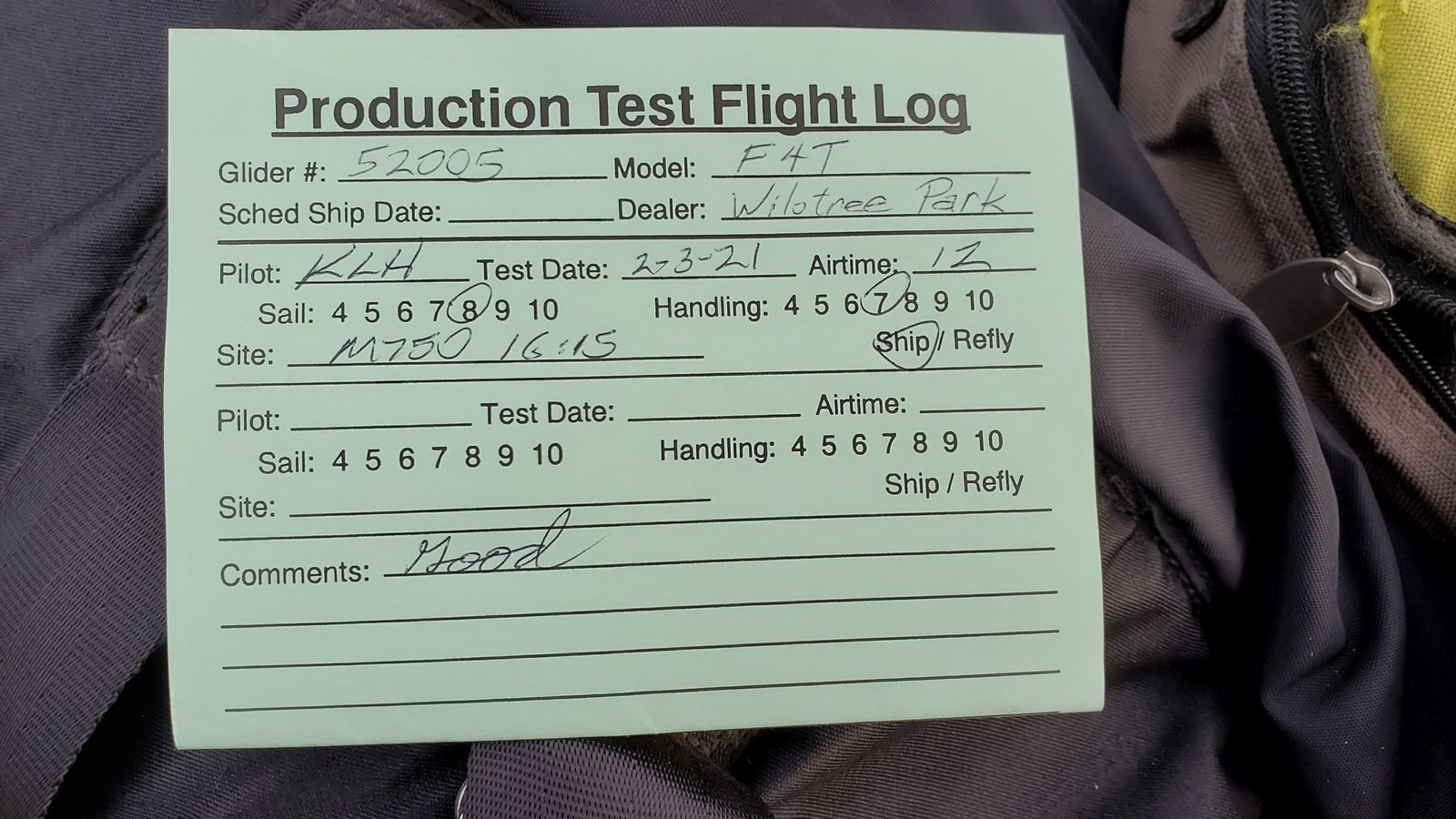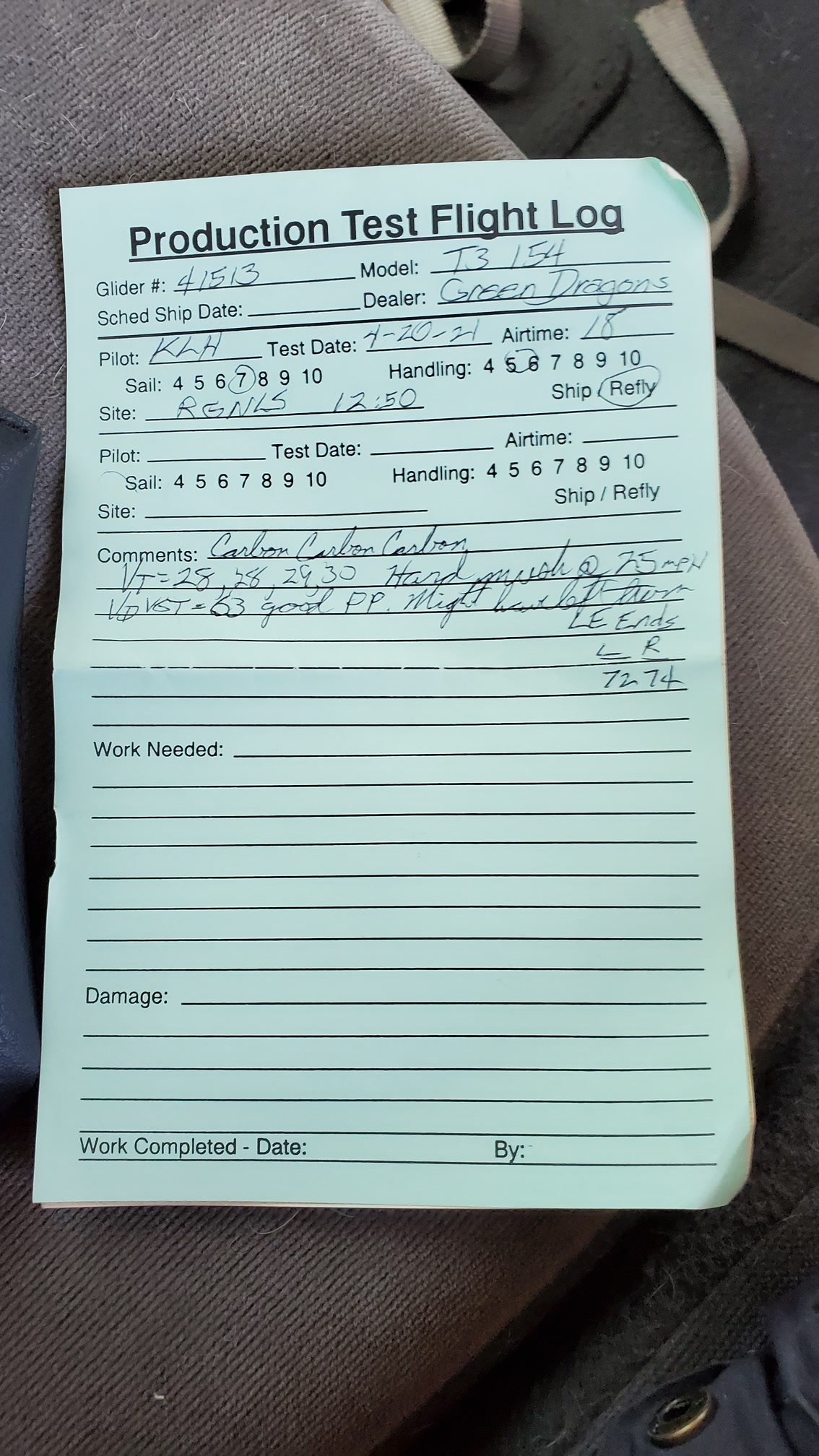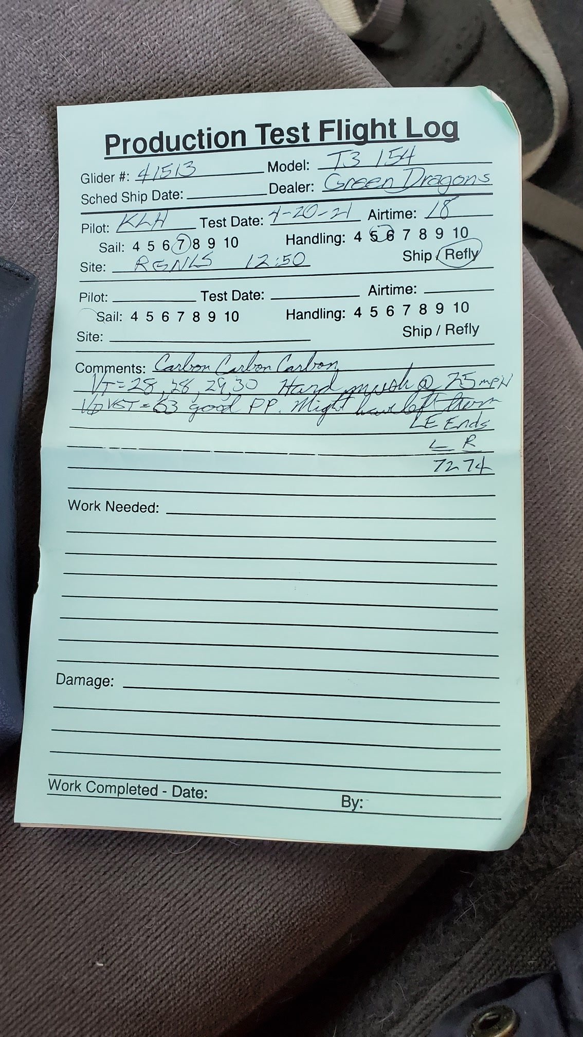 Raked tips. Good. Vt=23,22,24,22,22. Rowdy as hell. Windy. Got dumped after Launch while zipping up. 1,200 fpm at times. Tried to buzz Marshall but couldn't get low enough. Came in high, landed short.