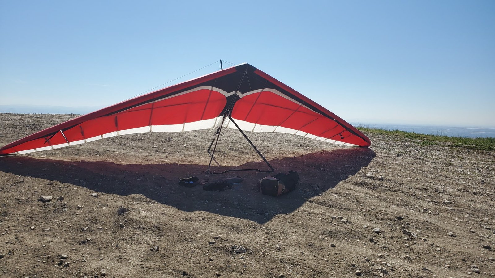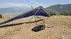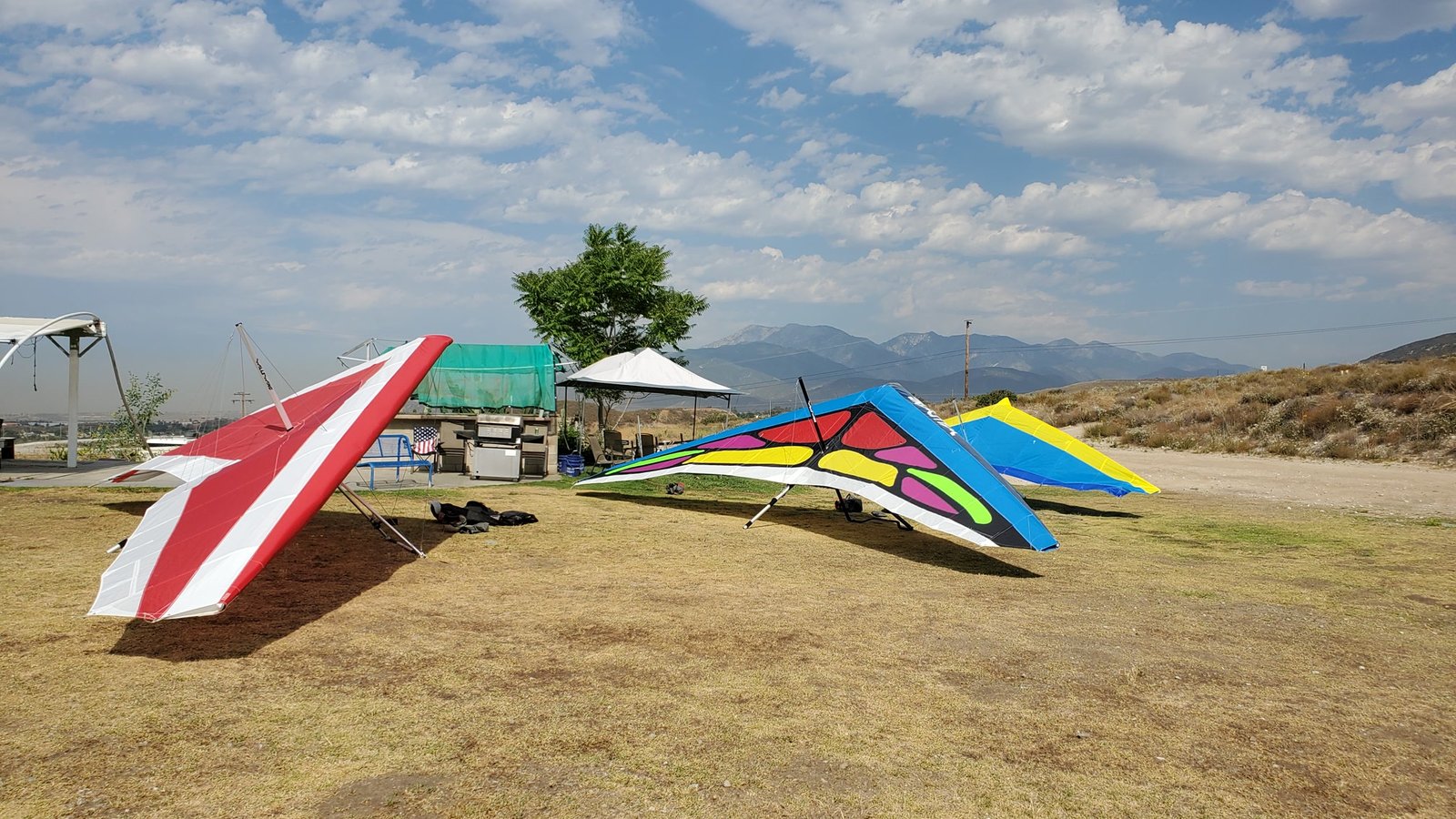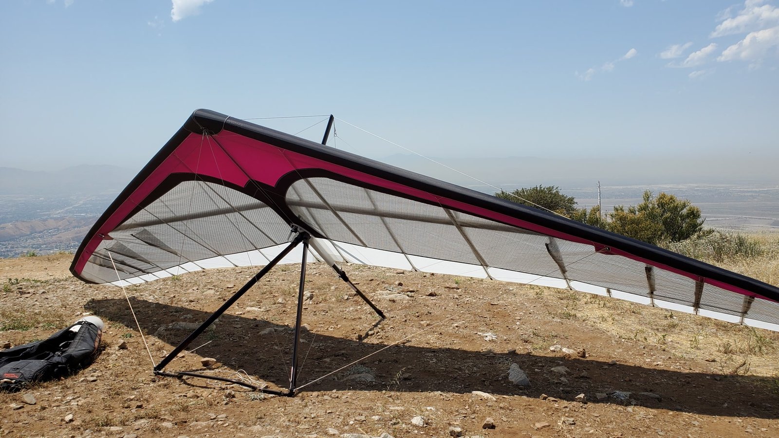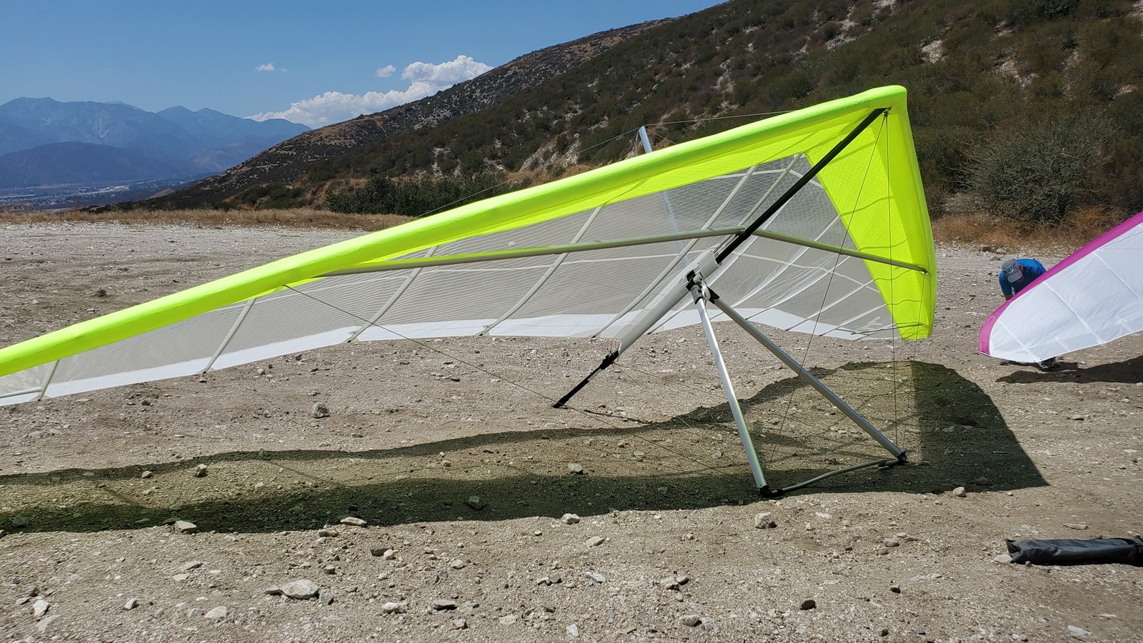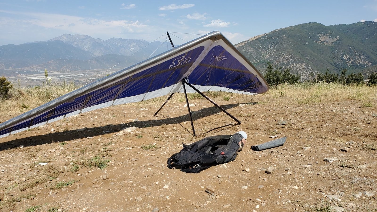 Nice breeze at launch, barely paused after walking over. Turbulent line near Last Chance but circling didn't work. Similar above the 750. Getting rolled toward the hill but nothing there when I'd turn and fly back through. Scratched what felt like dust devils below the 750 for a while to maintain altitude overall but much work and many dumps hillward. Bumpy approach and overshot cone in lift but good flare and landing. At least 100 degrees F and the sun was brutal breaking the gliders down.