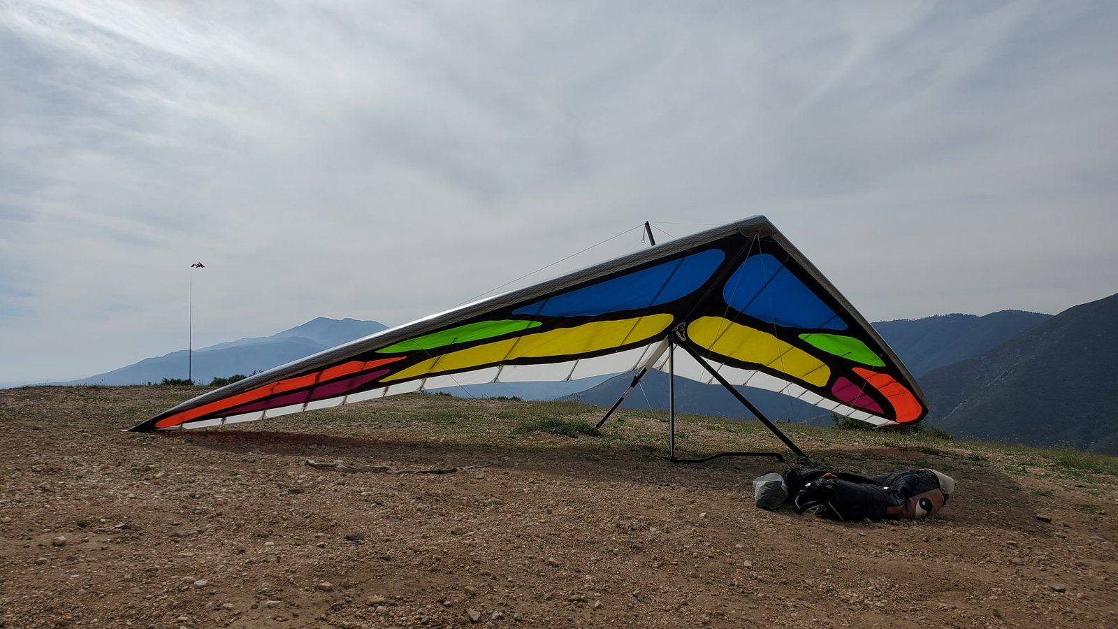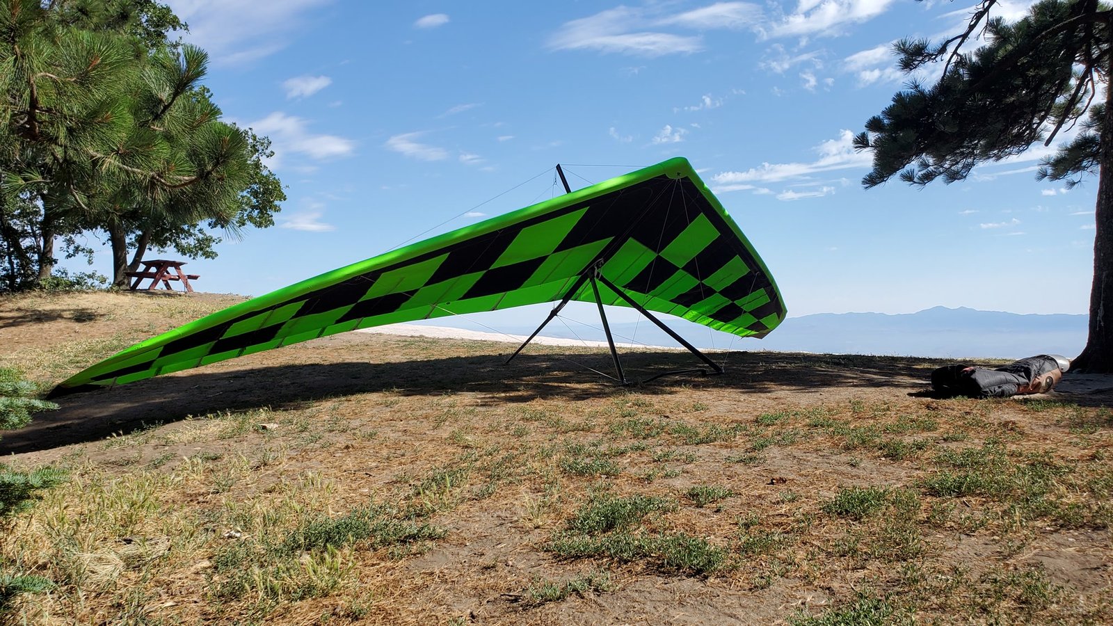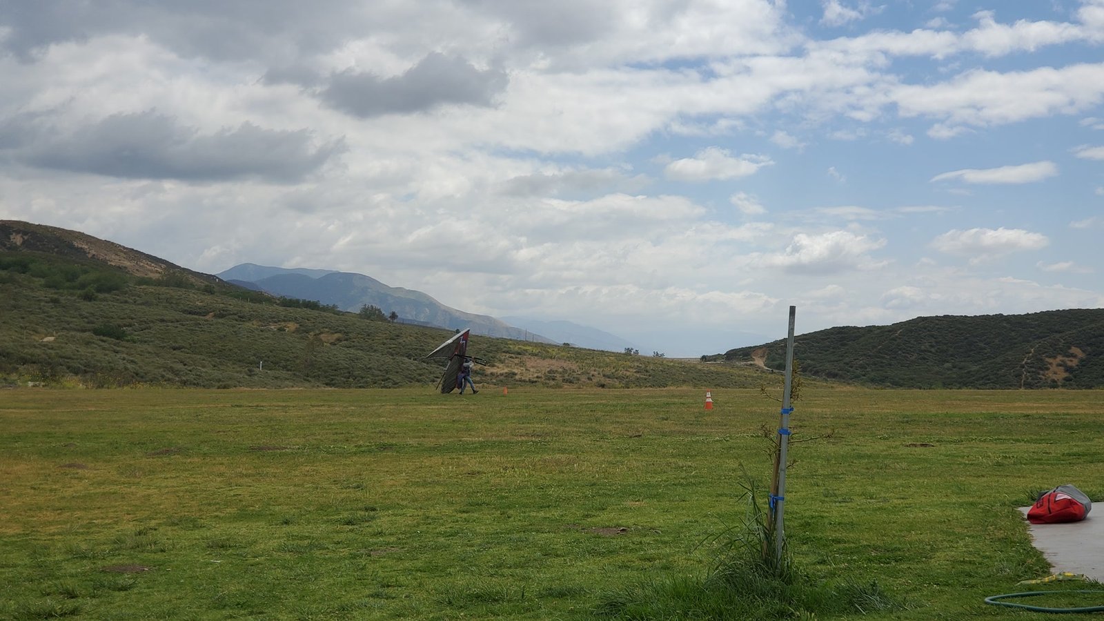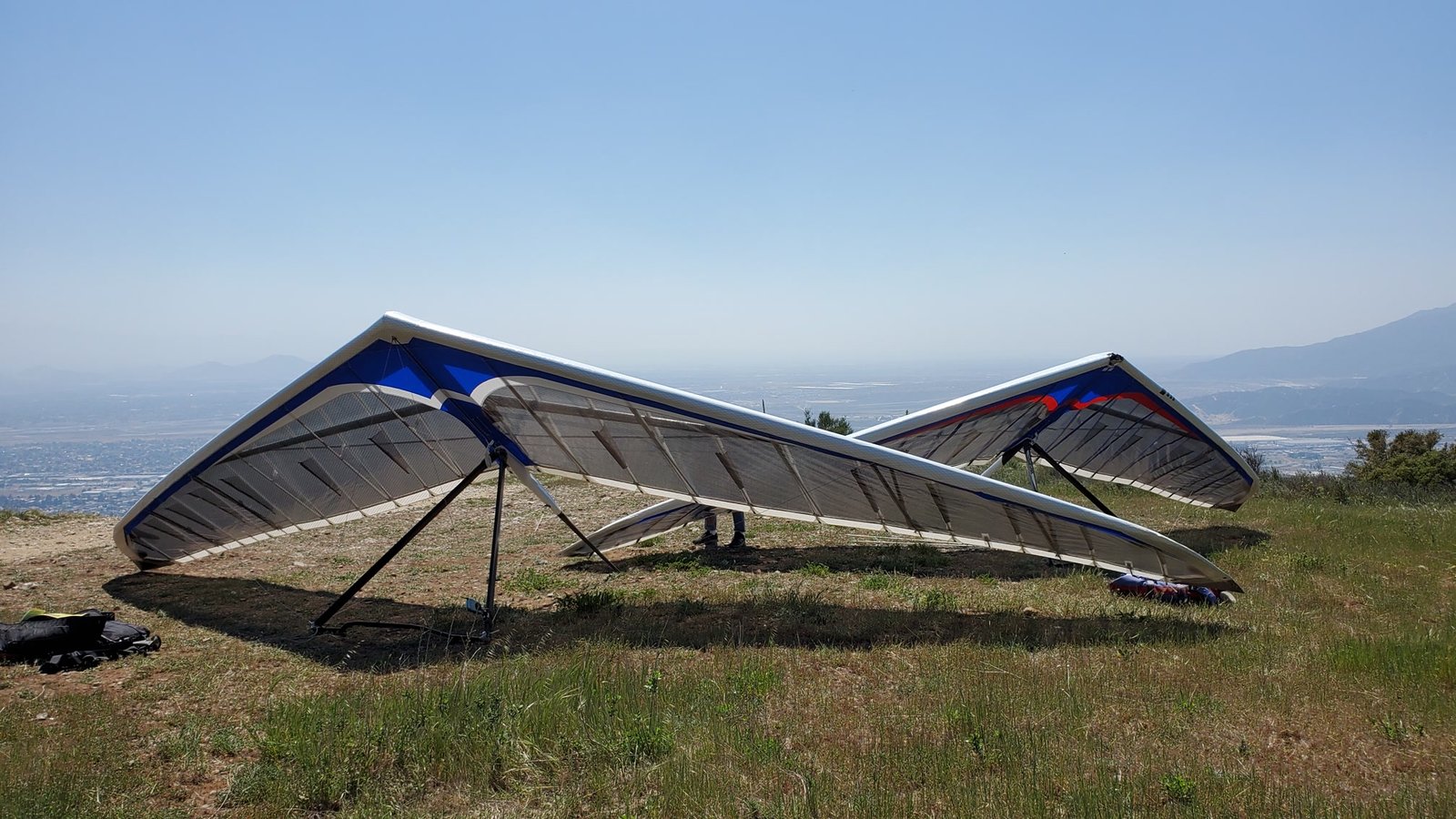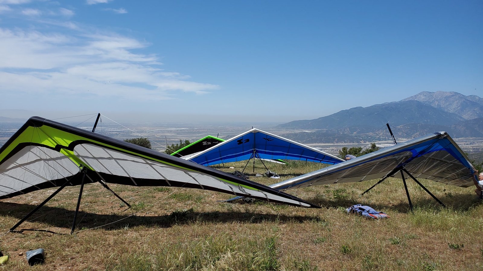 Nice breeze at launch, barely paused after walking over. Turbulent line near Last Chance but circling didn't work. Similar above the 750. Getting rolled toward the hill but nothing there when I'd turn and fly back through. Scratched what felt like dust devils below the 750 for a while to maintain altitude overall but much work and many dumps hillward. Bumpy approach and overshot cone in lift but good flare and landing. At least 100 degrees F and the sun was brutal breaking the gliders down.
