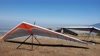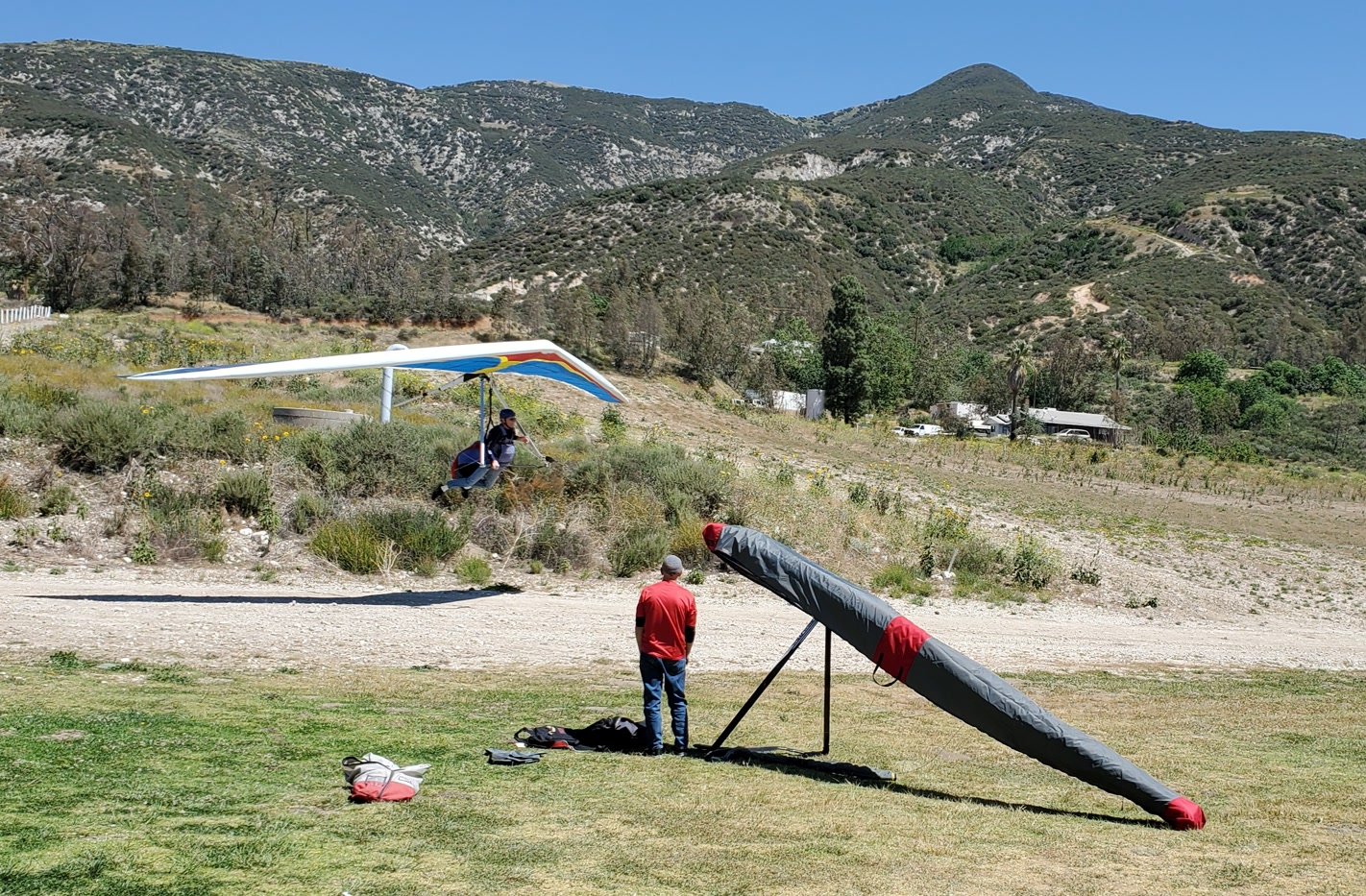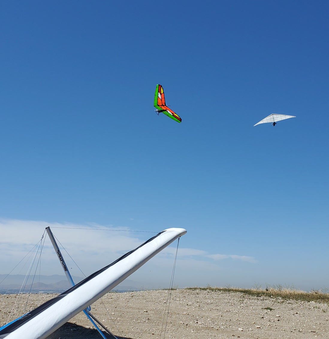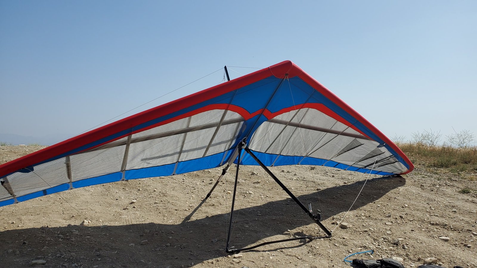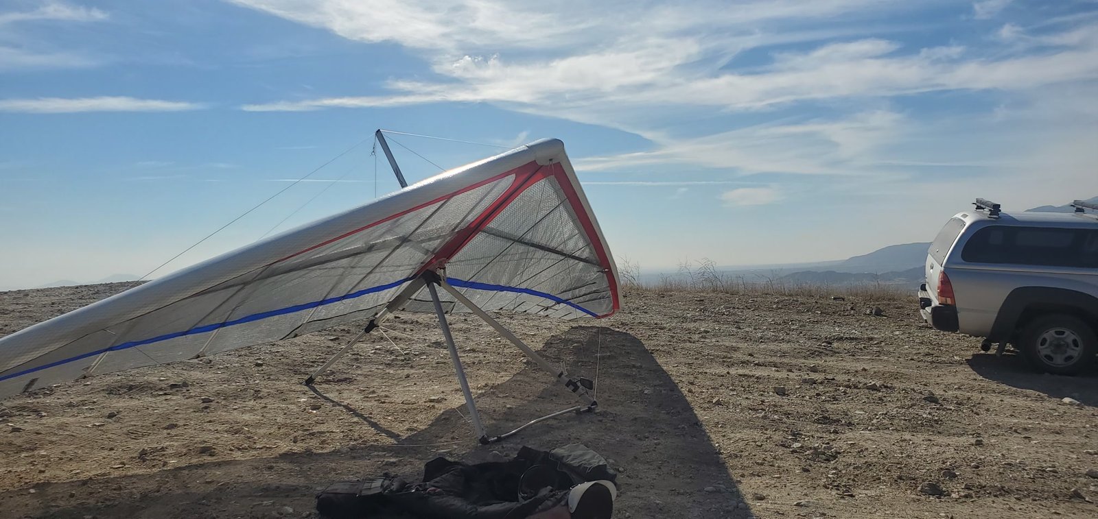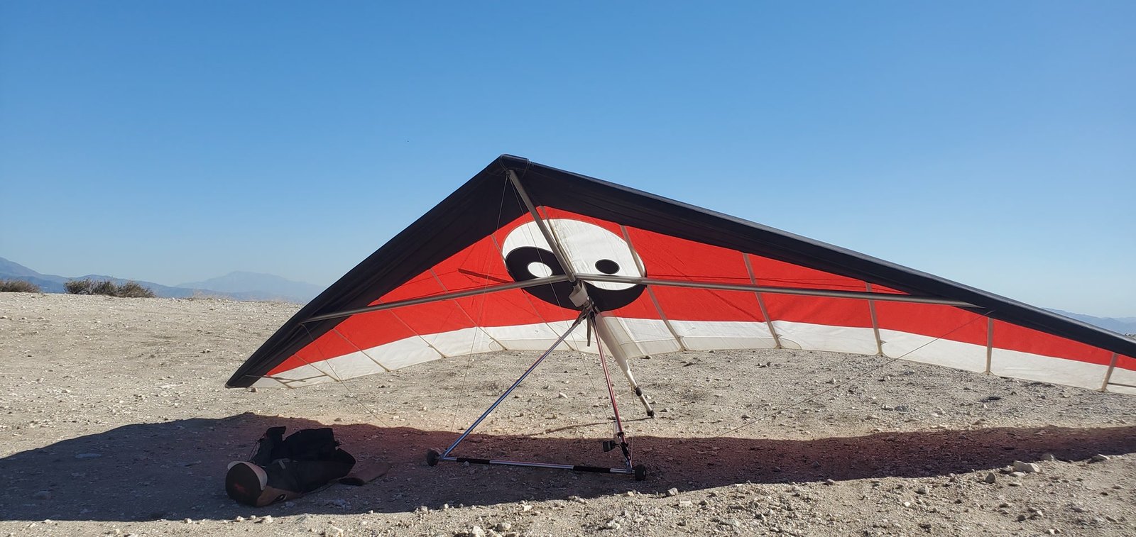 Nice breeze at launch, barely paused after walking over. Turbulent line near Last Chance but circling didn't work. Similar above the 750. Getting rolled toward the hill but nothing there when I'd turn and fly back through. Scratched what felt like dust devils below the 750 for a while to maintain altitude overall but much work and many dumps hillward. Bumpy approach and overshot cone in lift but good flare and landing. At least 100 degrees F and the sun was brutal breaking the gliders down.