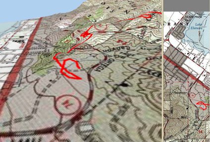 Cycling in again, a little less North. Soared at ridge-top height near launch for a few passes. Followed zero-sink straight out over the big house below launch, then went across to the South spine, somewhat low. Caught an actual thermal over the spine and climbed from 2400 to 3400 in it with about 15 circles. Dove to the LZ and did a left-hand approach, for something different. I flew up the cleared slot, basically pointed at launch. I turned left and crossed the trees, then left again into the slot between the trees and the hillside. Left around the last trees put me in the same spot I'd been hitting with the right-hand approaches. The drawbacks to this left-hand approach are the downhill glide, losing sight of the target, and tending to float near trim downwind of the trees. But not a big deal, really. Normal. |