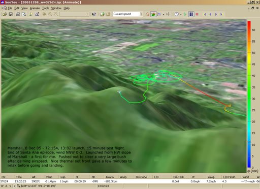 The top of Marshall was right at the interface of the lower weak onshore and the upper weak offshore. I walked down to the lower front launch and waited while it puffed down from the right for a while. Mike Meier and Rob McKenzie soon flew by, having launched from the NW slope of Marshall. I thought about launching in the almost-nil crosswind but thought maybe it was better on the NW slope, so I hiked back up to the top. There was almost nothing on the NW slope, and the crowd related how Mike had run very hard and barely cleared the large bushes below. I stood there for a long time, feeling no cycles worthy of the name. Eventually I got out of my harness and took off my heavy gloves and walked down to examine the terrain I'd be running down. I found that where there was a little shrub I was concerned about was actually a nice change to steeper slope, and at the same time a decent cycle came up the slope. I got back into my harness (which was never unhooked from the glider) and put the gloves back on while another cycle came through. I picked the glider up as high as I could, shucking my shoulders several times to keep the harness straps tight. A cycle started and I started forward, accellerating to full run in a few steps. My feet left the ground when I hit that little drop-off, and I could see that my glider would take me straight into the large burnt-out bush below; this was not unexpected. I held the bar in about 3 mm above trim and let my airspeed build. At about six feet from the bush I pushed out about an inch and cleared it nicely, though I did pick my feet up a little for good measure. Banking left I found the air to be smooth and without the sink one would expect in stronger North flow. I actually worked some lift out in front of the windsock and got higher than launch briefly. Then I did a quick VG tight speed run and a mild wingover to celebrate (this T2 had the uncoated 5/64 inch racing wires, so actual aero was out of the question). It was bouyant down by the LZ, and blowing in from the South once in a while. I landed in nil wind heading South. Twice before I've stood on that NW slope with a glider, in stronger Santa Anas, and both times I declined to launch. Those would have been easy in comparison to today's launch, but I doubt the first few minutes of the flights would have been as pleasant. Good. Vd VGT=65. Some PP (3-8 pounds). |