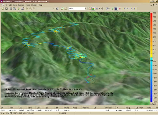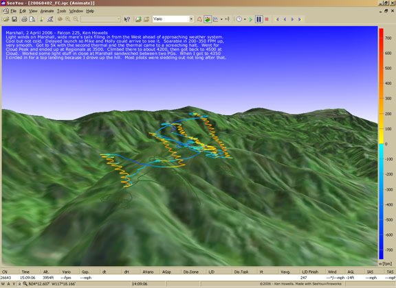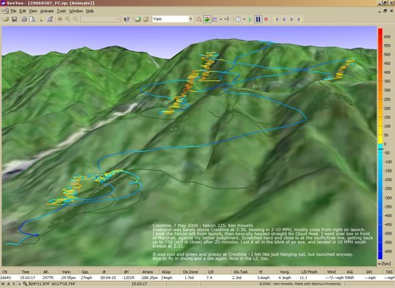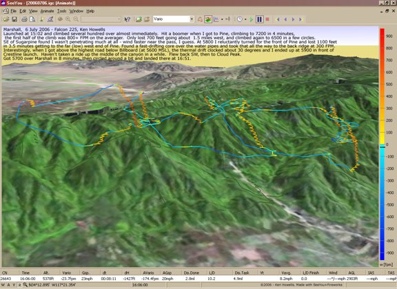 Good clear, windy, warm day. Reportedly 25 at Crestline launch mid-afternoon. Launched the 225 from the upper SW launch at Marshall, elevatoring up 150 feet after about 6 steps. Got a few hundred over, drifting back fast. Got 4100+ at Cloud Peak and Regionals. Spiralled down to Regionals then took a surprisingly long time getting back up from about halfway between Cloud Peak and the 750. Wind was blowing the thermals apart or downwind, but the faces weren't all that soarable. Headed for a medium gaggle east of Marshall and then got up and went over to Cloud again. A nice narrow but well-defined core came through and I got to 5600 drifting halfway back to Crestline, with a couple of HGs below me helping to mark the core as it drifted quickly. Parked in front of Crestline and Paivika and slowly ascended to above 6000. Went to Pine with Hoffbrow for a while, then back to Regionals and Marshall. Was only getting 4250 most of the time at Marshall. Top landed into moderately strong but smooth flow, just after Randy, at 5:41. |