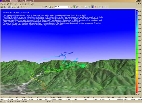 Nice pre-pre-frontal February day with a high medium-thin cloud layer coming in from the west. Not enough sun to make a shadow anywhere. Launched Marshall at 14:20 and worked weak thermals in close with a bunch of PGs, mostly over Marshall. Got over 5200 early on, then just below the peak 3 times. Thermals were mostly 100-300 FPM, from the SW low turning to SE above 4500 and slowing down. Wanted to top-land, since my truck was on top. At 15:20 I got back above so I could land, but hung with the thermal and eventually got to 5600, dashed back to Crestline for a few passes and a wingover, then back to Marshall to land at 15:35.Sweet! |