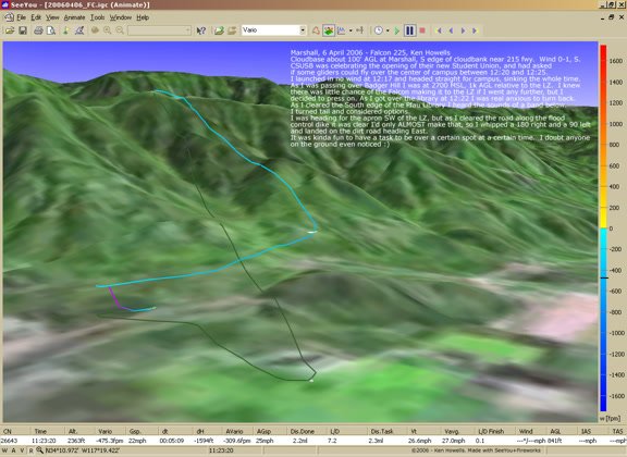 Cloudbase about 100' AGL at Marshall, S edge of cloudbank near 215 Fwy. Wind 0-1, S. CSUSB was celebrating the opening of their new Student Union, and had asked Rob McKenzie if some gliders could fly over the center of campus between 12:20 and 12:25. McKenzie gave free rides up the hill to participants, and I bit, as did PG pilot Gene. I launched in no wind at 12:17 and headed straight for campus, sinking the whole time. As I was passing over Badger Hill I was at 2700 MSL, 1k AGL relative to the LZ. I knew there was little chance of the Falcon making it to the LZ if I went any further, but I decided to press on. It was hard to tell if there was anything going on down there, and as I got over the library at 12:22 I was real anxious to turn back. As I cleared the South edge of the Pfau Library I heard the sounds of a band below, and spotted the portable canopies in a row on the ground. I turned tail and considered options. Before launch I had decided that the last-resort bailout was the open area just North of the Northern-most parking lot, but wanted to get a lot closer to the LZ than that. I was heading for the apron SW of the LZ, but as I cleared the road along the flood control dike it was clear I'd only ALMOST make that, so I whipped a 180 right and a 90 left and landed on the dirt road heading East, since the early day winds often flow from that direction. I was ready to run, and ran hard. Turns out it's a little uphill right there, and I was standing holding the glider after about 7 steps. Gene had to turn back earlier than I did, and landed near the fork in the road. It was kinda fun to have a task to be over a certain spot at a certain time. I doubt anyone on the ground even noticed :) As I was breaking the Falcon down along the road, Hoffman pulled up, so I got a lift back to the LZ. Thanks to Mark and Rob for the rides. |