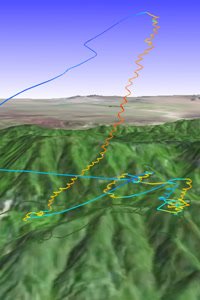 Worked the bluffs here and there. Got a tiny one at the green gap in the bluffs, but it eluded me; Mike M. had just launched and got up in it. I hunted some more and found one at the east end that got me above the 750, then east of there another took me all the way to 4k MSL over 8 minutes, drifting to the NW. Dove to the LZ and landed at 12:47. Very nice. |