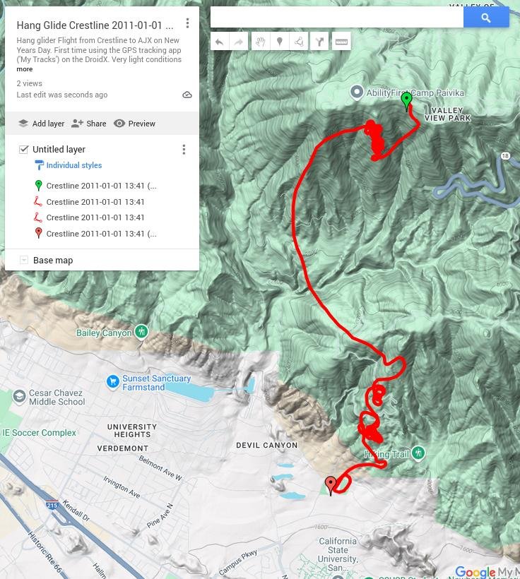 Flight from Crestline to AJX on New Years Day. First time using the GPS tracking app ('My Tracks') on the DroidX. Very light conditions with high clouds moving in, rain expected for the next few days. Mostly zero wind at Crestline. I launched into a little cycle and found a weak but long-lasting thermal on the spine to the west. Got to 5,450 with it. Sank from BB to RGNLS, then scratched west of the 750 for another extended period. Good SSW landing in 0-2. The track was immediately viewable on the DroidX, with an elevation side-view and times and speeds. The track was very smooth - nice circles. Recording interval defaulted to max. Battery lost about 50% of charge for the 1/2 hour the GPS was on. Will record at longer intervals in the future. Emailed myself the kml right from the LZ. Sent pix to Facebook too, took video and some panorama shots. I'm lovin' this gizmo! I had pegged the flight at 25 minutes by glancing at my watch. The track said 26:45 'Moving Time', which counted walking to launch and to the breakdown area. Pretty cool! Other numbers: Max Speed: 37.06, Avg. Moving Speed: 23.96 mph, Max Elev: 5,526', Min Elev: 1,687', Elev Gain: 624'. Regular F3 with reduced anhedral - some instructors had asked for a less responsive version for brand new pilots. I mostly noticed that fine roll adjustments while thermalling took a little more effort than I expected with a Falcon. |