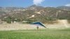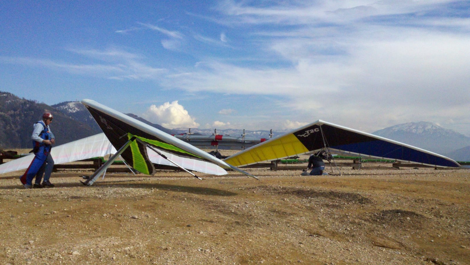 Onshore window between sustained Santa Ana events. It blew in for a couple of hours the day before, late afternoon. Today started out blowing in and the RUC forecast siad it would blow down at Crestline around Noon - this proved accurate. It was hazy down low and the cycles were weak at Regionals at 11:30. Standing on launch I could tell there was a thermal off to my right; when it got closer and in my right-rear quadrant there was a good cycle to launch in. Worked choppy lift near the hill right over the flatter section SW of Regionals for quite a few turns before I ventured further SW and found the real core. Was able to really check out the wing finally, though I had a pretty good idea before that. Did a speed run to Cloud Peak and then went and landed because we wanted to be sure to get the second round of T2Cs flown before the north pushed through. The windsock and flag were limp but the ground handling streamer show some SW, so I purposely went a little long on final to have a little wind for flare. Good landing. Good. Good PP VGT. Mild RT turn - twisted bolts 1 turn each tip |