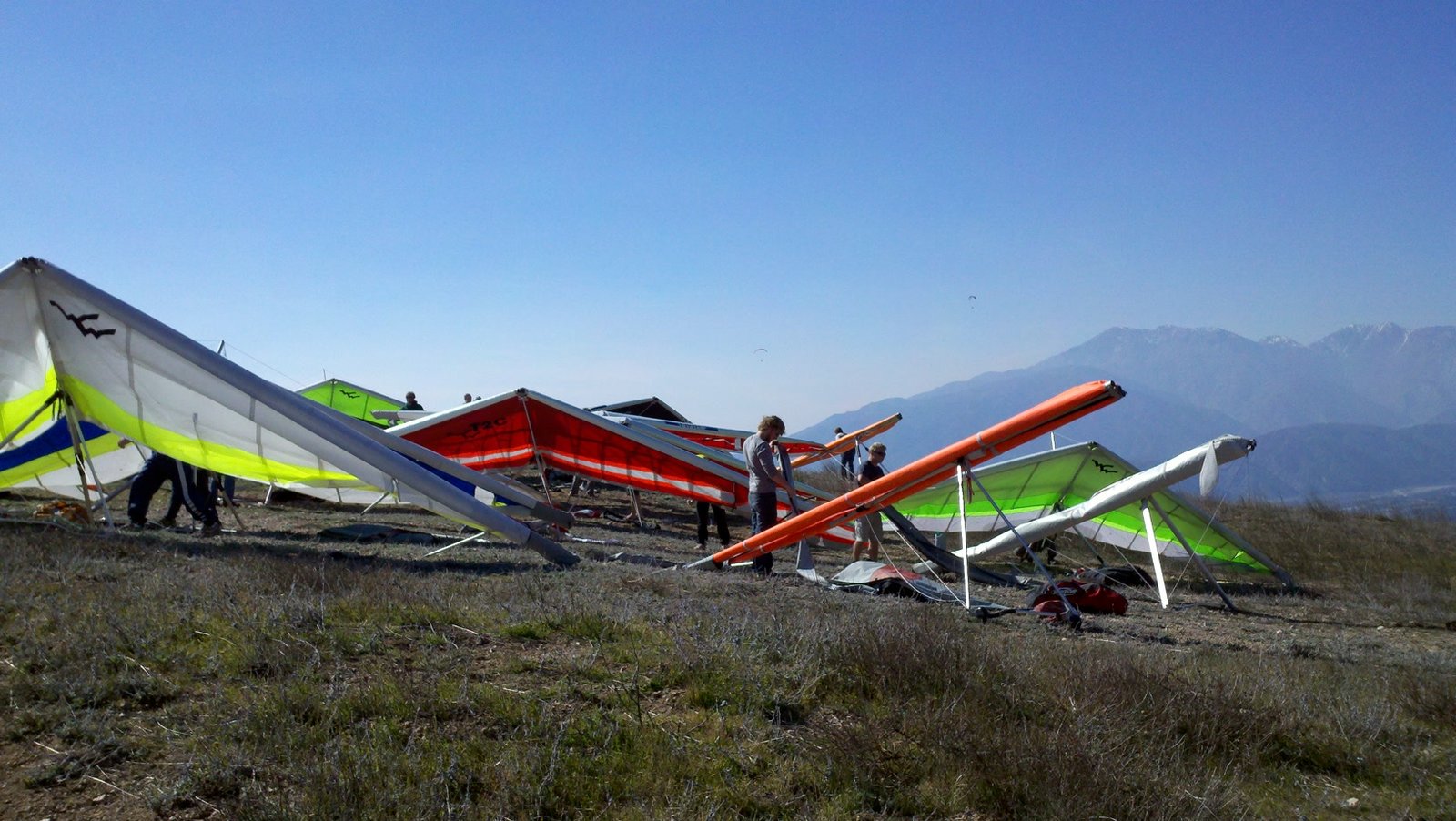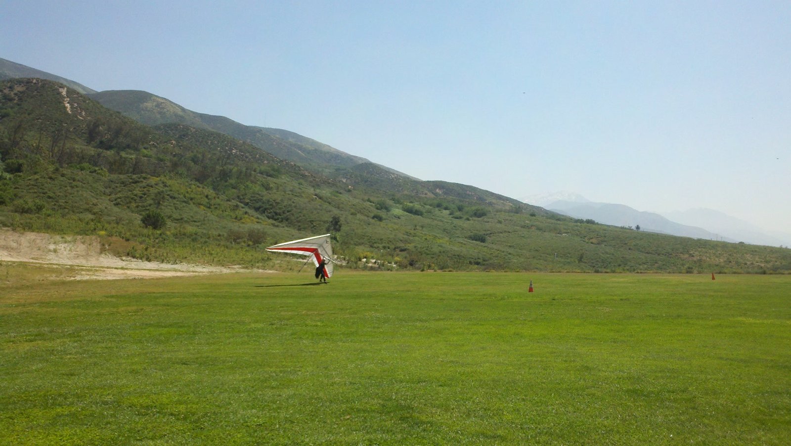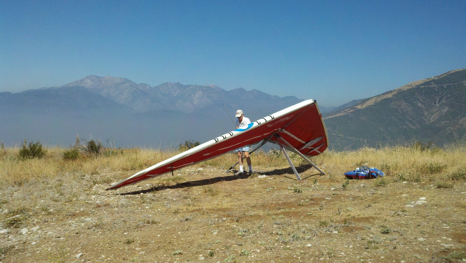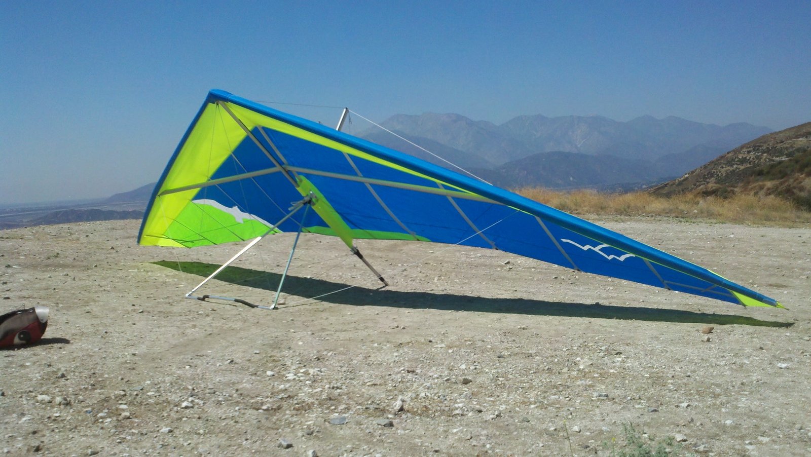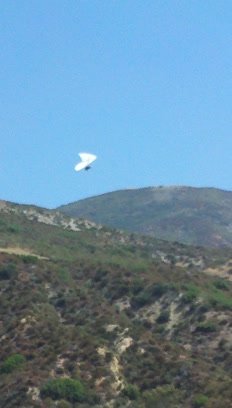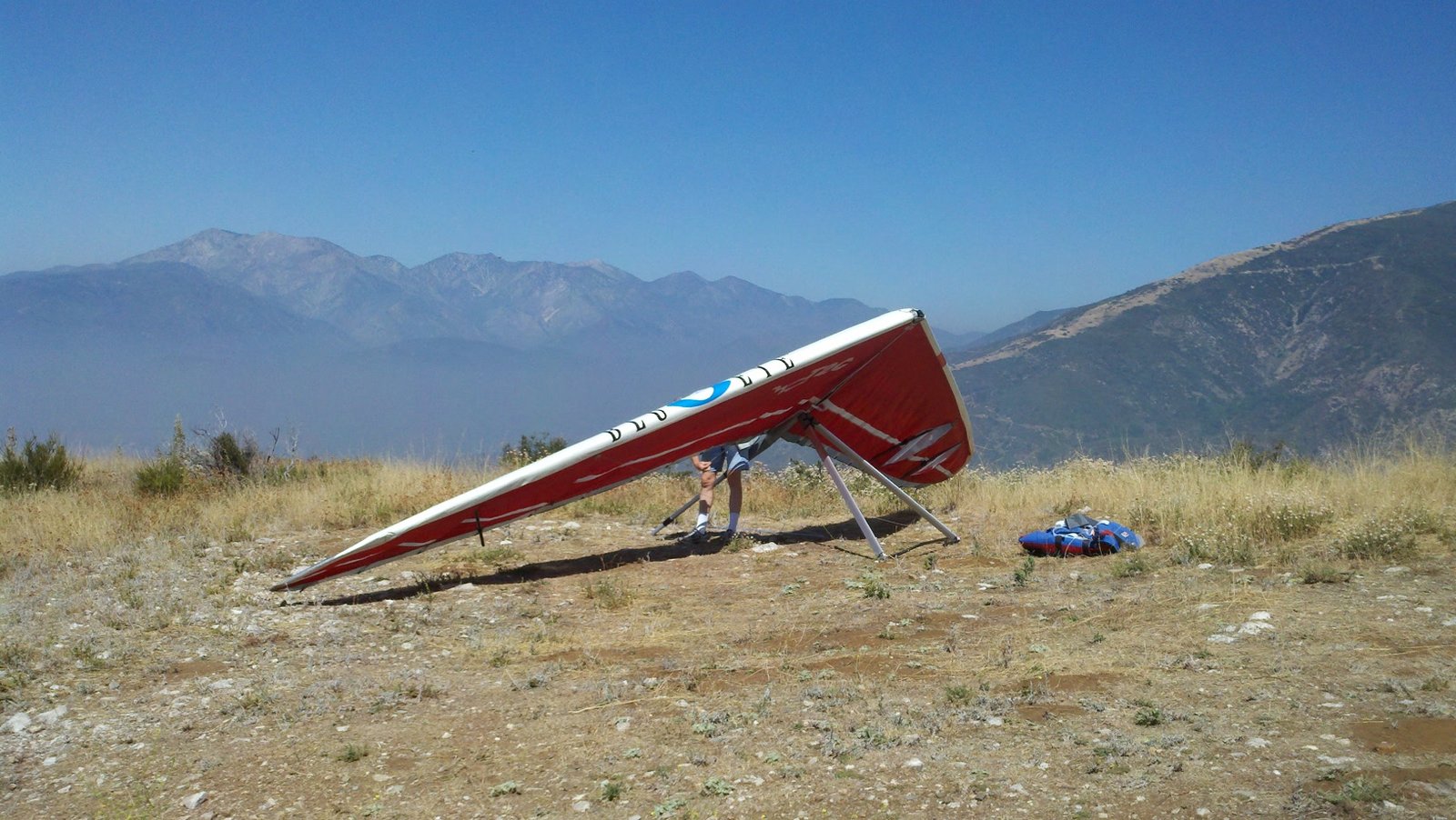 Clear and warm onshore day between Santa Ana episodes. Calm at the LZ and already a steady 5-10 SW at Regionals. Quite soarable. Nosecone wasn't attached so I flew straight to the LZ and landed. I had been ready to start my preflight and stopped to take a couple of pictures first, then re-started the preflight with the hang loop instead of at the nose area. Flew without attaching nosecone. |
