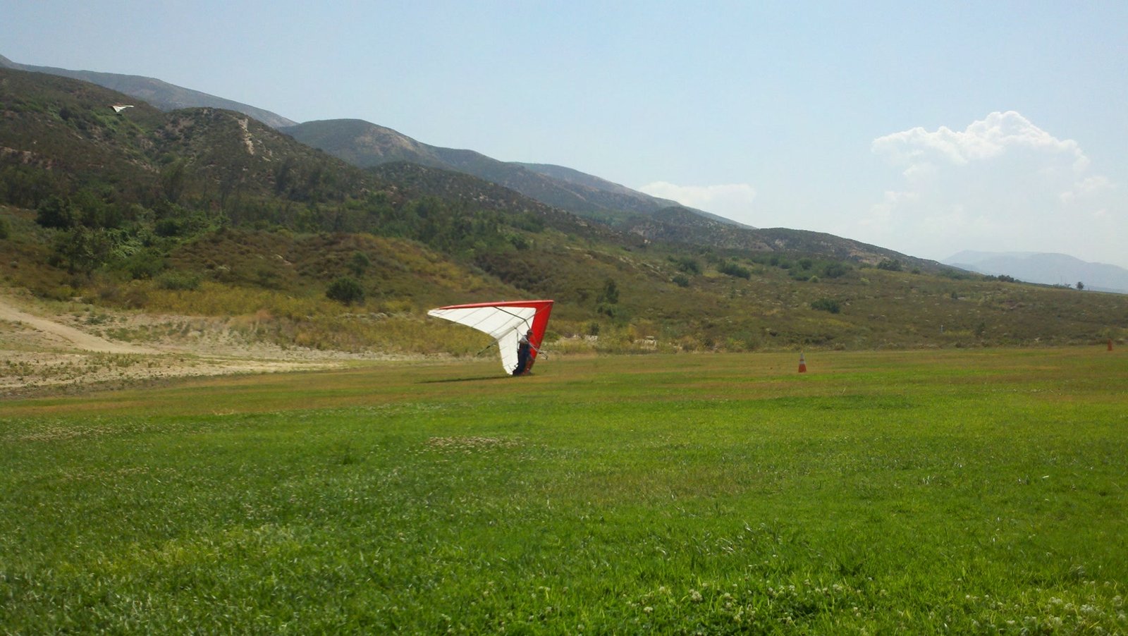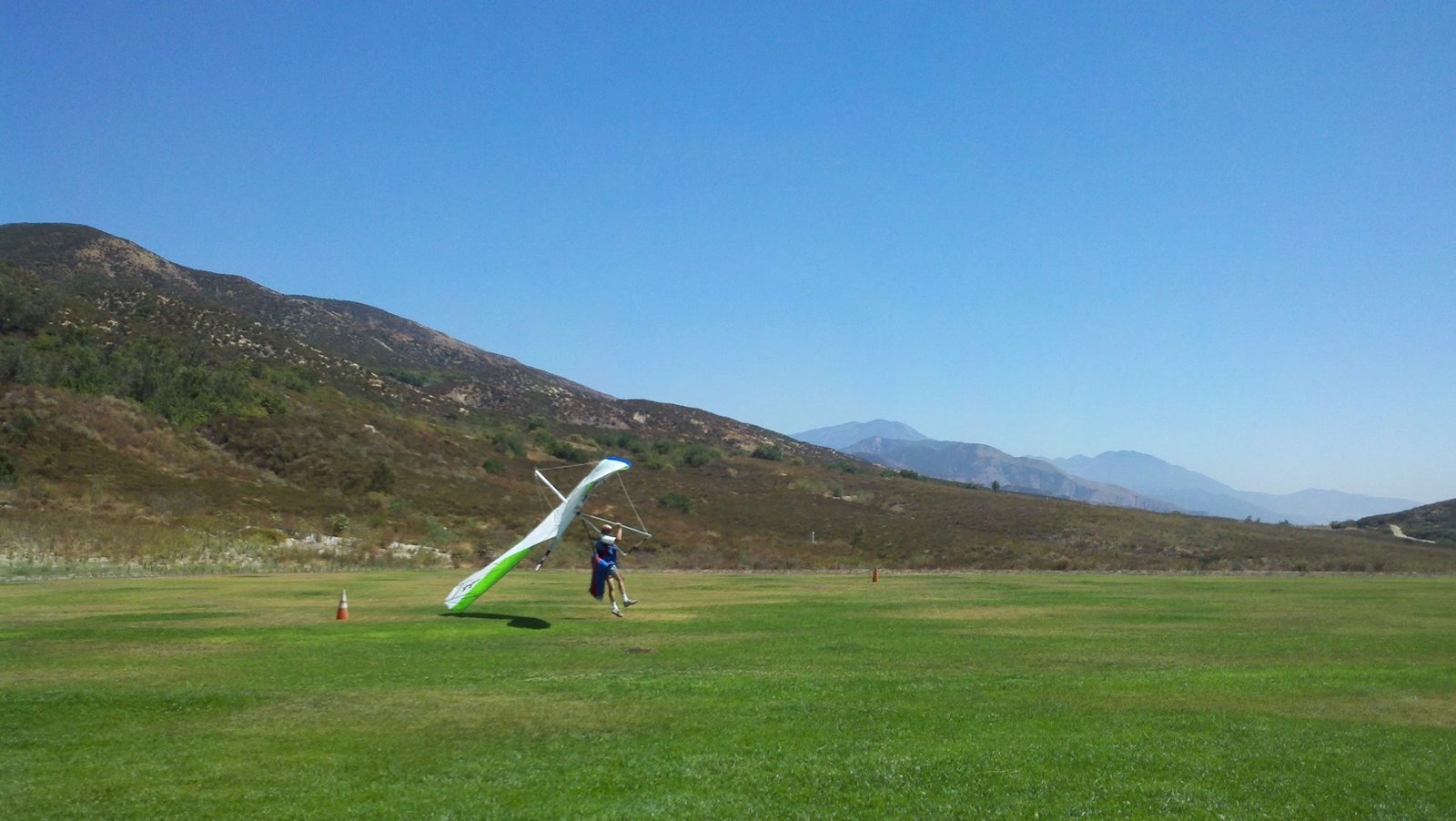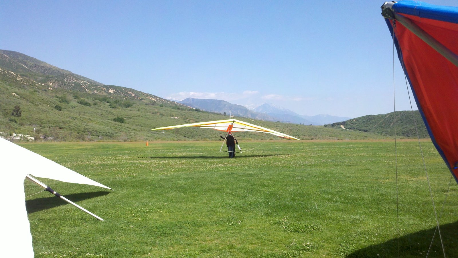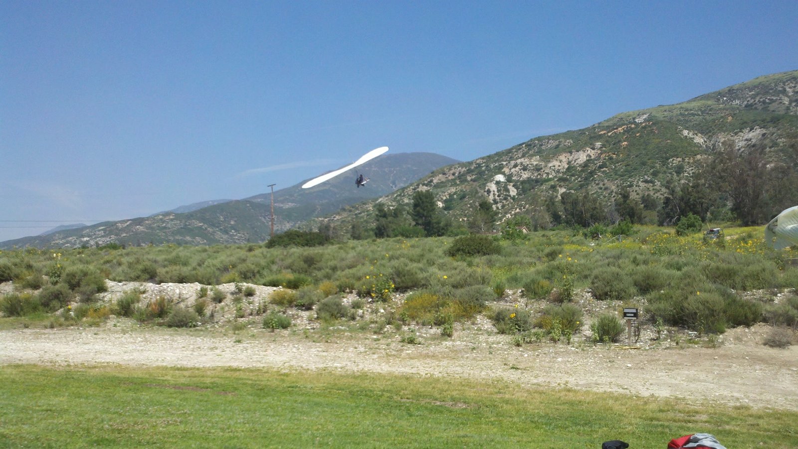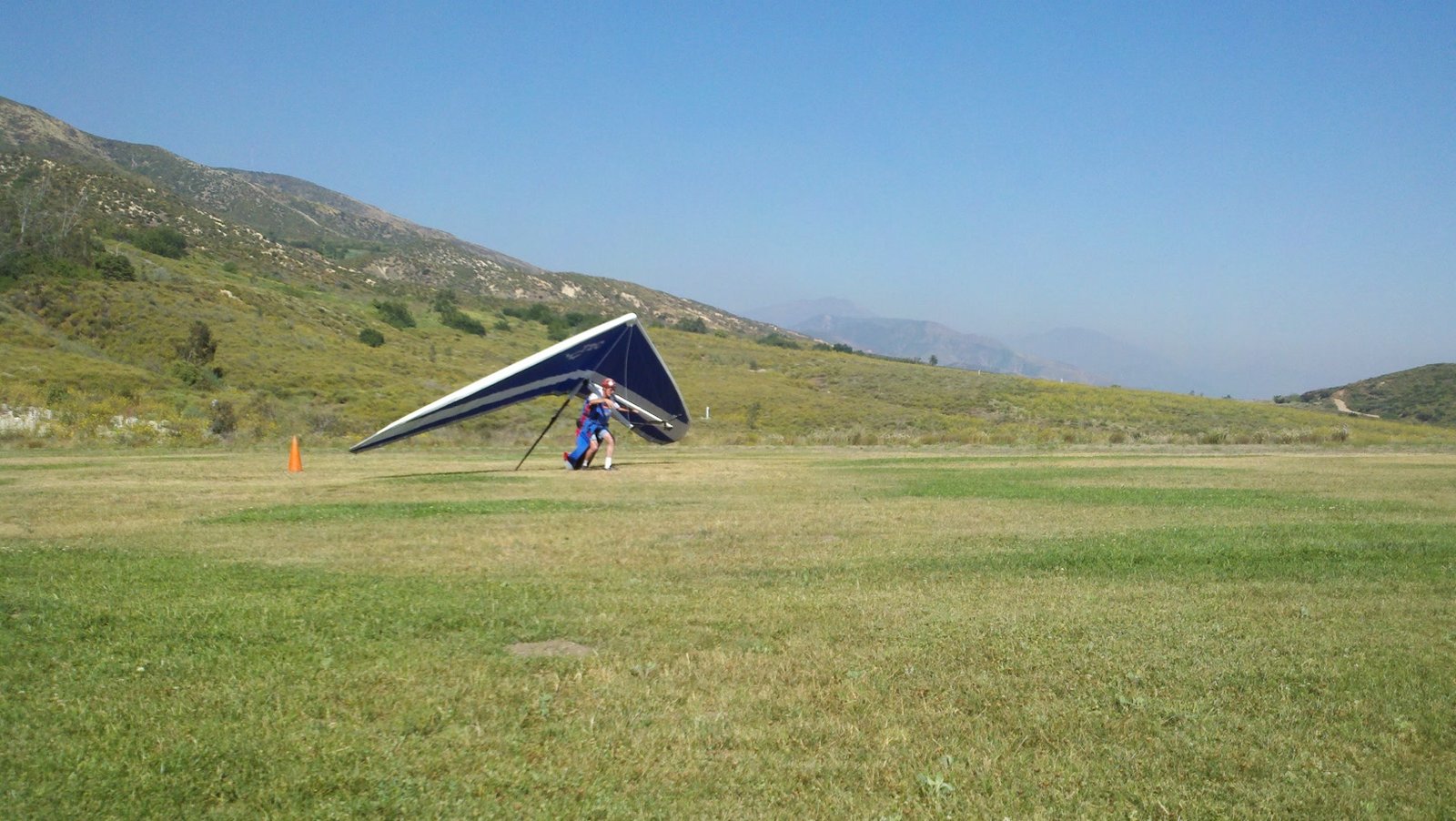 Clear and warm onshore day between Santa Ana episodes. Calm at the LZ and already a steady 5-10 SW at Regionals. Quite soarable. Nosecone wasn't attached so I flew straight to the LZ and landed. I had been ready to start my preflight and stopped to take a couple of pictures first, then re-started the preflight with the hang loop instead of at the nose area. Flew without attaching nosecone. |