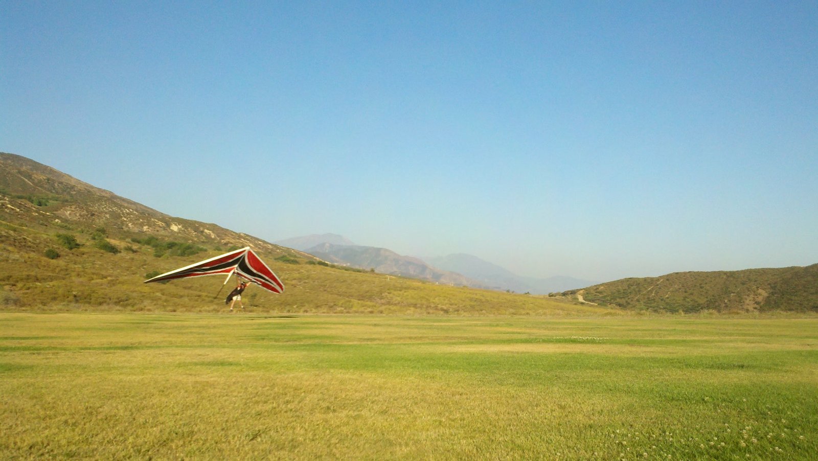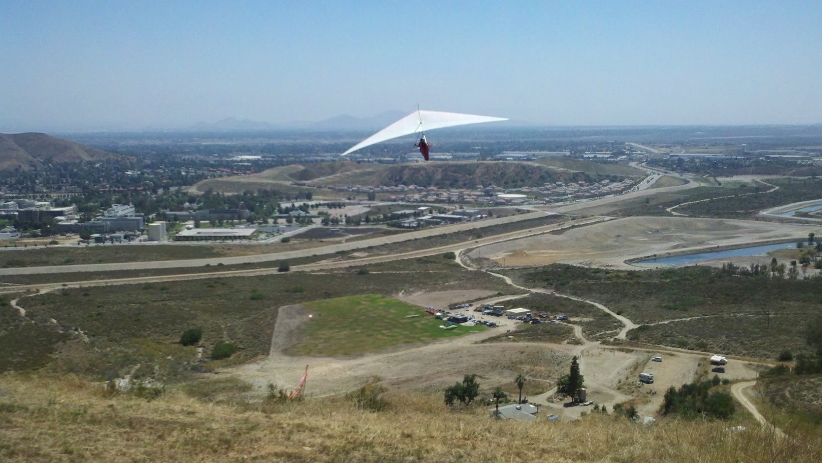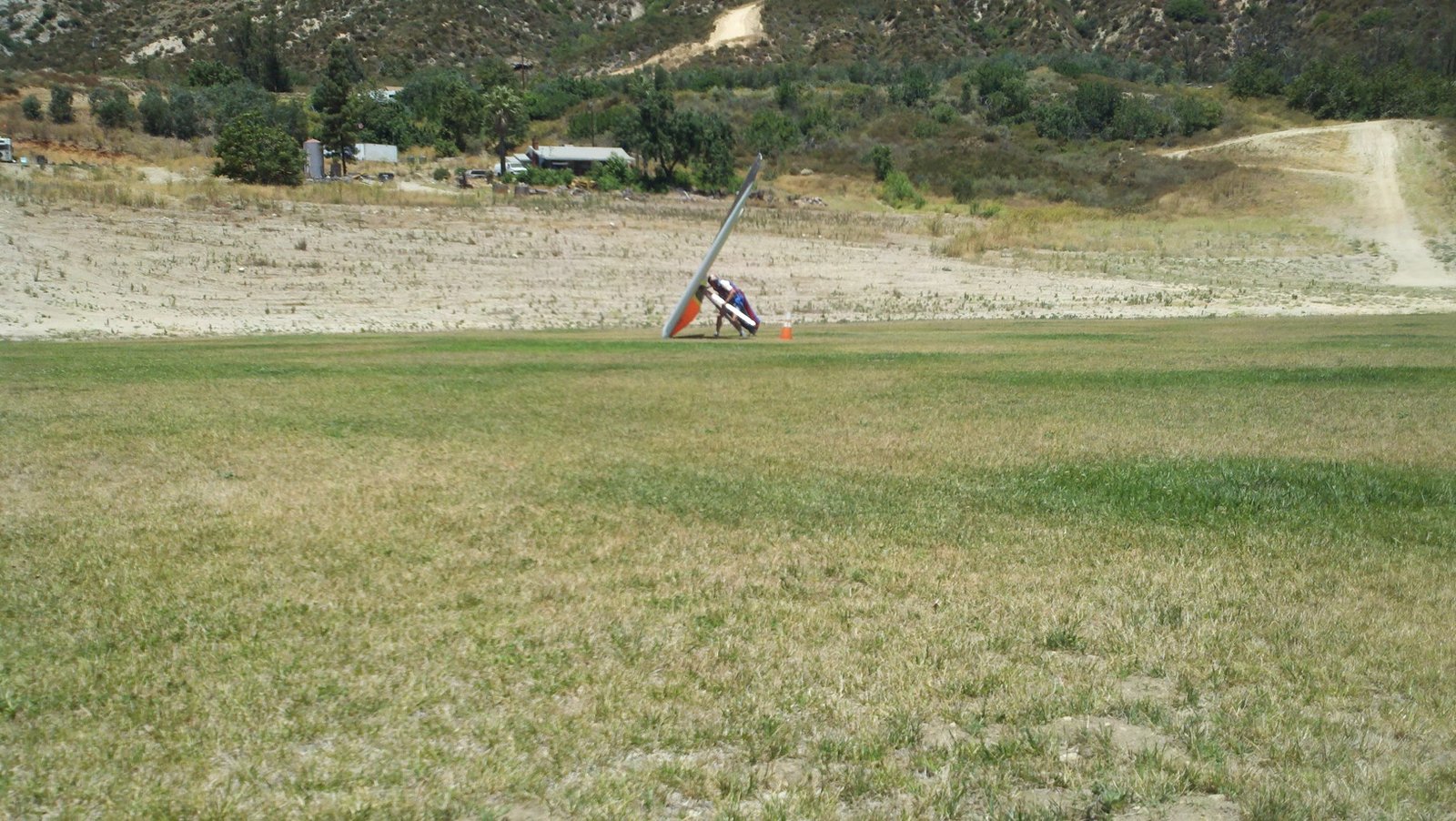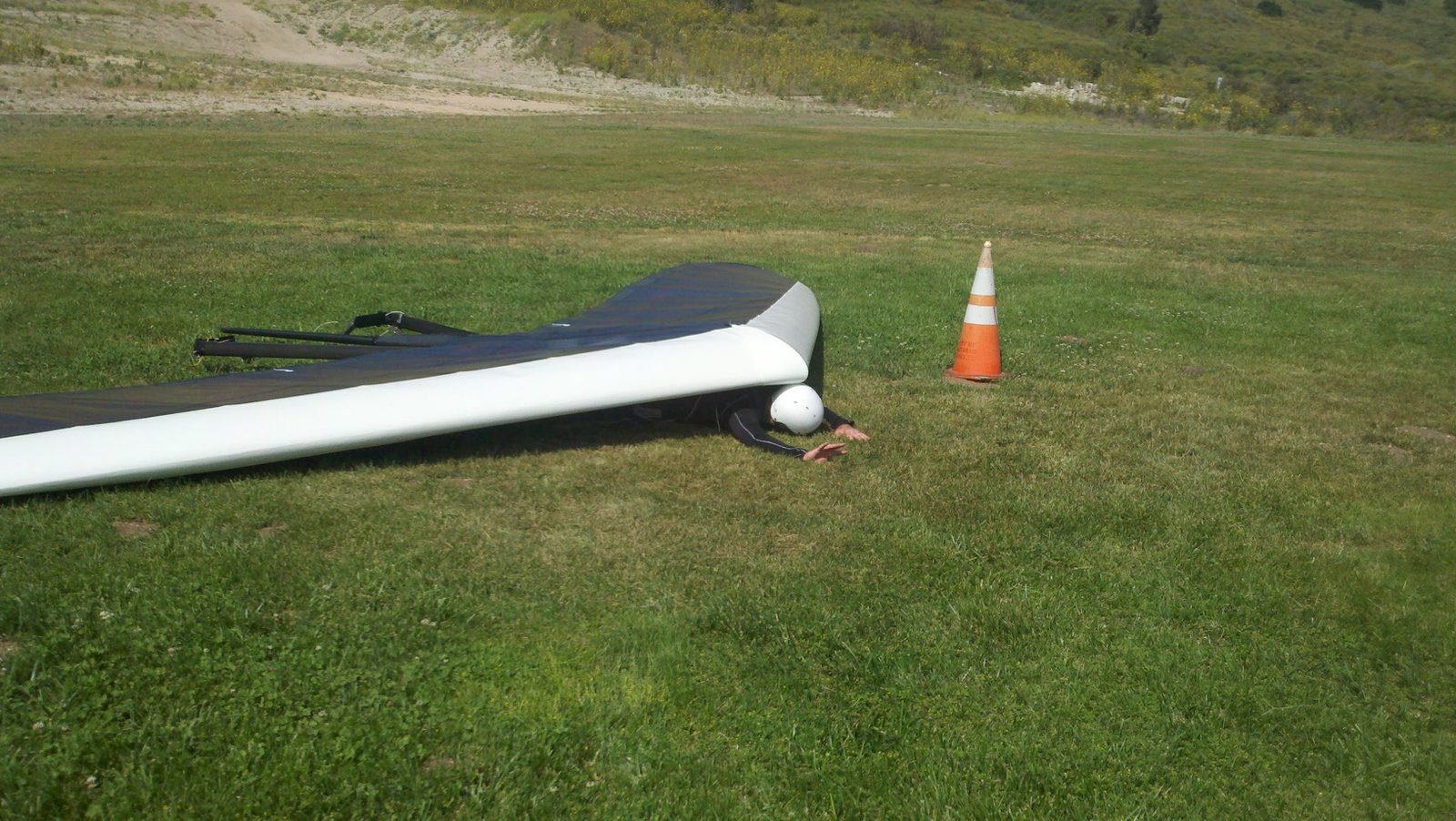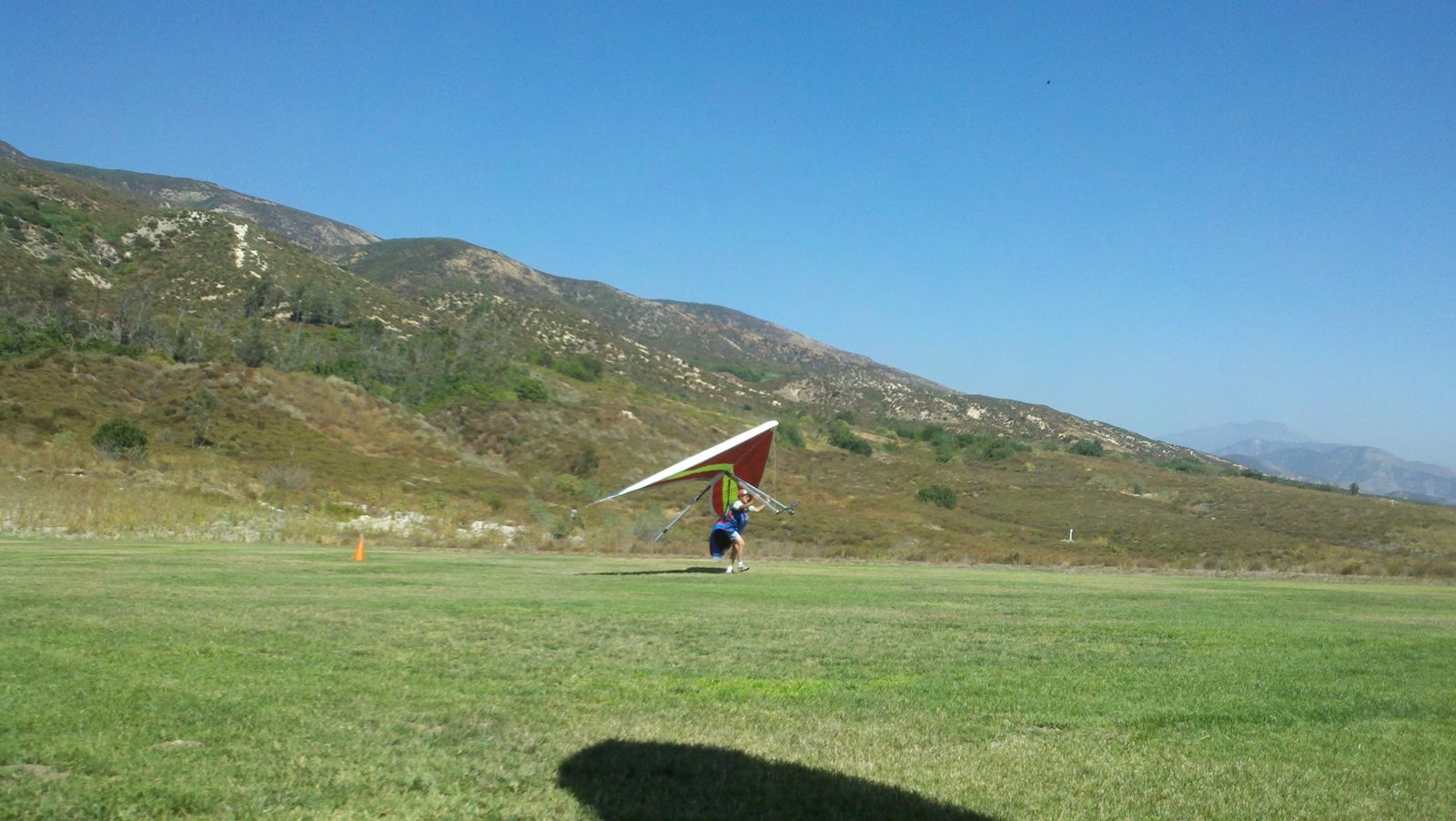 Clear and warm onshore day between Santa Ana episodes. Calm at the LZ and already a steady 5-10 SW at Regionals. Quite soarable. Nosecone wasn't attached so I flew straight to the LZ and landed. I had been ready to start my preflight and stopped to take a couple of pictures first, then re-started the preflight with the hang loop instead of at the nose area. Flew without attaching nosecone. |