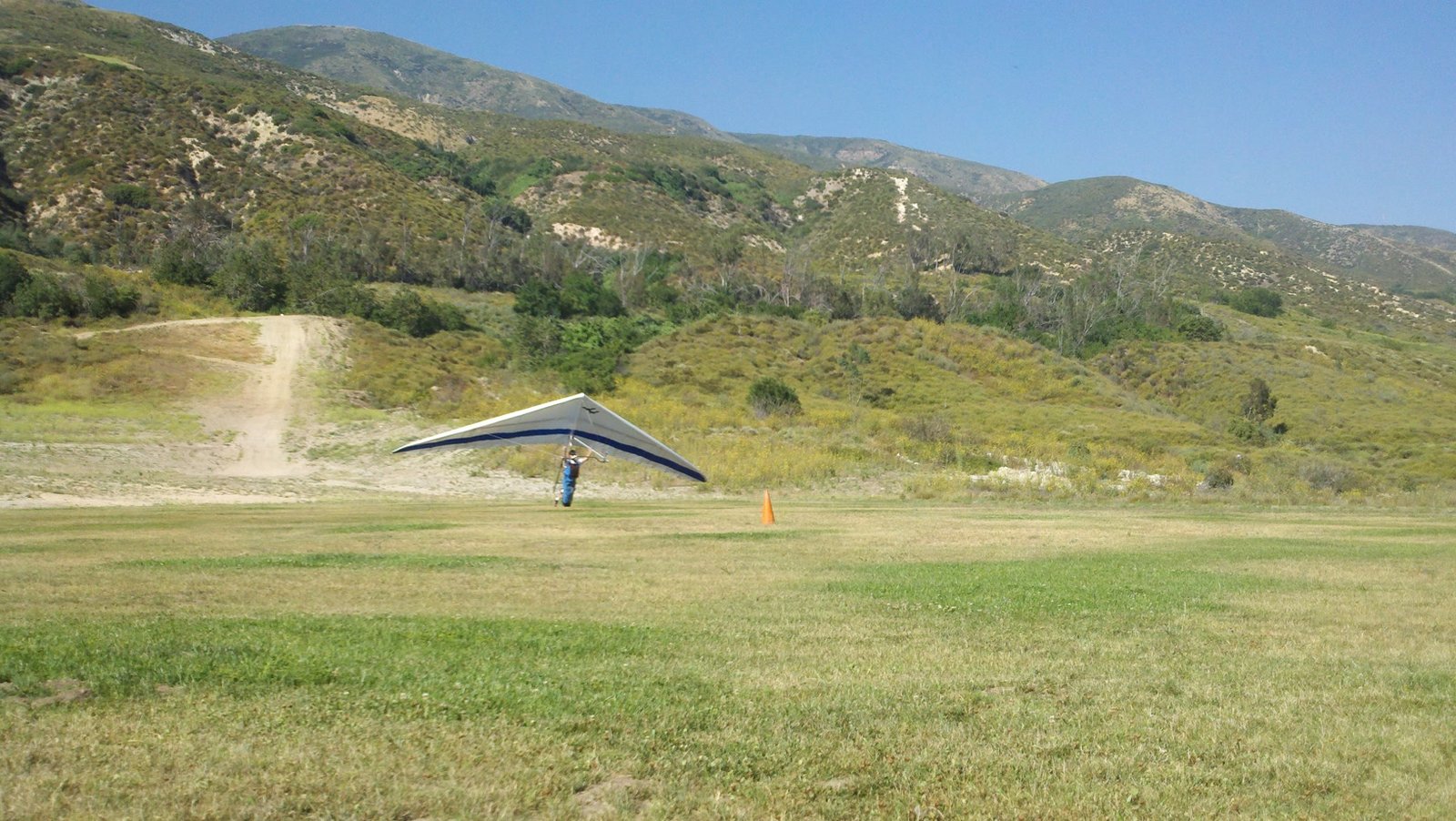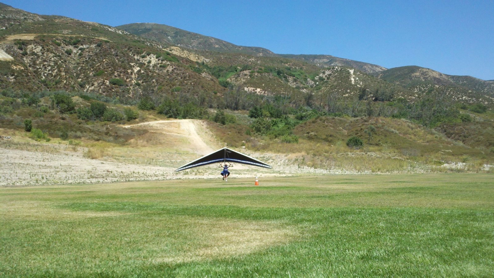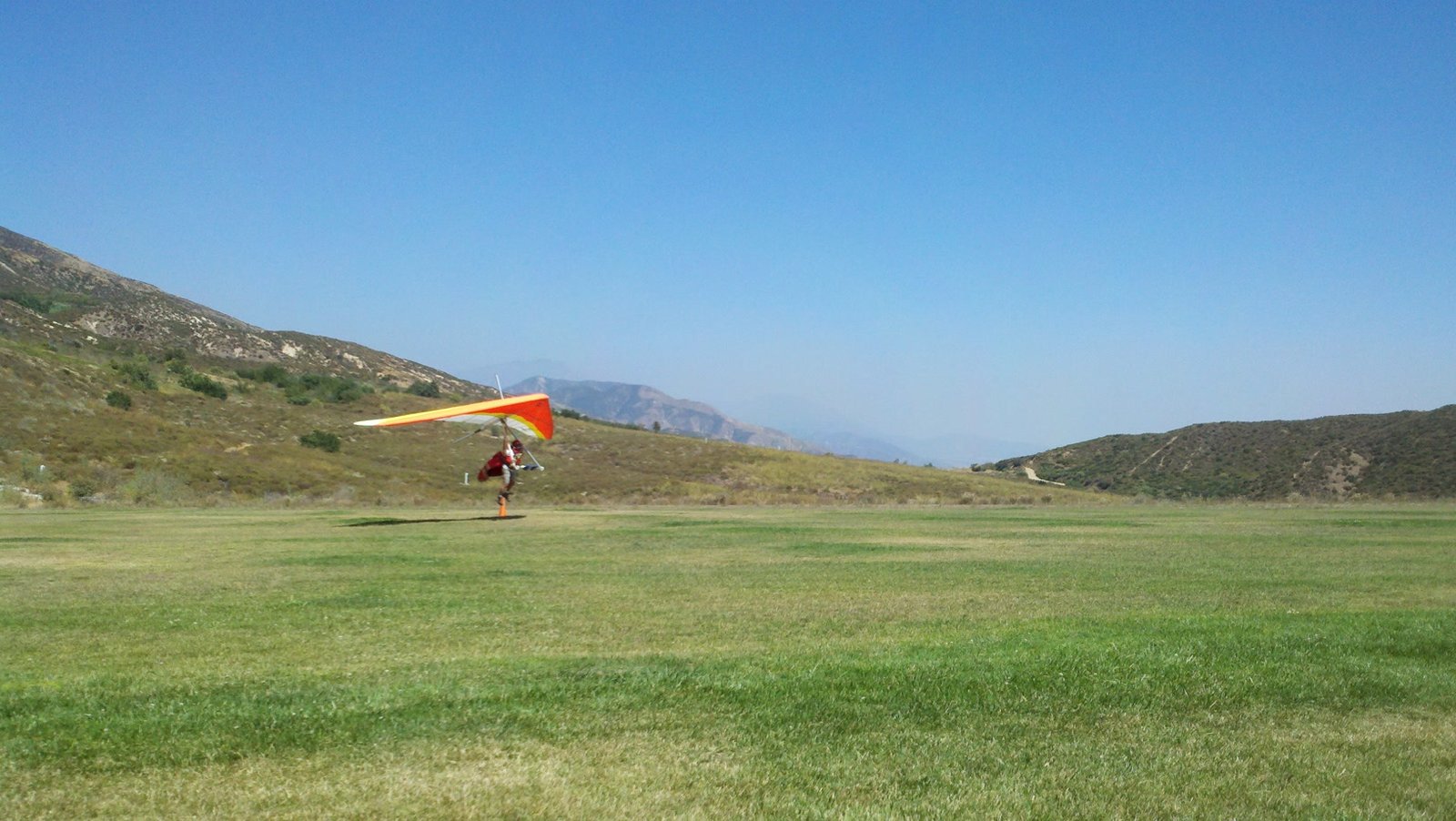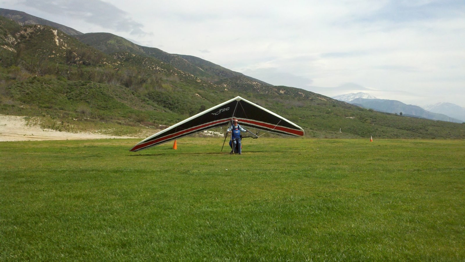 Clear and warm onshore day between Santa Ana episodes. Calm at the LZ and already a steady 5-10 SW at Regionals. Quite soarable. Nosecone wasn't attached so I flew straight to the LZ and landed. I had been ready to start my preflight and stopped to take a couple of pictures first, then re-started the preflight with the hang loop instead of at the nose area. Flew without attaching nosecone. |