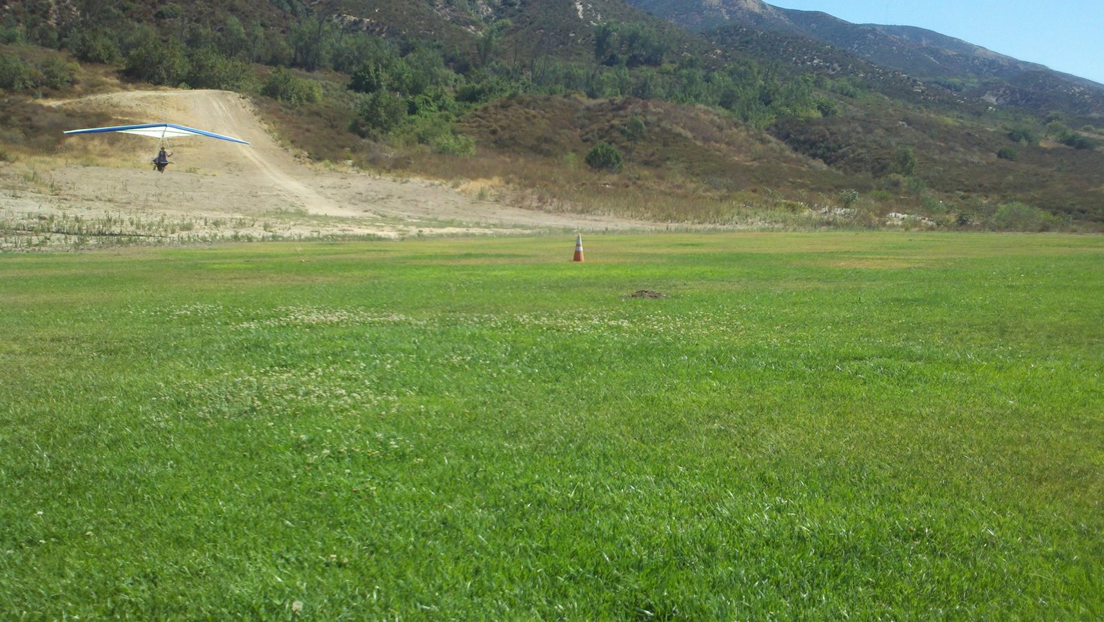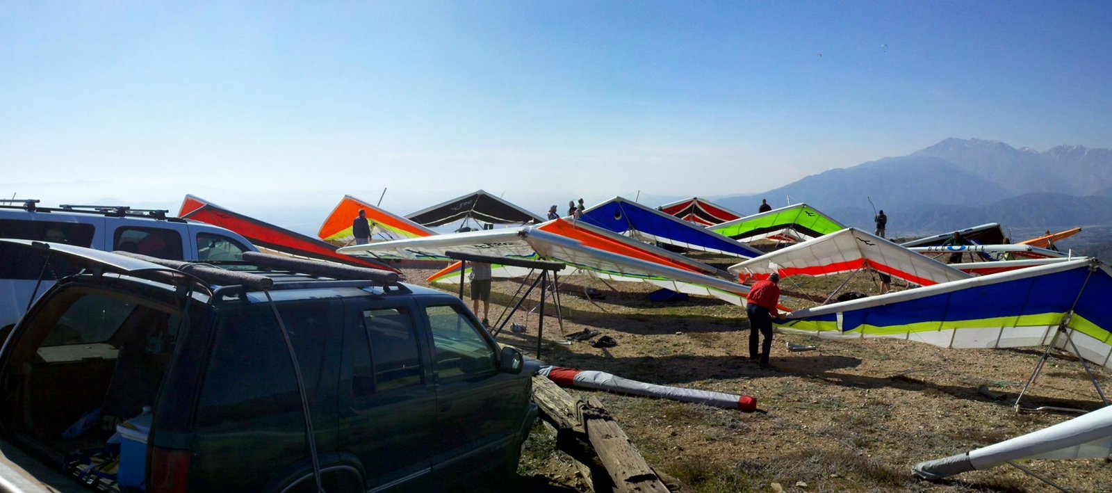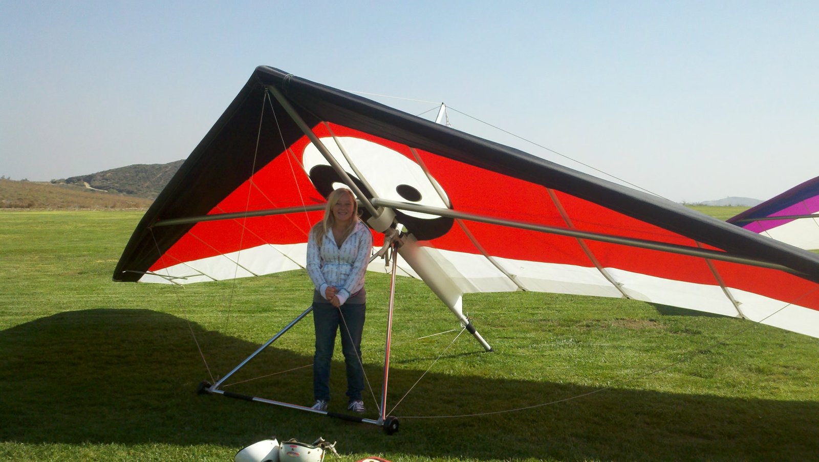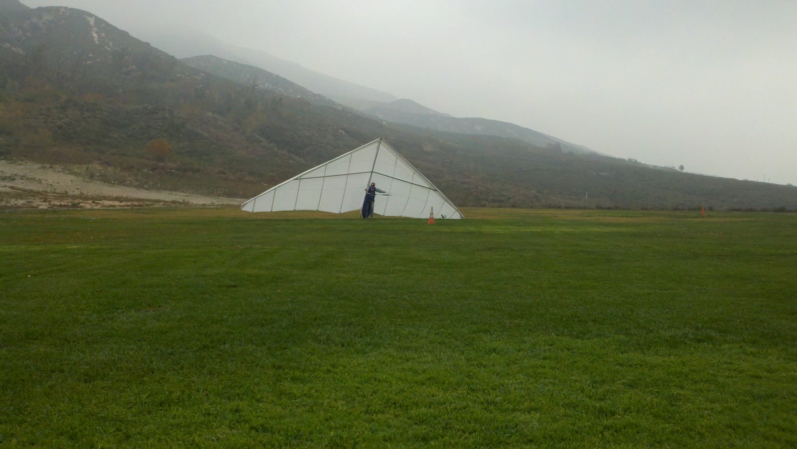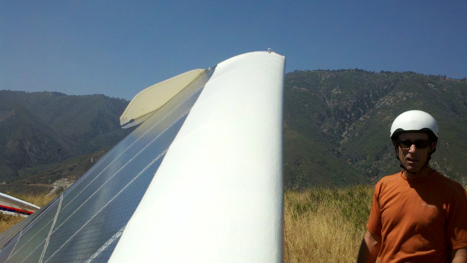 Clear and warm onshore day between Santa Ana episodes. Calm at the LZ and already a steady 5-10 SW at Regionals. Quite soarable. Nosecone wasn't attached so I flew straight to the LZ and landed. I had been ready to start my preflight and stopped to take a couple of pictures first, then re-started the preflight with the hang loop instead of at the nose area. Flew without attaching nosecone. |