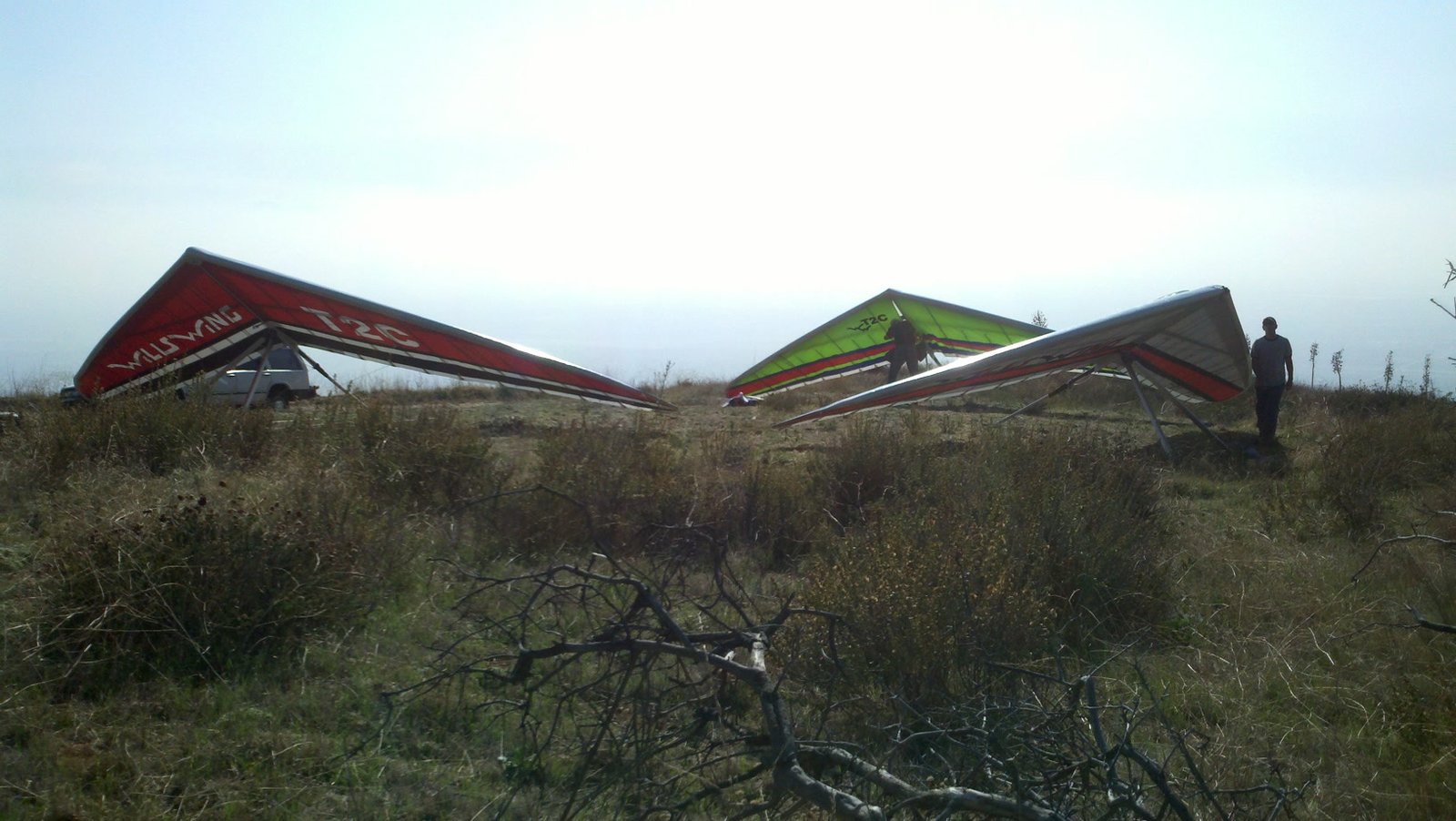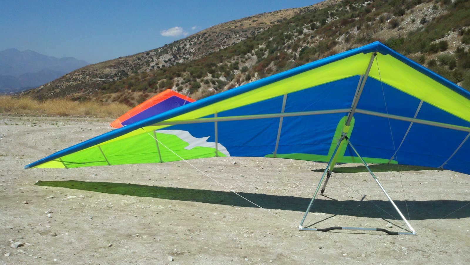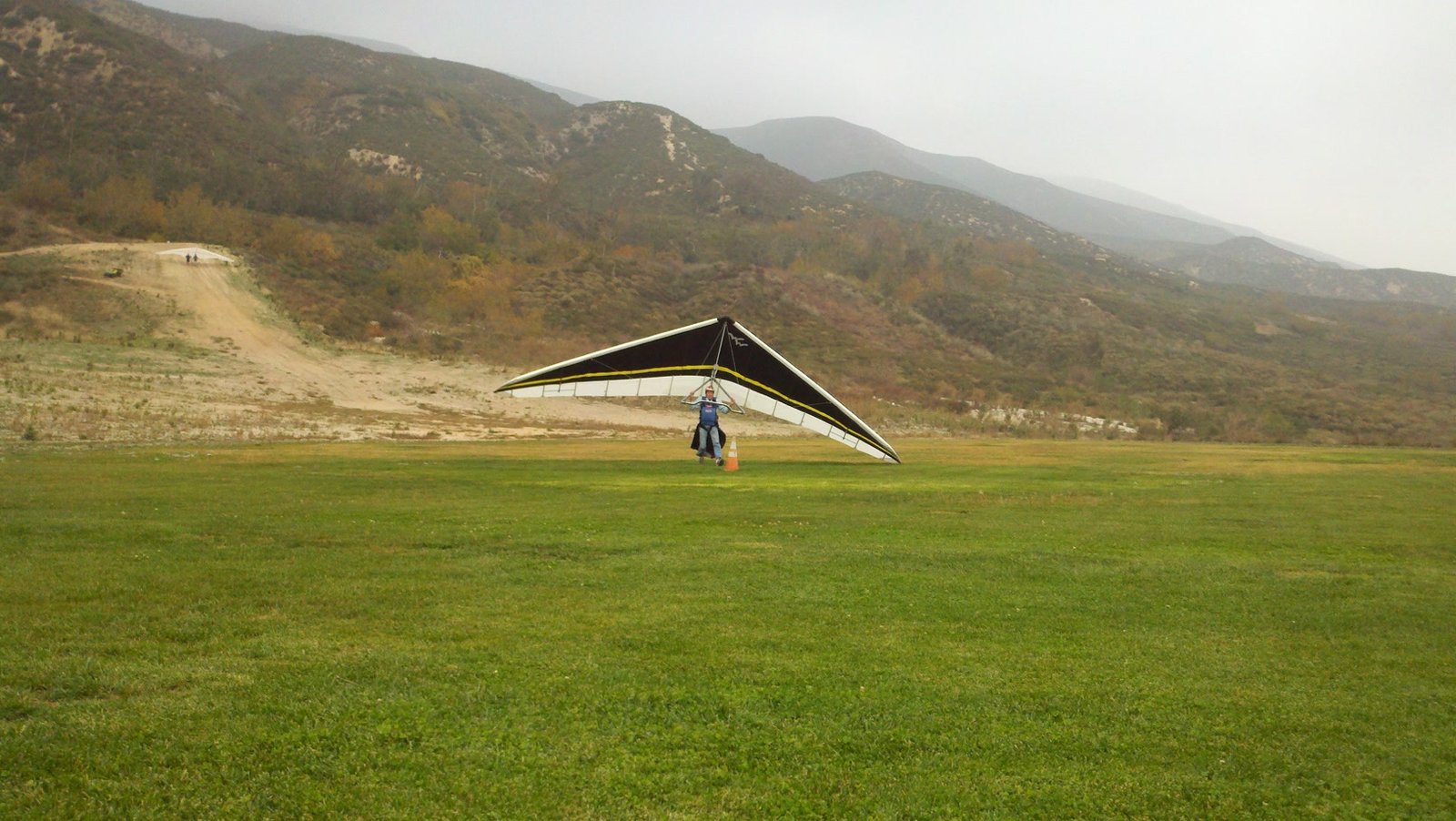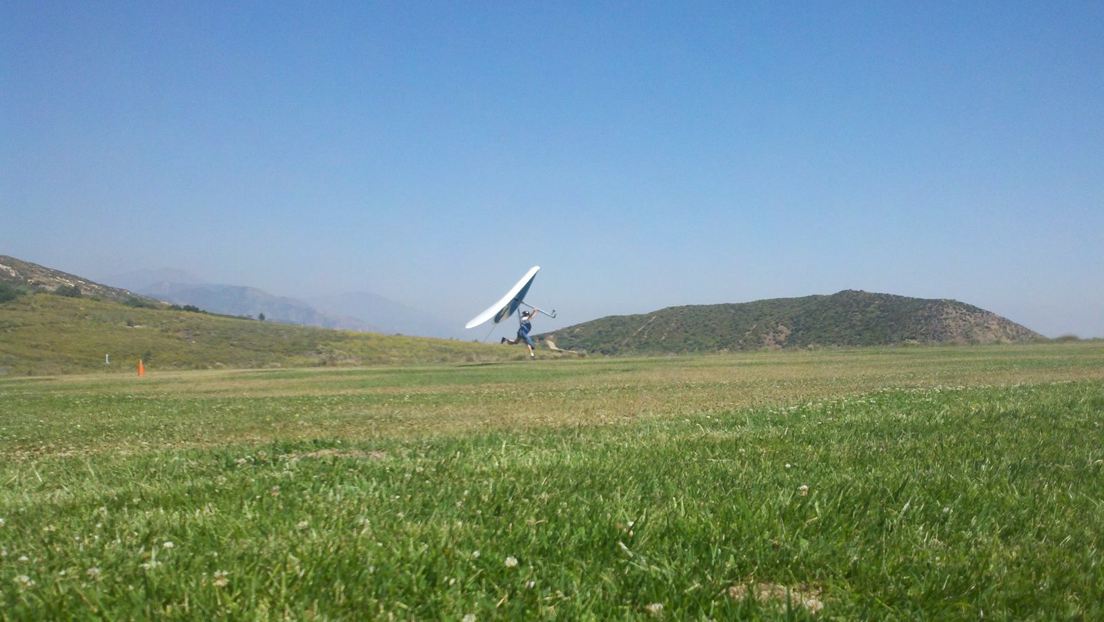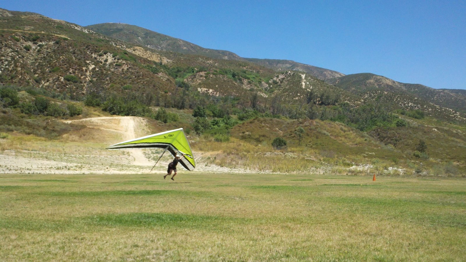 Clear and warm onshore day between Santa Ana episodes. Calm at the LZ and already a steady 5-10 SW at Regionals. Quite soarable. Nosecone wasn't attached so I flew straight to the LZ and landed. I had been ready to start my preflight and stopped to take a couple of pictures first, then re-started the preflight with the hang loop instead of at the nose area. Flew without attaching nosecone. |