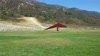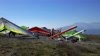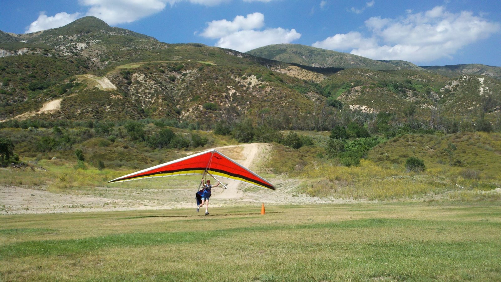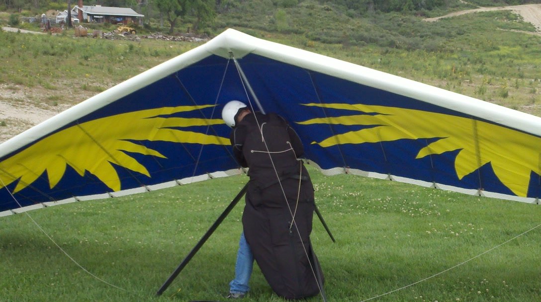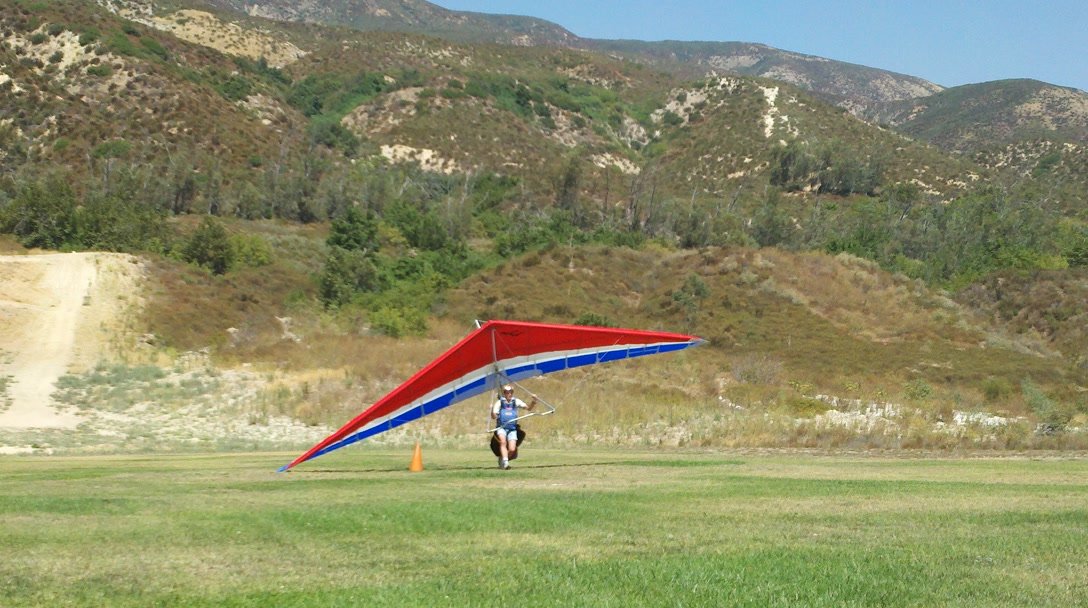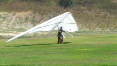 A fine onshore day in SoCal after an extended stretch of offshore winds, so we had a trailer-full of gliders to test. Some of the WW comp pilots happened to be in town, so we got a few more gliders flown per round than usual. Many local and visiting pilots also showed up and got some airtime, making it a fun day. A slightly extnded sledder from Regionals. Did a S final and as I went to flare I dropped just a little. My left foot was trailing and my toe caught on the ground so I was late getting my feet under me. Finished the flare in a joggign crouch and put the basetube on the ground. Good |