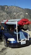 Kinda frontal with chance of rain coming overnight. Blowing 20+ at Crestline. Clouds just above Crestline when I launched Marshall. Windy with thermals and cloudbank shadows out to the freeway. Strong, tight cores with strong sink around them. Got rolled level or more a few times when I drifted to the outside of thermals. Worked close with some other Falcons - Dusty, Jeff B., etc. Cloudbase dropped below Crestline and I climbed to 4,950 with the wispies at my sides. Cold on the elbows with no jacket. Flew out SW to the sunshine, S of the original airpark, and crept up on Joe Weber in a PG. Used him as a turnpoint and found 500+ down all the way to the old Girl Scout camp - I was thinking it'd be pretty crazy to come up short of the LZ! Was torn between flying min-sink (downwind) and fast to get out of the sink. Found lots of lift on the east side of the LZ so I got to pick my cycle and position in the traffic. Glider handled really well even after taking into account the effects of my wing loading. No turns, good stall and dive recovery. Some TE flutter between outboard 4 battens, both sides, at all speeds. Linda Dunn's, after sail-off inspection. Flew well, nice handling, even with my 250 pound hook-in. |
