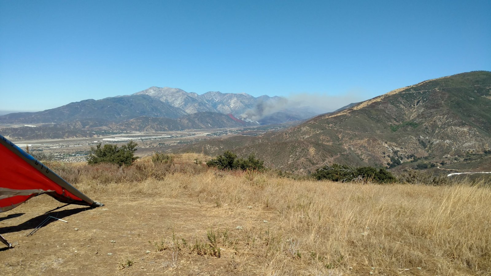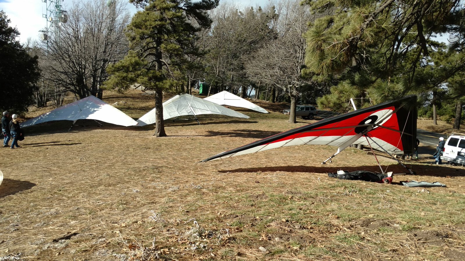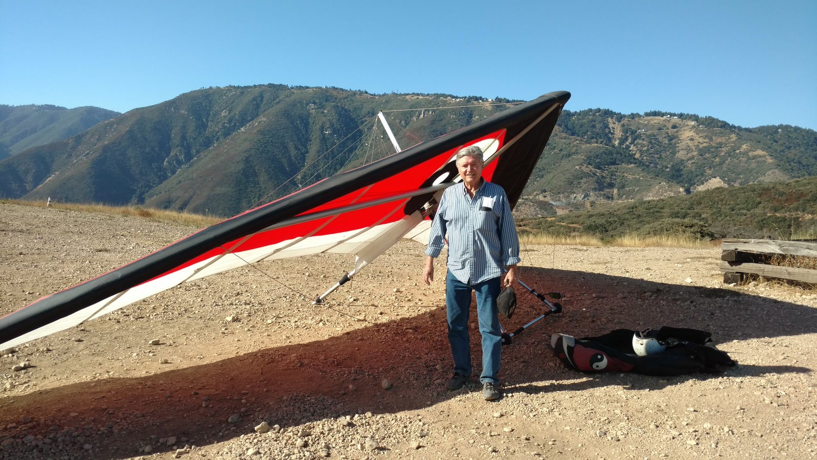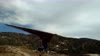 Good. Twisted left tip 1 notch for a very slight right turn. Nice handling overall. Warm post-Santa-Ana day promising good altitudes. Bumpy at ridge level and lift was on and off. Got above Billboard to 6k+ and put my right glove on then sank. Ended up flying for about 1/2 hour with one glove; left hand/arm got a little tired from gripping harder. Got 5.5k from Regionals and went back to Crestline, arriving 5,100. Had to save it in the bowl in front of launch. Billboard still not great and thought about landing (40 minutes) but got a great thermal above the water tank to 6k. Put both gloves on. Went to Pine and climbed to 8k next to a racy PG. We went west toward Sugarpine; felt like a headwind. Still not beaming up and had sink alarm over the peak so I went back to Pine then Regionals. Did some speed runs to get low but didn't sink much. Wingovers near the 750 (Dusty, Gene, Nate waiting to launch) then it to the LZ. Saw zero wind and found lift SW of the Ranch so I was able to wait for wind. Good SSW 7 to land into. Got lifted near the cone, didn't go to basetube so I went s good way past. Nice one-stepper photographed by Dave Aldrich. Many had gone east with big hopes but came back relatively early; some saw 9k. Owen went to San Gorgonio and back. |