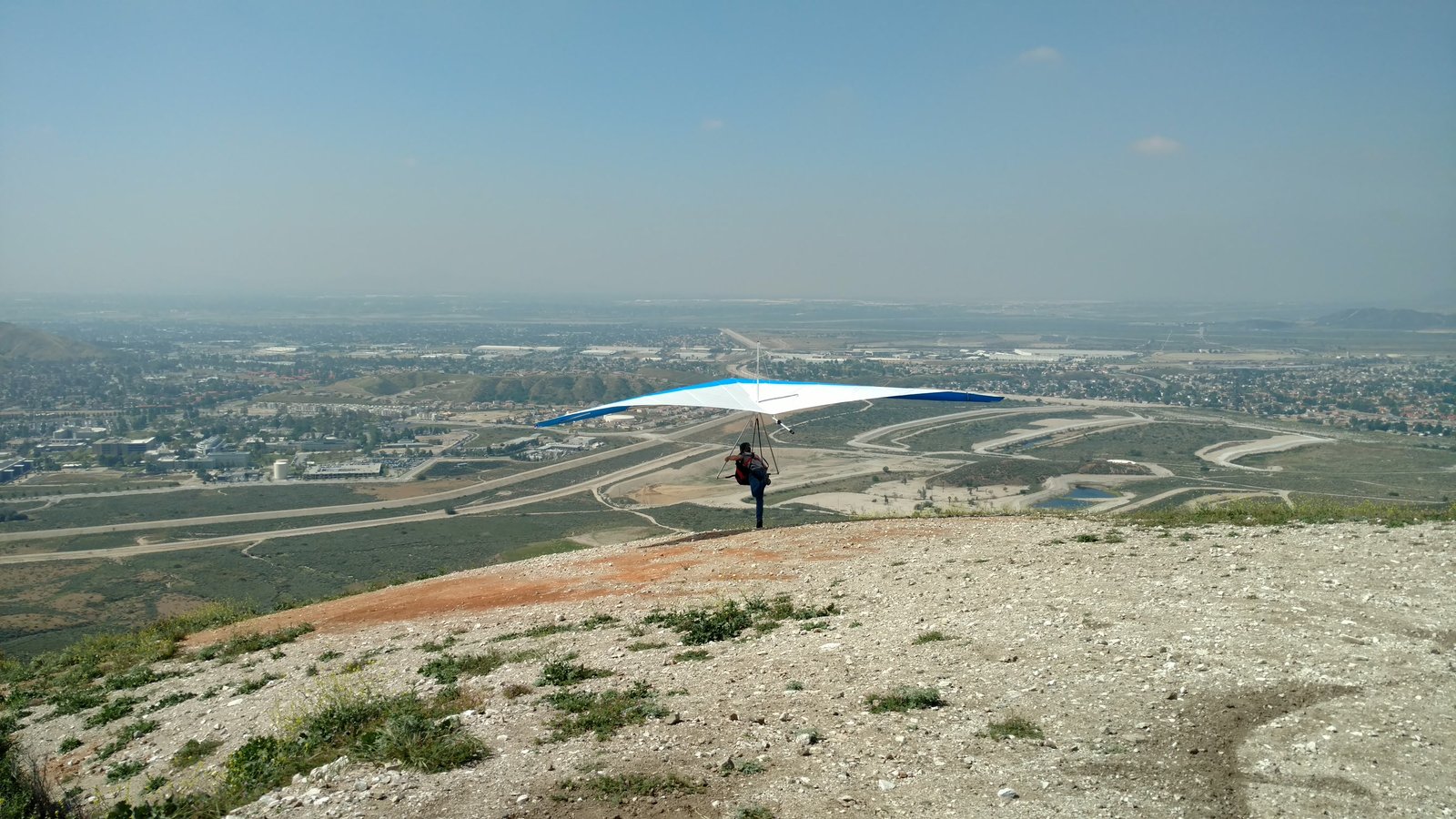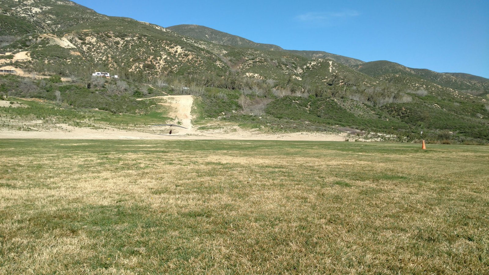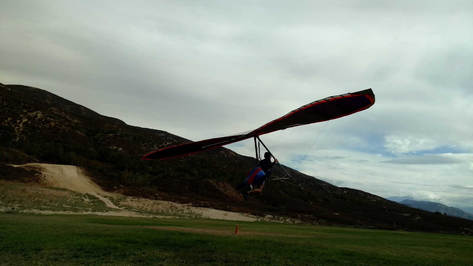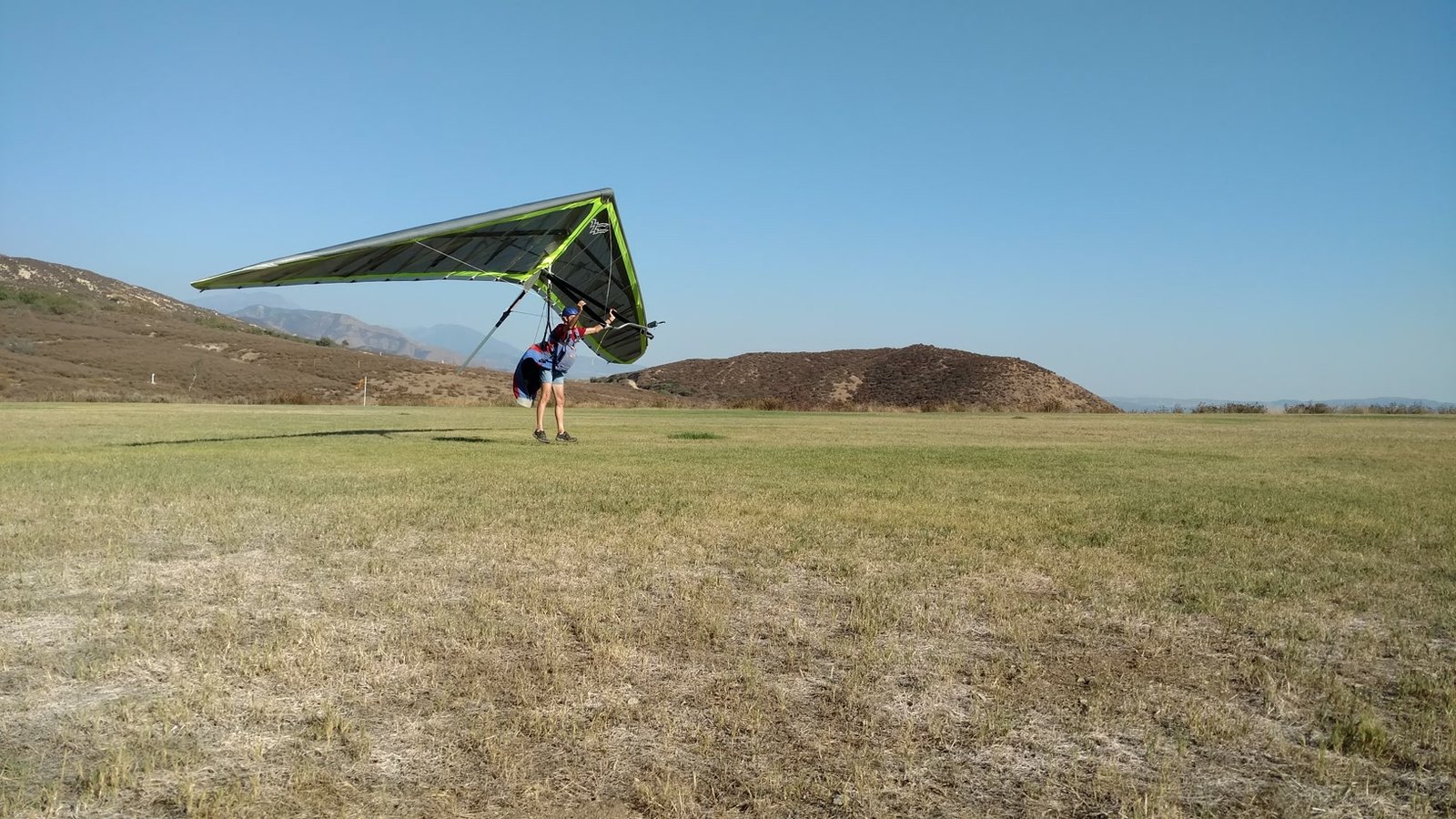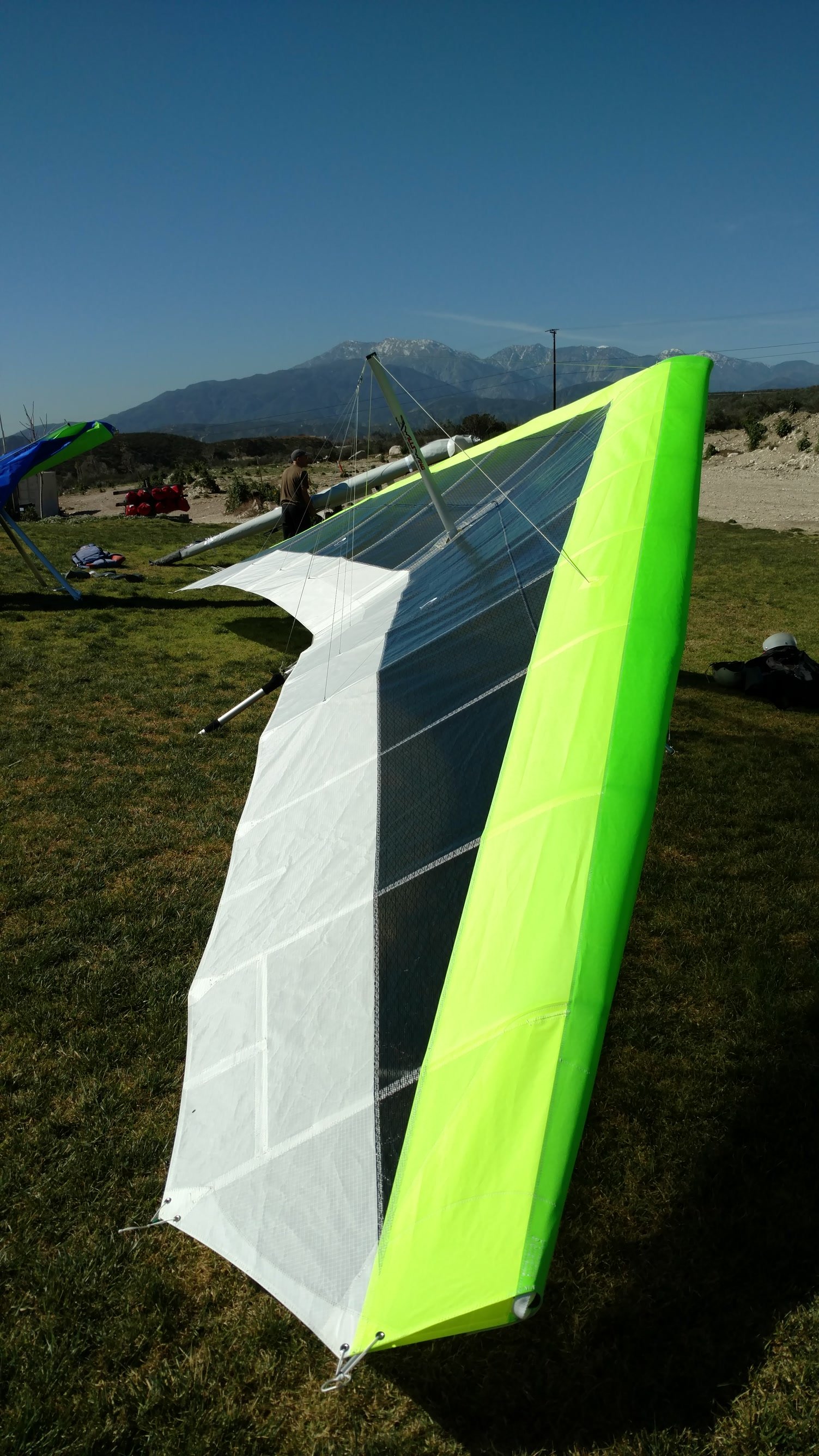 Great. No trim change over VG range. Clear and warm. Pre-frontal, rain expected after 4 p.m. Already steady SE at Crestline and Marshall, over 15 MPH. Almost ridge soarable SW of Regionals. Still steady east 400 AGL at the LZ. Calm S on the ground. Good landing 20 feet short of HG cone. |