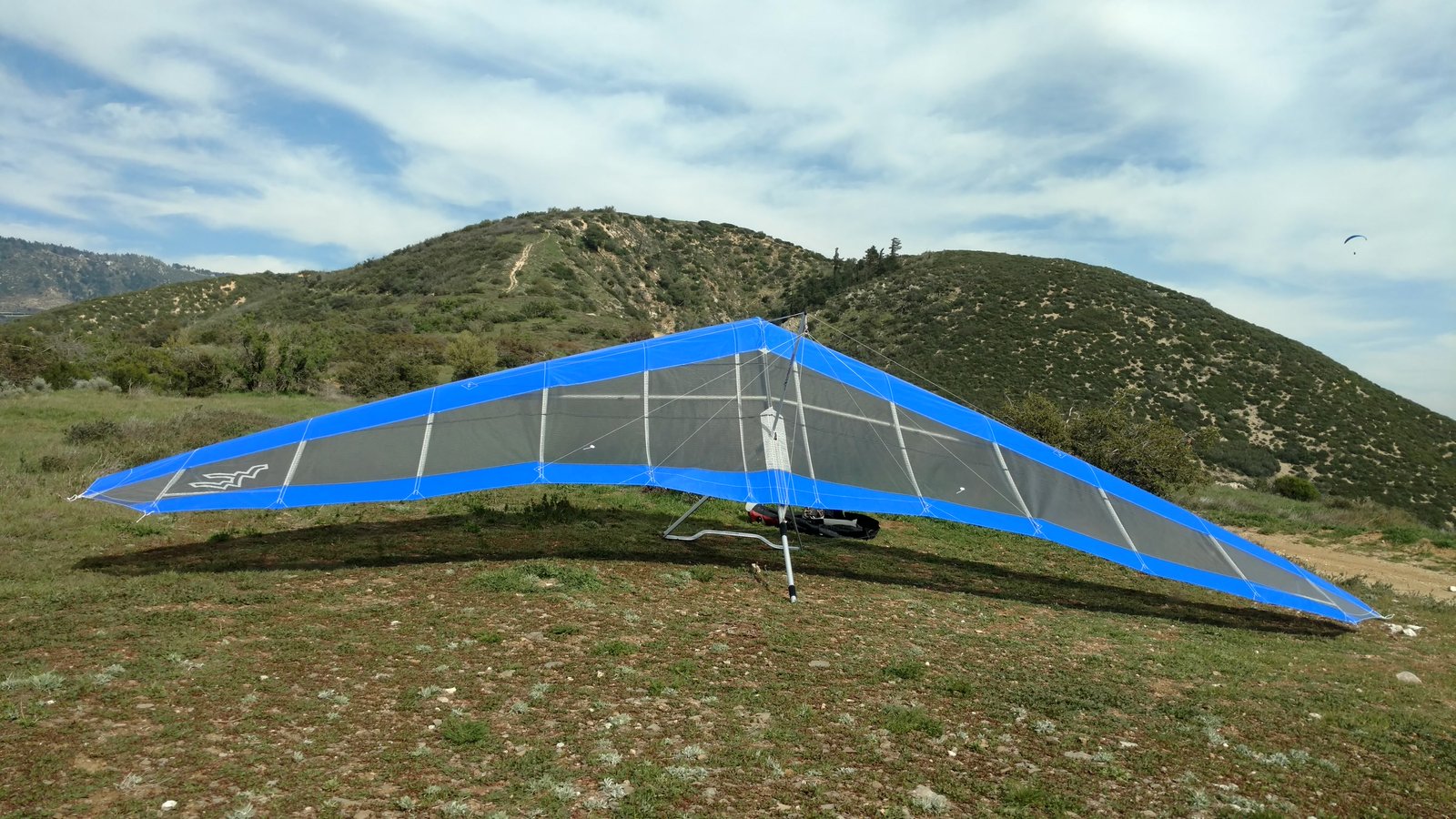 Reflight with modified (additional) reflex in battens 8-10 to see if it reduces transient trim. Launched into ridge lift at Crestline and went VGT right away. TT to 30, pitch pressure normal. Did a couple of wingovers and popped the #6 and 7 on the left wing and #6 on the right; TT reduced to 24. Pretty much identical to when I flew it the other day with regular battens. Should have flown longer before doing wingovers. Popped battens did not back out of pockets, no change in glider feel. Got up at Billboard thermalling close with Mark Hoffman (on his U2 160 that I had put the leading edges back into that morning; nose bolt holes rebushed) and two others. Fast run to Pine then slow mosey out front. Another core at Regionals was hard to track through 5k and then easy to 5.7k. Flew straight at Crestline launch kinda fast. GoPro on keel ran out of juice at that point (used an hour for tandem earlier). Flew back out front and around a little then to the LZ for a nice landing into SSW 8 about ten feet short of the HG cone. |