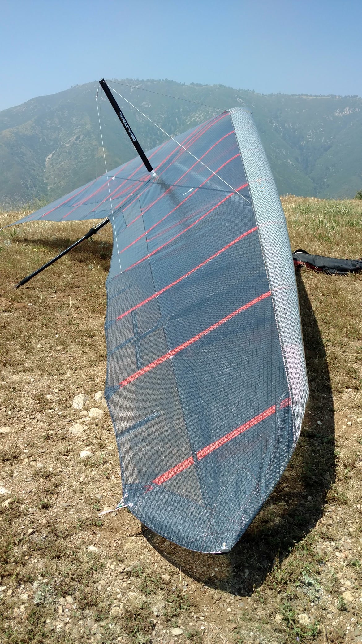 Very nice. VdVGT=58, Vt=22,24,21. Blowing 15+ at launch, I stood with the nose way down for a minute or two then launched and elevatored up 100 feet. Low ground speed looking for a thermal, got a nice 500 FPM chore that I decided to ride up to 5k. Still strong and solid halfway back to Crestline I got to 6k in two minutes. Flew out over the valley looking for sink; lift everywhere. Great no-stepperinto steady SW 15. These all Dacron S2's and U2's have consistently gong a couple of MPH faster in Vd than the Mylar versions. Great handling. |