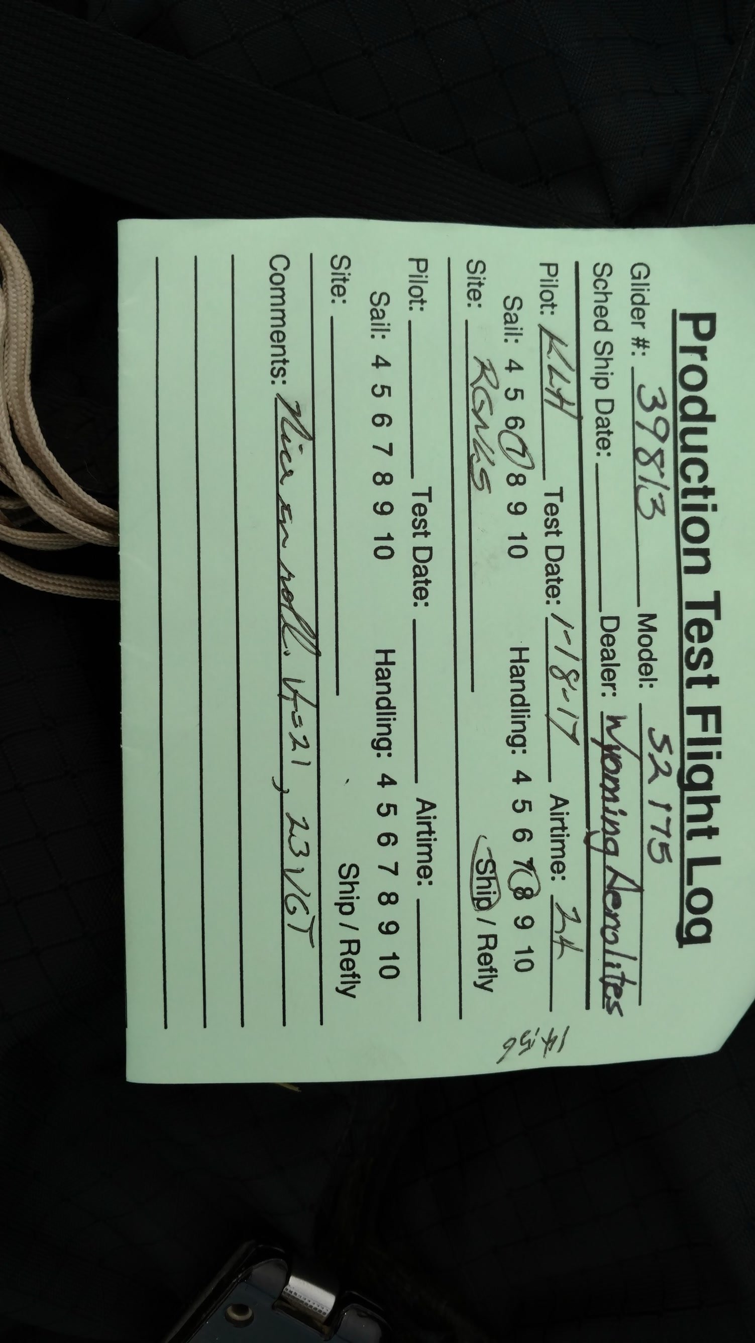 Nice handling. VdVGT=58. Trim nominal. 20+ S at launch. Bumpy in the air. 72 MPH groundspeed flying NE over the LZ. Good landing over fifty feet short of the PG cone. |