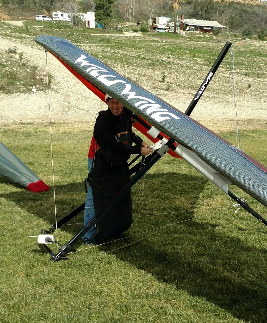 Hazy and cool with light onshore flow, inversion about Crestline height.SP had shimmed bridles 1 inch and raised sprogs 1 or 1.5 turns. Friday I replaced the too-short transverse battens with ones that actually passed under the aluminum battens. Handling still very nice. A couple of pounds more pitch pressure per hand with the bar at mid- to all-the-way stuffed. Vt=23 with the interesting feature that VtVGT was 21.5-22. Both sprog cables slack (drooping) at trim VGT; approaching VdVGT they would straighten out but didn't go tight. Vt 1-2 MPH faster in turns but not really different in feel than most other gliders. Pushing out to crank and bank in a couple of strong narrow cores close to the slope was very comfortable and the climb was great. Biggest thing I noticed this flight was that when VGT I could initiate and hold a spin much more easily than with a Sport 2 155. VGL it did not spin for me at all. |