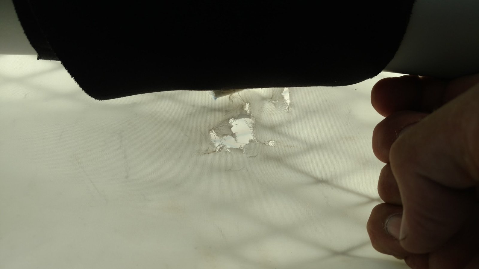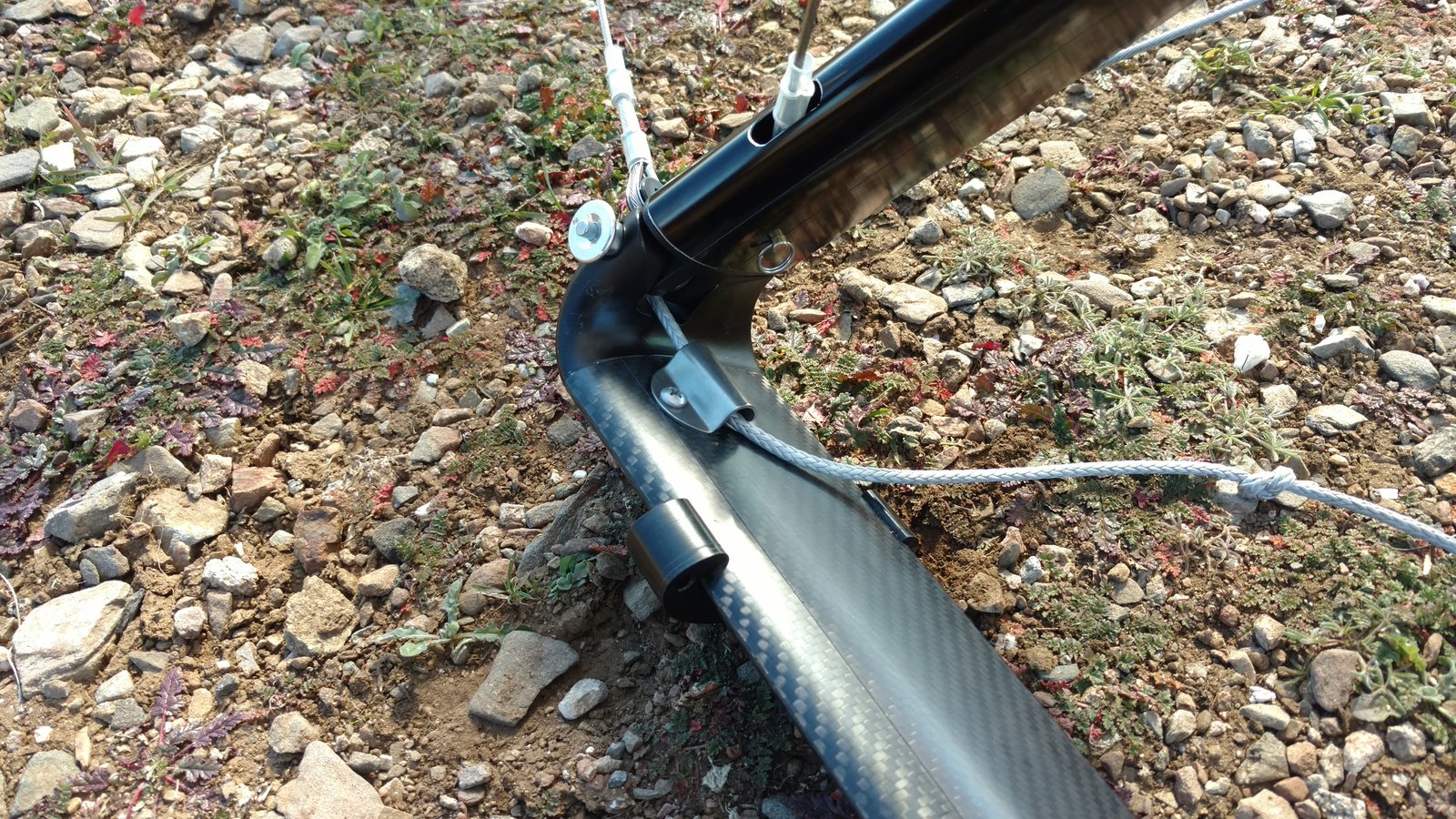 Had trouble getting the right tip wand in (as I did at the shop). Looked inside and saw that the wand cup was at the back of the LE. From now on I will put the wands in when prepping Sport and U2 frames. Decided to fly it anyway since I'd flown a glider like that before. Glider had the equivalent of a 2-hole left turn, primarily when thermalling. Roll response was nice, like a sweet Dacron S2. VT=23-25 so maybe try the aft KP hole. PP good VdVGT (53 MPH). No TT, no BS rumble. The tip wand error probably accounts for the large wrinkle on the TS of the right tip. Right sprog cable went tight at VG3/4; Left sprog cable didn't go tight at all. Tip flutter VdVGT, mild on the left, a lot on the right. Replace RT RLE or reinstall wand receptacle. |