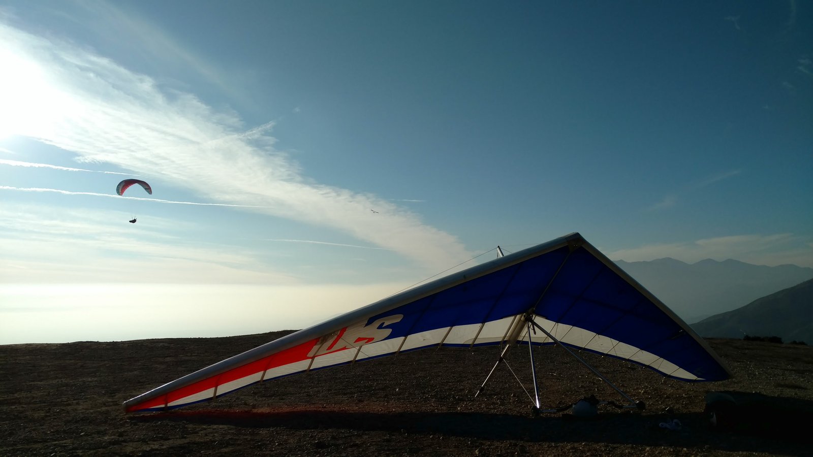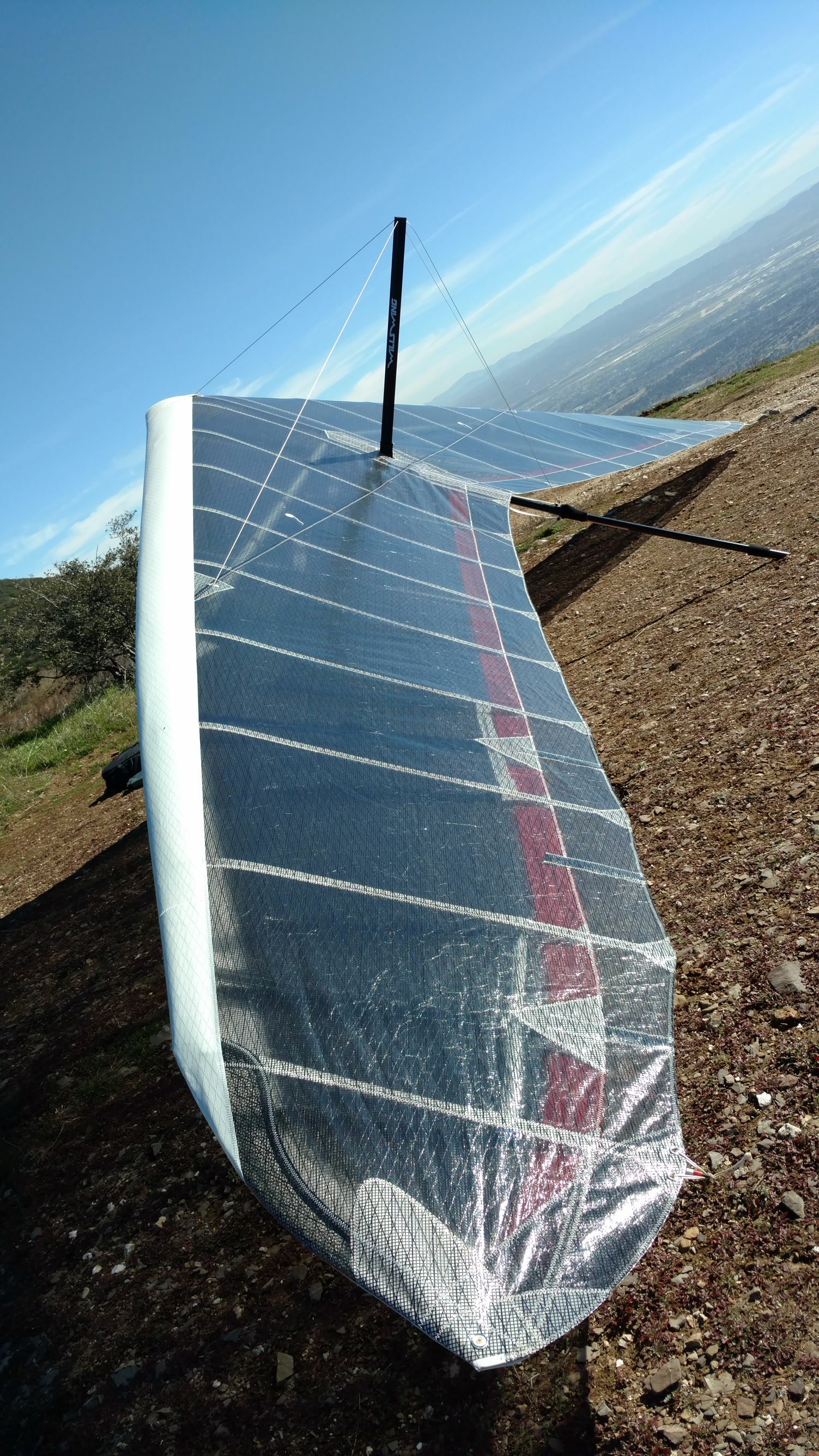Good. Light winds and a low inversion layer, not as hot as it's been. It all added up to small thermals bumping against the inversion layer 500 feet above the peak. Had to bank hard and push out to stay in the little rodeo cores. Got 500 feet below launch once, briefly. Test flying a Wills Wing Falcon 4 170. Nobody else was flying so I didn't want to land in the valley and try to cadge a ride up to get my truck. Thus I didn't venture very far from the peak. Good to landing, trotted out out - small wing, little wind. GoPro at left xbar junction. Made a 3-minute video of my flight. |