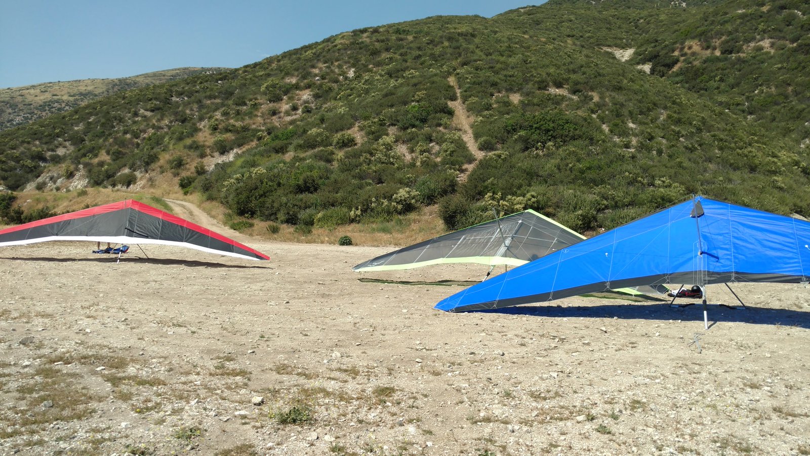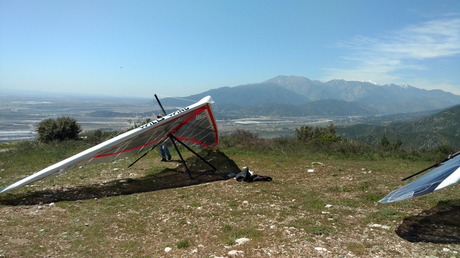 Good. Hot and muggy, last day of a monsoon pattern. Thermals near the hill, coming from SE. Hard to really settle in and circle in the thermals. Had the GoPro on the keel, flew low over Steve at launch. Donde in to get a good SW cycle at the LZ, did a right-hand approach for the heck of it. Overshot the PG cone by fifty feet. Found a stolen purse with keys and a USB stick, other stuff but no ID, on Devil Canyon Road where the dirt road meets it. Looked like it had been tossed from a moving car. Turned it in at CSUSB campus security after we were done flying. |