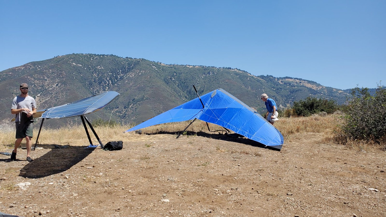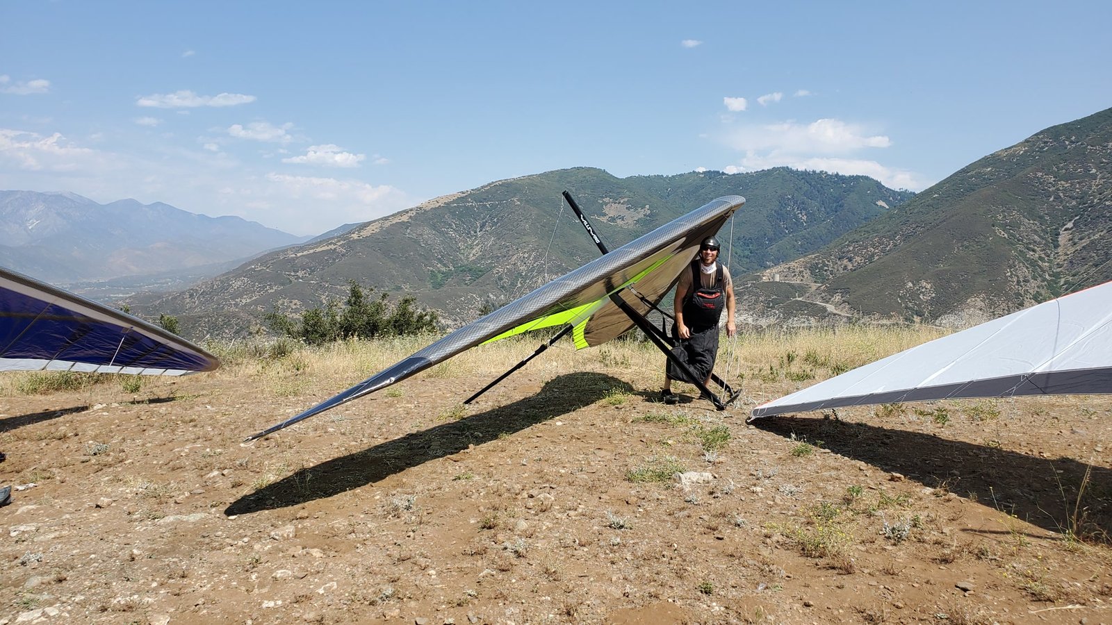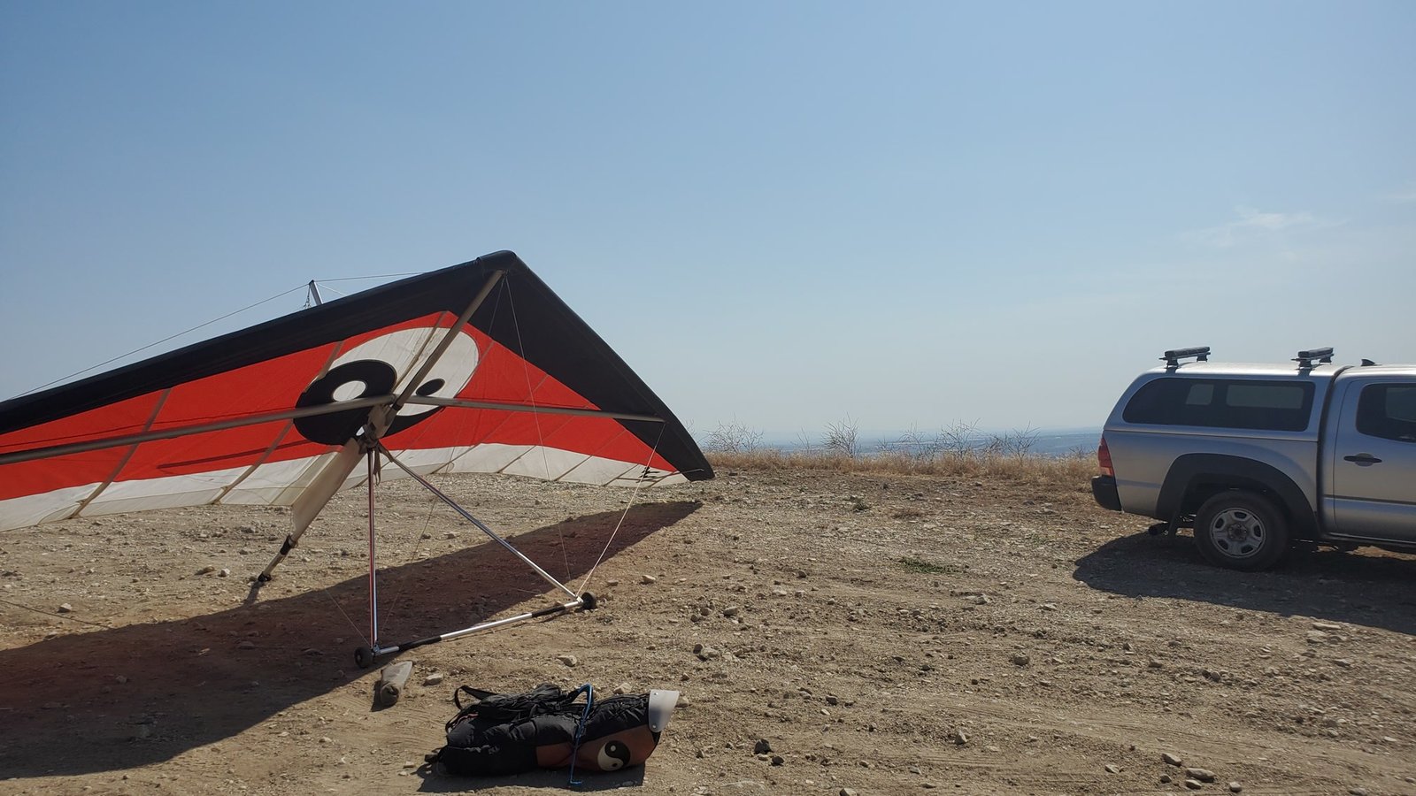 Nice breeze at launch, barely paused after walking over. Turbulent line near Last Chance but circling didn't work. Similar above the 750. Getting rolled toward the hill but nothing there when I'd turn and fly back through. Scratched what felt like dust devils below the 750 for a while to maintain altitude overall but much work and many dumps hillward. Bumpy approach and overshot cone in lift but good flare and landing. At least 100 degrees F and the sun was brutal breaking the gliders down.
