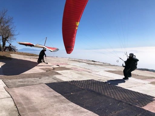Sunny, warm, cycles 10 mph SSE-SW. No GPS. Inflated 3/4 of the way up from the ramp area. Got barely airborne after a few steps, skimmed about 50', then had to run again. Ran all the way down to the drop-off by the ramp and down that slope a few feet when the wing collapsed. I was even with the bottom of the ramp and the wing was to my right in a clear patch. Gathered it up, lumbered over to the ramp and up the ramp. Slipped once when I trod on the wing, slid down a couple of feet. Got near the top of the ramp and a visiting pilot helped with the wing. I took off the harness and made a few feet before I had to collapse on my back, out of breath and woozy. Told him to just drop my gear right there but he took it up to my original launch spot. Watched a couple of Marcello's students launch until I was breathing normally and then stood up. Marcello came over and agreed that I was running plenty fast. He supported my hypothesis that the wing had bad porosity or something, which I've been suspecting due to all the skimming launches and blown launches. I walked up and spread out my wing and lines. Good inflation, ran a little way before lifting off a few feet and skimming the rest of the way to the drop-off. More comfortable but still too low. In the air I was tired and thought about just going and landing. Went to below Cloud Peak and scratched up to the top pretty slowly, still feeling a little ragged. Settled in and thermalled with the gaggle, decided to go for one hour airtime. Several cores sounded like over 1k FPM up as I traversed the cores, but mostly it was just 200 FPM or so. Overflew UM and did the Cloud Peak climb again then went west. Watched two deer ambling on the road below Regionals; watched them for several minutes. Went to the Afterbay hills from 4,400 MSL; turned back from the tops at 3,900. Lost a lot going back across Devil Canyon so bee-lined for the 350 launch area. Got there with a couple of hundred over and was able to scratch for a few passes. Saw higher traffic coming down so I went and landed for traffic flow. Pulled brakes hard at touchdown but hit on my butt pretty hard (no spinal jolt) 8' from the PG cone. 50 minutes airtime. Observers noted that it didn't seem to do much when I pulled the brakes. Again I talked with Marcello a bit and he supported the porosity issue even more. At least 20 pilots out grabbing the good weather (rainy days before). I don't want to fly the Buzz 4 again; too many close calls. Made arrangements for a replacement wing that night. Alta XL, 23 days shipping quoted. |