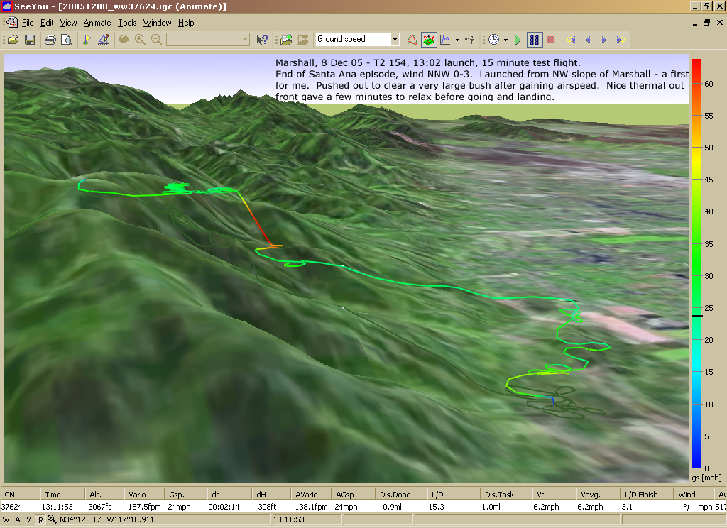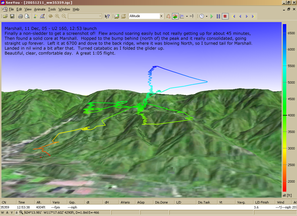 These images are based on screenshots of some of my hang glider flights as depicted with Naviter's SeeYou gliding software. GPS is a Garmin Geko 201 that I turn on and throw in a harness pocket (started using it October 2005).